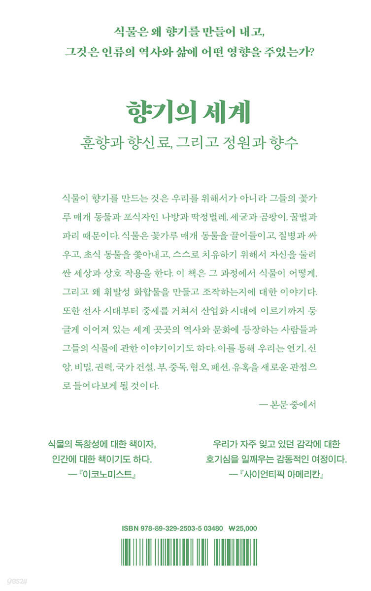 그것은 인류의 역사와 삶에 어떤 영향을 주었는가? 식물의 자연사와 인류의 문화사를 넘나드는 매혹적이고 경이로운 이야기 인간과 식물은 함께 향기로운 이야기를 만들어 왔다. 인간 역사의 거의 대부분 동안 식물은 약이었고, 좋은 향기는 선한 힘이었다. 그리고 인간은 향기로운 식물을 가치 있는 것으로 귀히 여겨 왔다. 우리는 그런 식물을 연고로 쓰기 위해서 기름과 함께 으깼고, 종교 의식을 위해서 나무와 수지를 태웠고, 황금이나 목숨과 맞바꾸어 향신료로 쓸 향기로운 씨앗을 얻었고, 새로운 종류의 향기로운 식물을 찾기 위해서 세계를 여행했고, 죽은 이를 추모하기 위해 꽃을 놓았고, 다양한 정원에서 꽃을 가꾸었고, 열과 증기로 그 향기를 추출했고, 산업을 지탱해 줄 향기 분자를 발견했다. 하지만 식물이 향기를 만드는 것은 우리를 위해서가 아니라 그들의 꽃가루 매개 동물과 포식자인 나방과 딱정벌레, 세균과 곰팡이, 꿀벌과 파리 때문이다. 식물은 꽃가루 매개 동물을 끌어들이고, 질병과 싸우고, 초식 동물을 쫓아내고, 스스로 치유하기 위해서 자신을 둘러싼 세상과 상호 작용을 한다. 이 책은 그 과정에서 식물이 어떻게, 그리고 왜 휘발성 화합물을 만들고 조작하는지에 대한 이야기다. 또한 선사 시대부터 중세를 거쳐서 산업화 시대에 이르기까지 둥글게 이어져 있는 세계 곳곳의 역사와 문화에 등장하는 사람들과 그들의 식물에 관한 이야기이기도 하다. 이를 통해 우리는 연기, 신앙, 비밀, 권력, 국가 건설, 부, 중독, 혐오, 패션, 유혹을 새로운 관점으로 들여다보게 된다. 향기의 세계 ― 훈향과 향신료, 그리고 정원과 향수 야생 동물 생물학자로 오랜 시간 일하다가 〈향기〉에 매료되어 천연 조향사가 된 이 책의 저자 엘리스 버넌 펄스틴은 훈향, 향신료, 정원, 향수로 이어지는 향기의 세계를 따라가면서 다양한 주제를 엮어 낸다. 그리하여 역사부터 문화, 생태, 화학, 산업, 환경, 첨단 기술까지, 온갖 분야를 탐구하는 여정을 흥미롭게 담아 낼 수 있었다. 식물의 방향 물질은 왜 만들어지고, 어디서 만들어질까? 몰약과 유향은 역사와 생태와 용도 면에서 어떤 비슷한 점이 있을까? 유향 무역상들이 나무에 대한 신비로운 전설을 전파한 이유는 무엇일까? 코펄나무의 끈끈한 수지와 테르펜 성분은 곤충 집단을 그들의 생태계로 끌어들일까, 아니면 쫓아낼까? 유명한 수지 식물 중 하나인 대마는 어떤 특성을 지니고 있을까? 하와이 최초의 성문법에 어쩌다가 단향나무와 관련된 빚을 갚도록 요구한 내용이 포함되었을까? 단향나무 정유는 왜 그토록 귀할까? 눈에 보이게 만든 향기라고 할 수 있는 훈향은 언제부터 종교적 의식에 쓰이게 되었을까? 향신료 교역에서 가장 인기 있는 3대 향신료인 후추, 생강, 카르다몸이 전 세계로 퍼져 나가는 과정은 어떠했을까? 바닐라 특유의 맛과 향을 내는 바닐린의 특성은 무엇일까? 식물이 바다에서 육지로 처음 올라오기 시작한 때는 언제일까? 페르시아와 중국, 일본, 중세 유럽의 정원에 차이점이 있을까? 꽃가루받이는 어떻게 이루어지고, 이때 다양한 꽃가루 매개 동물은 어떤 역할을 할까? 우리 주변에서 흔하게 볼 수 있는 라벤더와 로즈메리 등의 허브, 수많은 장미, 난초의 특징은 무엇일까? 세계에서 가장 오래되고 큰 나무들은 어디에 있을까? 향수 산업이 발전하는 과정에는 무슨 일이 일어났을까? 다양한 향기를 어떻게 묘사하고 표현할 수 있을까? 이러한 질문에 대한 답을 찾아가며 향기를 탐구하는 이 책은 향기를 사랑하고 그것을 잘 감각하고 싶은 사람들뿐만 아니라, 인간과 자연, 그리고 문화를 모두 연결 지어 세상을 이해하려는 사람들에게 풍요로운 경험을 선사할 것이다. |
