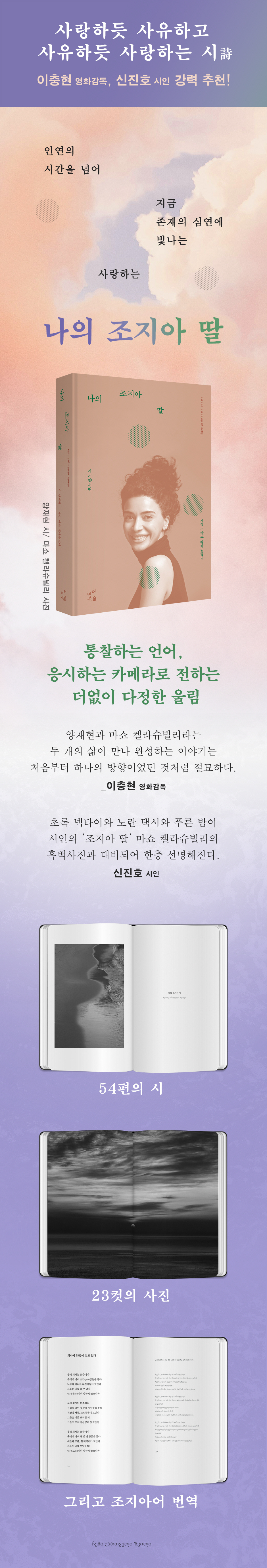 통찰하는 언어, 응시하는 카메라가 전하는 다정한 울림 시인 양재현이 걸어온 길은 평범하지 않다. 우선 그는 IT 기술경영인이다. 한국을 찾은 빌 게이츠를 만나 직접 상을 받은 이력은 지금도 업계에서 회자된다. 그러나 한편으로 그는 예술경영을 공부하고 연극 무대에 섰으며, 밴드에서 노래하고, 환경영화제를 기획하고, 수감 청소년을 위한 예술치유 활동을 이끌었다. 그가 시를 쓰게 된 것이 돌연한 변신이 아닌 자연스러운 흐름인 까닭이다. 그래서일까. 《나의 조지아 딸》에는 여전히 눈을 빛내는 시인의 호기심이 가득하다. 빌딩숲에서 다른 곳을 바라보기도 하고(〈회사가 15층에 살고있다〉), 우주의 신비에 탐닉하며(〈내 안의 우주〉, 〈마인드 게임 1Q86〉) 삶을 반추하고(〈아침 생각〉), 자연과 생명의 본질을 들여다보다가도(〈풀잎의 열반〉, 〈이른 산수유〉), 이내 남편이자 아버지로 돌아오고(〈수능을 100일 앞둔 아들에게〉, 〈아즈라엘에게〉), 국제결혼을 한 아들의 새로운 가족을 사랑으로 맞는다(〈조지아 딸〉). 양재현에게 시는 삶의 다양한 이면들을 조화시키는 비밀이자 세상을 향해 던진 질문 끝에 도달한 고요하고 다정한 응답이다. 루수단 아브라미제가 말하듯 그는 “일상의 평범함 속에서 비범함을 건져 올린다”. 신진호 시인은 공간을 자유롭게 오가는 시인의 심상이 “마쇼 켈라슈빌리의 흑백사진과 대비되어 한층 선명해진다”고 말한다. 끝없이 이어지는 조지아의 코카서스 산맥과 베트남 할롱베이의 물결, 한옥의 창호와 대문, 발리의 해변, 아프리카의 카페…. 세상을 응시하는 마쇼 켈라슈빌리의 카메라는 시간을 머물게 하고, 고요히 침잠하게 한다. 이는 영화 촬영과 사진을 동시에 공부한 그녀의 이력과도 무관하지 않다. 마쇼 켈라슈빌리는 조지아의 사진작가 구람 치바카슈빌리가 세운 사진학교에서 수학했으며, 저명한 영화작가 다토 추비니슈빌리와 함께 영화사 및 영화 이론을 연구했다. 중국의 베이징전영학원에서 영화 촬영을 전공하기도 했다. 이 책의 표지를 장식한 모델 역시 켈라슈빌리 본인이다. 조지아의 코카서스 산맥으로 떠난 가족 여행에서 양재현과 마쇼 켈라슈빌리는 시와 사진이 어우러진 책을 내기로 약속했다. ‘나의 조지아 딸’이라는 제목은 그렇게 정해졌다. 한국에서 출간되는 책이지만 이 책의 한국어와 조지아어의 비율은 정확히 5:5이다. 한국의 시인 양재현의 책인 동시에 조지아의 사진작가 마쇼 켈라슈빌리의 책이기 때문이라고 두 작가는 이야기한다. 이 책의 조지아어 번역 역시 켈라슈빌리가 맡았다. 이 시집을 먼저 읽은 이충현 감독은 이렇게 말했다. “지구 반대편의 누군가가 나와 같은 감정을 나누고 있으리라는 생각에 시를 읊는 것 자체가 소통처럼 느껴진다.” 진심은 전해진다고 믿는 두 작가가 건네는, 낯설지만 다정한 풍경 속에 잠시 머물러보자. |