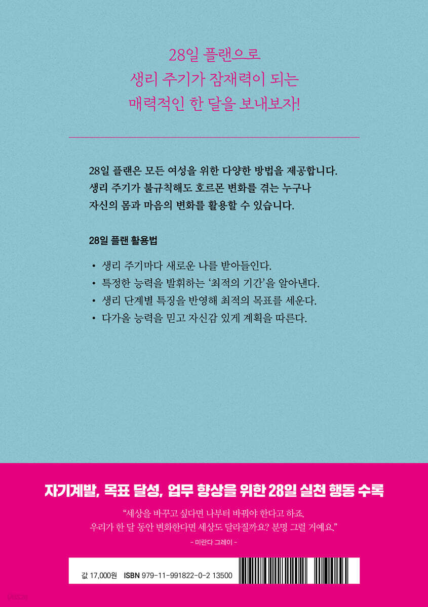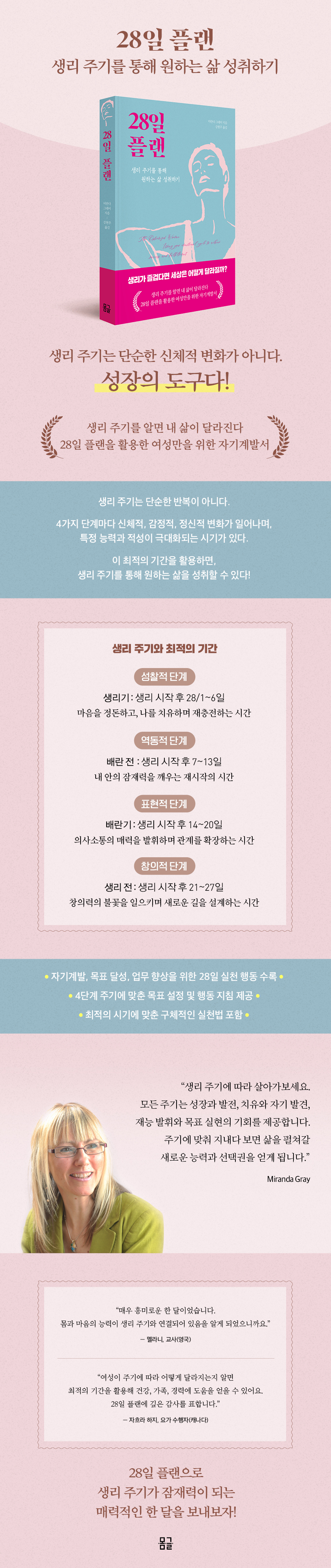 ”생리를 즐기는 방법 찾기” 여성은 일생 동안 평균 약 400회의 생리를 한다. 한 달로 보면 5~7일 정도지만, 이를 모두 합치면 5년 이상에 해당하는 시간이다. 전체 수명으로 따져도 결코 짧지 않은 시간이다. 그렇다면 우리는 이렇게 긴 시간 동안 생리를 어떻게 인식하고 받아들여 왔을까? “생리는 유일하게 폭식이 허용되는 시기라고 생각해요.” “생리 후가 다이어트 황금기라고 해서 그동안 다이어트를 해봤어요.” “PMS로 힘들었는데 생리를 시작하면 벗어날 수 있어서 좋아요.” 대부분의 사회에서 생리는 불편하고 피해야 할 것으로 여겨져 왔다. 특히 한국 사회에서 살아온 여성이라면 생리와 관련한 긍정적인 기억이 극히 제한적일 것이다. 많은 여성이 폭식을 하거나, 몸을 혹사하며 다이어트를 하는 등, 정작 생리 기간 동안 몸을 쉬게 하고 자신을 돌보는 시간을 제대로 보내지 못하고 있다. 그렇다면 생리 기간을 ‘제대로’ 보낸다는 것은 무엇을 의미할까? 항상 벗어나고 싶었던 생리 주기를 온전히 받아들이고 활용하는 방법이 정말 있을까? 한 가지 확실한 것은, 생리는 여성이기에 감당해야 하는 불가피한 과정이 아니다. 오히려 여성으로서 당연히 누려야 하는 순간들이며, 삶의 일부로 받아들여야 할 가치가 있다. 생리가 즐겁다면 세상이 어떻게 변할까? 『28일 플랜』이 우리에게 하고 싶은 말들 여성은 생리 주기에 따라 몸과 마음이 변화하며, 이는 사고방식과 감정, 행동에도 영향을 미친다. 그러나 이러한 변화는 대부분의 사회적 영역에서 외면당해 왔다. 『28일 플랜』은 이러한 주기적 변화를 설명하며, 생리 주기를 단순한 신체적 과정이 아닌 라이프 코치로 활용할 수 있다고 이야기한다. 여성이라면 누구나 자신의 주기를 이해하고 이를 계획적으로 활용하여 능력과 재능을 극대화할 수 있다. 특히 『28일 플랜』에서 제시하는 솔루션은 생리 주기가 일정하지 않은 경우에도 유연하게 적용할 수 있으며, 생리를 겪고 있거나 앞으로 경험할 여성 모두에게 실질적인 도움을 줄 것이다. 7일간의 생리 기간을 기준으로 총 28일의 주기를 따라 구성된 『28일 플랜』은, 생리 주기를 신체적 변화에 그치는 것이 아니라 삶의 만족도를 높이는 도구로 활용하는 법을 제안한다. 또한, 이 책은 단순히 읽고 끝나는 자기계발서가 아니다. 독자가 직접 참여하고 기록하며 자신의 변화를 체험할 수 있도록 구성된 실천형 가이드북으로, 크고 작은 목표를 이루고 싶은 모든 여성에게 유용한 지침서가 되어줄 것이다. 『28일 플랜』의 저자 미란다 그레이는 여성의 잠재력을 연구하며, 세계적인 강연과 워크숍을 통해 수많은 여성들에게 영감을 주고 있다. 그녀는 생리 주기에 따라 여성의 특별한 능력이 달라질 수 있다고 주장하며, 실제로도 자신의 주기를 활용해 크리에이티브 디렉터, 워크숍 진행자, 작가, 라이프 코치, 일러스트레이터 등 다양한 역할을 성공적으로 해내고 있다. 생리 주기를 알면 내 삶이 달라질까? 28일 플랜을 활용한 여성만을 위한 자기계발 방법 『28일 플랜』은 28일의 주기를 배란 전, 배란기, 생리 전, 생리기로 나누고, 이를 각각 역동적 단계, 표현적 단계, 창의적 단계, 성찰적 단계로 명명한다. 저자는 각 단계에서 활용할 수 있는 신체적, 감정적, 업무적 전략을 통해 목표를 달성하고 자기계발을 이루는 방법을 안내한다. ① 역동적 단계 (배란 전) “내 안의 잠재력을 깨우는 재시작의 시간” ‘역동적 단계’는 생리 후 몸과 마음이 빠르게 회복되는 시기로, 새로운 시작에 가장 적합한 시기다. 이때, 체력과 집중력이 최고조에 달하므로 새로운 목표를 설정하거나 미뤄왔던 일을 시작하기에 이상적이다. 저자는 이 기간 동안 신체적 활력을 최대한 활용하는 방법을 제안하며, 효과적인 업무 계획과 행동 전략을 소개한다. ② 표현적 단계 (배란기) “의사소통의 매력을 발휘하며 관계를 확장하는 시간” 배란기로 접어들면서 자신감과 사교성이 높아지고, 의사소통 능력이 극대화된다. 이 시기에 만들어진 관계와 성취는 개인의 경력과 목표 달성에 중요한 밑거름이 될 수 있다. 저자는 중요한 발표나 협상, 네트워킹 등의 활동을 이 시기에 집중적으로 수행할 것을 권장하며, 이를 효과적으로 활용할 수 있는 다양한 가이드를 제시한다. ③ 창의적 단계 (생리 전) “창의력의 불꽃을 일으키며 새로운 길을 설계하는 시간” 생리 전 단계는 감정이 예민해지고 혼란스러울 수 있는 시기다. 그러나 저자는 이 시기를 단순히 감정 기복이 심한 시기로 보지 않고, 강렬한 직관과 창의성이 발휘되는 ‘창조적 시간’으로 해석한다. 혼란 속에서도 창의적 에너지를 발견하는 방법을 안내하며, 이 시기를 아이디어를 발전시키거나 문제 해결에 집중할 수 있는 기회로 활용할 것을 제안한다. ④ 성찰적 단계 (생리기) “마음을 정돈하고, 나를 치유하며 재충전하는 시간” 생리 기간은 몸과 마음이 자연스럽게 휴식과 재충전을 필요로 하는 시기다. 저자는 이 기간 동안 내면의 목소리에 귀 기울이고, 스스로를 돌보는 것이 중요하다고 강조한다. 또한, 이 시기를 활용해 삶의 방향을 재정비하고, 다