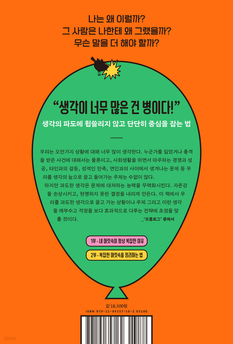 체크리스트 내 머릿속은 지금 어떤 상태일까? 1부 내 머릿속이 항상 복잡한 이유 1장 “생각이 너무 많은 건 병이다” : 과도한 생각이 낳는 문제들 - 생각을 빵처럼 부풀리는 사람들 - 악다구니 유형, 제멋대로 유형, 뒤죽박죽 유형 - 생각은 '왜곡된 렌즈 효과'를 불러일으킨다 - 지진을 잊은 사람과 지진을 잊지 못하는 사람 - 이별을 인정하고 싶지 않은 마음 - 생각은 점점 전염된다 - 여자는 남자보다 몇 배 더 생각한다 2장 “꼬리에 꼬리를 무는 생각 사이클” : 우리가 계속 생각하는 이유 - 잘못한 것도 없는데 겁부터 내는 신입사원 - 이유 없는 짜증은 없다 - 생각하느라 대처하지 못하는 세대 - '생각 병'을 키우는 네 가지 요인 3장 “섬세한 사람이 생각에 더 빠져든다” : 생각에 대한 여자와 남자의 차이 - 아직 사회는 기울어져 있다 - '우리의 삶'과 '나의 삶'에서의 혼란 - 타인의 감정을 그대로 전달받는 여자들 2부 복잡한 머릿속을 정리하는 법 4장 “생각이 나를 집어삼키기 전에” : 과도한 생각에서 탈출하기 - 생각은 내 편이 아니다 - 뇌를 8분이라도 쉬게 하자 - 안 좋은 생각으로 잠들지 못한다면 - "그만해"라는 말의 쓸모 - 걱정에서 한 걸음 떨어지기 - 생각을 밀어내는 명상의 힘 - 한 명만 있으면 된다 - 글로 쓰면 막을 수 있다 - 매일 나에게 주는 선물 5장 “새로운 나를 마주해야 할 때” : 다른 관점으로 바라보기 - 시간을 정해 두고 생각하자 - 화가 나도, 슬퍼도, 불안해도 괜찮다 - 비교는 집착으로 이어진다 - '만약에'에서 빠져나오기 - 생각이 흐르는 통로 만들기 - 다른 사람의 가치관을 빌리지 마라 - 시작이 반이다 - 감수할 것은 감수하자 - 모두가 나와 비슷할 거라는 오해 - “그 사람이 어떻게 나한테 그럴 수 있지?” - 해야만 한다는 착각 6장 “현실적으로 생각해야 하는 순간” : 생각의 악순환을 끊는 법 - 차라리 피하는 게 답일 때 - 괴롭지만 높은 목표 vs. 행복한 포기 - 그 사람의 의견일 뿐이다 - "왜?"라는 질문의 힘 - 딸로서, 아내로서, 엄마로서 사는 삶 - 새로운 친구의 역할 - 부정적인 나를 긍정적인 나로 7장 “이런 일도 있고, 저런 일도 있다” : 상황별 생각 끊기 연습 - 사랑을 구걸한다고 느껴질 때 - 가족 관계를 다시 설정하자 - 나는 나대로, 아이는 아이대로 - 생각할 게 너무 많은 직장 생활 - 노화는 자연스러운 현상이다 - 이별은 언젠간 찾아온다 에필로그 우리가 더 행복해지는 세상을 꿈꾸며 |