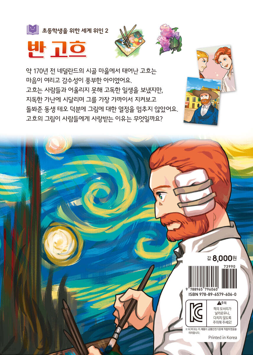 이 시리즈는 책을 읽기 전에 그림으로 된 「인물 소개」 코너를 수록해 이야기 속 주요 인물 및 사건과 배경 등에 대해 알려 주어 책에 대한 이해를 도와줍니다. 또 본문 뒤에 「올바른 독서 방법」을 수록해 책을 읽고 정리하는 방법을 알려 주고, 「더 생각해 보기」, 「편지 쓰기」, 「독서 기록장」 등의 다양한 활동을 통해 독후 활동을 재미있게 할 수 있도록 돕습니다. 아이들은 자기 생각을 정리하며 논리력과 표현력을 키울 수 있습니다. 「책 읽기 3단계」 * 1단계: 「인물 소개」를 읽으며 책 속 주요 인물, 사건, 배경 등에 대해 알아봐요! * 2단계: 「본문」을 재미있게 읽어요! * 3단계: 책을 읽은 뒤 「더 생각해 보기」, 「편지 쓰기」, 「독서 기록장」 등 다양한 부록을 통해 논리력과 표현력을 키워요! 사람들을 위로하는 그림을 그리고 싶어! 불안한 삶 속에서도 태양처럼 빛나는 작품을 남긴 화가 이야기 약 170년 전 네덜란드의 시골 마을에서 태어난 고흐는 마음이 여리고 감수성이 풍부한 아이였어요. 고흐는 사람들과 어울리지 못해 고독한 일생을 보냈지만, 지독한 가난에 시달리며 그를 가장 가까이서 지켜보고 돌봐준 동생 테오 덕분에 그림에 대한 열정을 멈추지 않았어요. 고흐의 그림이 사람들에게 사랑받는 이유는 무엇일까요? |