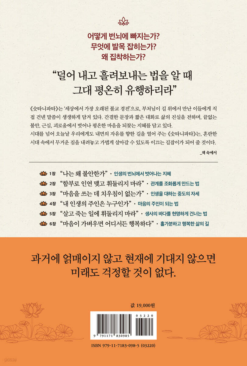 『숫타니파타』는 어떤 경전인가 1장 “나는 왜 불안한가”│인생의 번뇌에서 벗어나는 지혜 불안의 소용돌이를 건너는 법 삶은 그야말로 괴로움의 바다이다 집착 없는 자에겐 근심도 없다 쫓아내려 할수록 더 가까워지는 것 마음 밭에 무엇을 심고 있는가 알아차리는 순간 고요가 찾아온다 2장 “함부로 인연 맺고 휘둘리지 마라”│관계를 조화롭게 만드는 법 인연이 깊어질수록 여백이 필요하다 차라리 혼자서 가라 타인과 비교하지 마라 말로 쌓은 업이 스스로 지옥문을 연다 편견의 그물에 걸린 자는 날 수 없다 ‘보시’ 없이는 깨달음도 없다 3장 “마음을 쓰는 데 치우침이 없는가”│인생을 대하는 중도의 자세 재앙은 어디서 시작하는가 진정한 행복을 부르는 ‘소욕지족’의 삶 “감각은 문이고, 욕망은 불이다” 왜 화의 근원을 남에게서 찾는가 마음을 해치는 ‘삼독’을 깨달아라 바깥의 장단에 요동칠 이유가 없다 4장 “내 인생의 주인은 누구인가”│마음의 주인이 되는 법 내가 아는 ‘나’는 나인가 괴로움을 비우는 ‘무아’의 지혜 “자신을 섬으로 삼고 세상을 유행하라” 자신을 이긴 사람이 진정한 승리자 생의 무게를 나에게 견주어라 의연하게 살고 싶다면 비교하지 마라 5장 “살고 죽는 일에 휘둘리지 마라”│생사의 바다를 현명하게 건너는 법 백 년을 살아도 결국은 이별이다 윤회의 사슬을 끊는 깨달음 “이 몸도 언젠가는 송장과 같으리라” 죽음의 순간을 넘을 때 거센 물결을 건너 피난처로 뱀이 허물을 벗듯 집착을 벗어라 6장 “마음이 가벼우면 어디서든 행복하다”│홀가분하고 행복한 삶의 길 쥐려 할수록 놓치는 것이 행복이다 행복과 불행은 쌍둥이 자매 행복하려고 애쓰지 마라 타인을 자비의 마음으로 대하라 존재하는 모든 것이 행복하기를 오늘이 이생의 마지막 하루인 것처럼 맺는 글 불안과 근심에서 벗어나 평온으로 가는 길 참고문헌 |