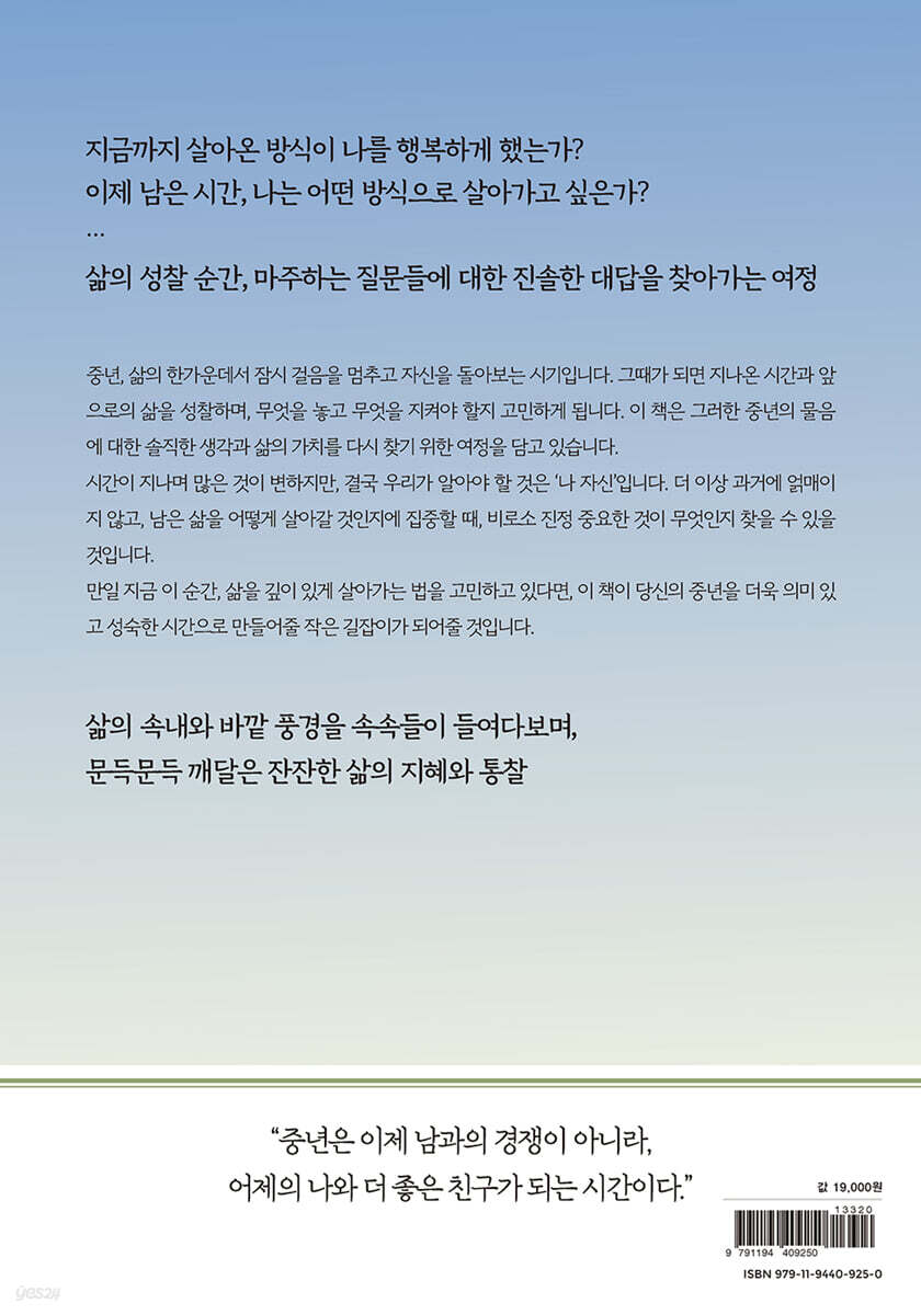 --- 「나이 듦의 성장통」 중에서 나이 들수록 삶의 무게는 더욱 커지고, 그로 인해 잃어버린 것들을 찾고자 하는 마음 역시 커진다. 그러다 보면 삶의 깊은 구렁텅이에 빠져들 수도 있다. 이럴 때, 탈출구는 우리가 그 구렁텅이에서 벗어나도록 도와주는 역할을 한다. 탈출구는 여러 가지 형태로 존재한다. 때로는 그 탈출구가 고요한 고독일 수도 있고, 때로는 활기찬 사람들과의 만남일 수도 있다. --- 「나이 들수록 삶의 탈출구가 있어야 한다」 중에서 사람은 대개 잘나갈 때 자신의 한계를 돌아보지 않는다. 모든 것이 순조롭게 흘러가면 자신이 어디로 가고 있는지, 어떤 삶을 살아야 하는지 깊이 고민하지 않는다. 하지만 예상치 못한 실패나 시련이 찾아오면 비로소 자신이 누구인지, 무엇을 원하는지 고민한다. 마치 거울 앞에 선 듯, 가식 없이 맨얼굴의 자신을 마주하게 되는 것이다. --- 「가장 낮은 곳에 있을 때 비로소 내가 보인다」 중에서 내리막이 끝나는 곳에서 길은 다시 열린다. 더 단단해진 마음으로, 더 깊어진 시선으로 우리는 새로운 길을 걸어간다. 그러니 내리막길을 두려워하지 말자. 그것은 끝이 아니라, 더 성숙한 나로 가는 과정일 뿐이다. --- 「인생은 내리막길에서 훨씬 성숙해진다」 중에서 인간관계의 다이어트는 단순히 사람들과의 거리를 두는 것이 아니라, 나를 위해 불필요한 관계를 정리하고, 더는 거기에 에너지를 낭비하지 않는 것이다. 특히 나에게 긍정적인 영향을 주지 않는 관계는 자연스럽게 거리를 두어야 한다. 무조건적인 ‘예의’나 ‘의무감’으로 지속되는 관계는 오히려 내게 스트레스를 주고, 감정만 소모하게 한다. --- 「인간관계에도 다이어트가 필요하다」 중에서 힘들면 힘들다고 말하고, 울고 싶으면 울어야 한다. 무조건 참는 것은 치유가 아닌 상실이다. 말하지 않으면 무엇도 해결할 수 없기 때문이다. 감정을 억누르는 것은 결코 해결책이 아니다. 말하지 않는다고 아픔이 사라지는 것이 아니며, 속으로 삭인다고 해결되는 것도 아 니다. 오히려 그렇게 쌓인 감정들은 결국 더 큰 상처가 되어 우리를 갉아먹는다. --- 「혼자가 아닌 함께 이겨내기」 중에서 비교는 행복을 갉아먹는 가장 큰 적이다. 남과 나를 비교하는 순간, 내 삶이 초라하게 느껴지고 만족감은 사라지게 된다. 따라서 비교하는 삶이 아닌 나만의 속도로 나아가야 한다. 어제의 나보다 오늘 더 나아진 내가 되는 것, 그것이 진정한 성장이기 때문이다. 그런 점에서 볼 때 나에게 집중하고, 내가 원하는 길을 걸으며, 나 자신을 사랑하는 것, 그것이야말로 후회 없는 삶을 사는 가장 좋은 방법이다. --- 「나를 위한 삶 살기」 중에서 한 걸음 물러서서 생각하는 것은 단순히 시간을 끄는 것이 아니다. 그것은 자신을 객관적으로 바라볼 수 있는 기회를 주고, 감정에 휘둘리지 않고 이성적으로 판단할 수 있는 여유를 준다. 다른 사람들과의 관계에서 갈등을 겪고 있을 때도 이 방법은 매우 유용하다. 감정이 격해질 때, 잠시 물러서서 상대방의 입장이나 상황을 이해하려 노력하는 것만으로도 문제를 해결하는 데 큰 도움이 되기 때문이다. --- 「한 걸음 물러서서 생각하기」 중에서 |