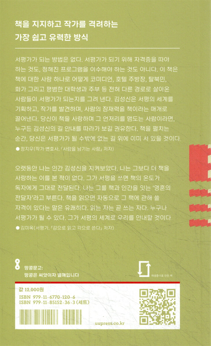 서평가가 되는 방법은 없다. 서평가가 되기 위해 자격증을 따야 하는 것도, 정해진 프로그램을 이수해야 하는 것도 아니다. 이 책은 책에 대한 사랑 하나로 어떻게 코미디언, 호텔 주방장, 탈북민, 화가 그리고 평범한 대학생과 주부 등 전혀 다른 경로로 살아온 사람들이 서평가가 되는지를 그려 낸다. 김성신은 서평의 세계를 기획하고, 작가를 발견하며, 사람의 잠재력을 책이라는 매개로 끌어낸다. 당신이 책을 사랑하며 그 언저리를 맴도는 사람이라면, 누구든 김성신의 길 안내를 따라가 보길 권유한다. 책을 펼치는 순간, 당신은 서평가가 될 수밖에 없는 길 위에 이미 서 있을 것이다. - 정지우 (작가·변호사, 『사람을 남기는 사람』 저자)