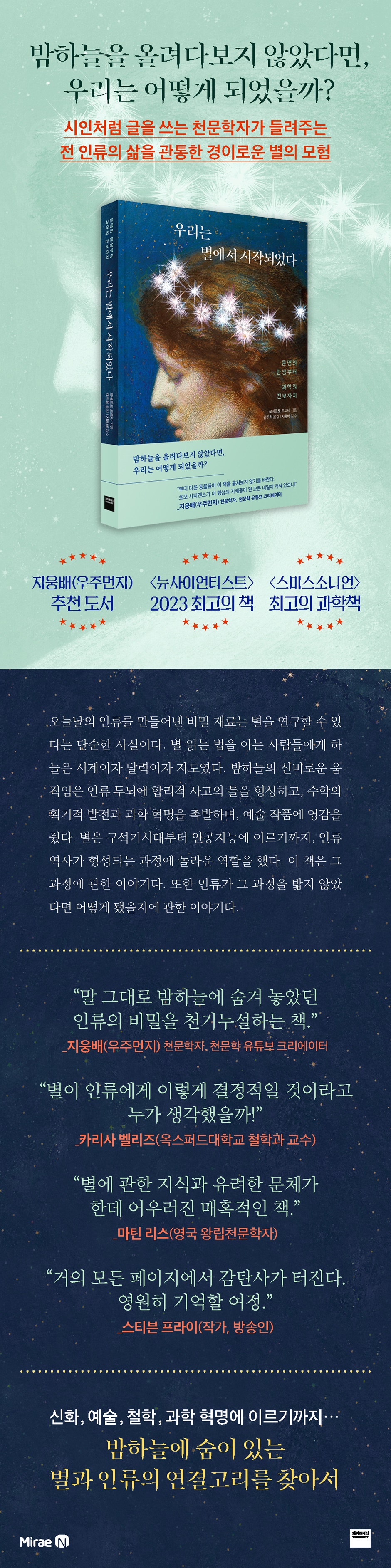 “밤하늘을 올려다보지 않았다면, 우리는 어떻게 되었을까?”그 아름다움과 질서로부터 탄생한 인류의 모든 것11월의 어느 저녁, 이제 막 연인이 된 두 사람이 연극을 관람하고 돌아가는 길이었다. 헤어지기 아쉬운 마음에 하염없이 강가를 거닐다가 하늘을 올려다보았다. 달도 뜨지 않아 별이 쏟아지듯 밤하늘이 반짝였다. 연인은 수십억 년의 세월이 쌓여 만들어진 생생한 무대 위의 유일한 등장인물이 되었다. 피날레를 장식하듯 때마침 머리 위로 스쳐지나가는 아름다운 유성을 보며 둘은 조용히 같은 소원을 빌었고, 그 소원은 마침내 이뤄졌다. 남자는 그때를 회상하며 말했다. “그 밤, 내 인생이 바뀌었다”라고. 이렇게 꽤나 낭만적인 일화로 시작되는 책이 있다. 바로 『우리는 별에서 시작되었다』다. 우주론학의 세계 권위자이자 이론물리학 교수인 이 책의 저자 로베르토 트로타 본인의 러브 스토리이기도 하다. 어린 시절 밤하늘에 총총히 빛나는 별을 보며 소원을 빌어보지 않은 사람이 있을까? 별은 마치 우리의 DNA에 각인되어 있는 것처럼 오랜 시간 희망의 상징이자 세레나데이며 뮤즈였다. 그전에는 경이로우면서도 두려운 지배자이자 신이었고, 이후엔 모든 과학에 영감을 제공한 산파로서 천문학과 물리학, 지질학, 화학, 생물학이 차례로 명료한 법칙에 근거해 우주의 진리를 밝혔다. 이처럼 호모 사피엔스가 고개를 든 이후로 밤하늘은 인류의 동반자이자 안내자였다. 하지만 지금에 이르러 인공조명 아래 사는 우리는 더 이상 별을 찾지 않으며, 밤하늘과 맺은 친밀한 유대를 잊고 있다. 저자는 ‘지금 다시 별을 바라볼 시간’이라고 역설한다. 우리는 별에서 시작되었기 때문이다. 인류의 정체성을 찾기 위해 그는 역사의 구덩이를 파고 들어가 문명이 탄생한 지점부터 오늘날 과학의 정점에 이르기까지 별의 숨은 궤적을 추적하는 흥미진진한 여정에 기꺼이 우리를 초대한다. 인류를 만들어낸 비밀 재료를 찾아서밤하늘이 구름에 가려져 다시는 별을 볼 수 없다면 어떻게 될까? 당연한 요소를 제거하면 낯선 관점으로 새로이 별을 관찰하게 될 것이다. 저자는 이 탐사의 책임 가이드로서 우리의 몰입과 상상력을 더하기 위해 이 책에 특별한 장치를 마련했다. 바로 우리의 행성 ‘지구’와 별이 보이지 않는 가상의 행성 ‘칼리고(Caligo)’ 이야기를 배치해 ‘별의 부재가 인류에 미칠 영향’을 보여주는 것이다. 밤하늘이 영감을 준 시, 음악, 예술 작품이 없었다면 인간은 얼마나 위축됐을까? 하늘의 신이 없었다면 영성은 어떤 형태였을까? 별이 보이지 않는 세상에서는 인류의 전설, 위대한 소설, 우주에 대한 개념이 얼마나 달랐을까? 우리 자신은 얼마나 다른 모습이었을까? 저자는 고대 그리스 시인 호메로스(Homeros)의 『오디세이아』에서 문장을 빌려와 “별을 보지 못하는 인류는 죽음에 가까워진 반인간에 불과하다”고 가정하며, 별의 의미와 위상을 재고한다. 천문학자의 독특한 호기심에서 탄생한 이 사고 실험은 단순한 픽션에 그치지 않고, 태풍, 스모그, 화산 등 자연적·인공적 요인으로 하늘이 가려졌던 과거의 대기록부터 외계 행성을 근거로 제시하며 맑은 하늘에 익숙한 우리를 상상하지 못했던 놀라운 세계로 이끈다. 이를테면 시속 9,700킬로미터로 바람이 맹렬하게 부는 행성, 녹은 유리가 빗물로 내리는 행성, 지금까지 알려진 가장 검은 물질 중 하나인 반타블랙(Vantablack) 같은 암흑 행성 등이 있다. 각 장마다 숨어 있는 칼리고라는 환상적인 스토리텔링은 인류 궤적에 대한 반례가 아니라 실제 역사와 대조되는 가상의 역사를 제시하며, 우리의 사고를 톡톡히 자극한다. “별은 모든 시간과 공간이 고스란히 남아 있는 기록이다.”밤하늘은 지구에 사는 모든 인간이 공유하는 자연의 유일한 요소다. 산도, 강도, 바다도, 돌도, 경외심을 불러일으키기에 충분하지만, 별은 같은 모습으로 존재한다는 점에서 더욱 특별하다. “별은 왜곡될 수 없다”고 말한 과학사학자 루이스 멈퍼드(Lewis Mumford)의 말처럼, 호모 사피엔스와 별의 운명적 만남은 인간에서 사회로, 또한 지구에서 우주로 연결되는 인류의 출발점이 되었다. 천체의 규칙적이고도 신비로운 움직임은 인류 최초의 시계에서 달력, 지도, 망원경, 연감, 계산기, 컴퓨터로, 시공간 측정 기술에서 수학적 도구의 발달과 과학 혁신으로 이어지는 중요한 효시였다. 그 덕분에 인류는 연안 바다를 건너 지구 곳곳으로 퍼져나가며 지평을 넓히게 되었다. 또한 밤하늘은 예술의 개척지였다. 별의 그 특별한 상징성은 오랜 시간에 걸쳐 일상 깊숙이 스며들어 우리의 정신과 내면에 번득이는 영감을 제공하고, 공동체적 믿음과 감수성을 확장했다. 이 책은 전 인류를 포용하는 조용하고도 다정한 별의 업적을 최신 과학과 역사적 사실로 열거하는 일반적인 서술을 넘어, 문학적 인용과 픽션을 별자리처럼 알알이 엮어 전혀 다른 방식으로 밤하늘을, 그리고 우리 존재를 인식하게 만든다. “시인처럼 글을 쓰는 천문학자의 매력적인 인류 역사”라는 언론의 찬사처럼 별과 인간의 친밀한 역사를 서정적인 필치로 그려낸 『우리는 별에서 