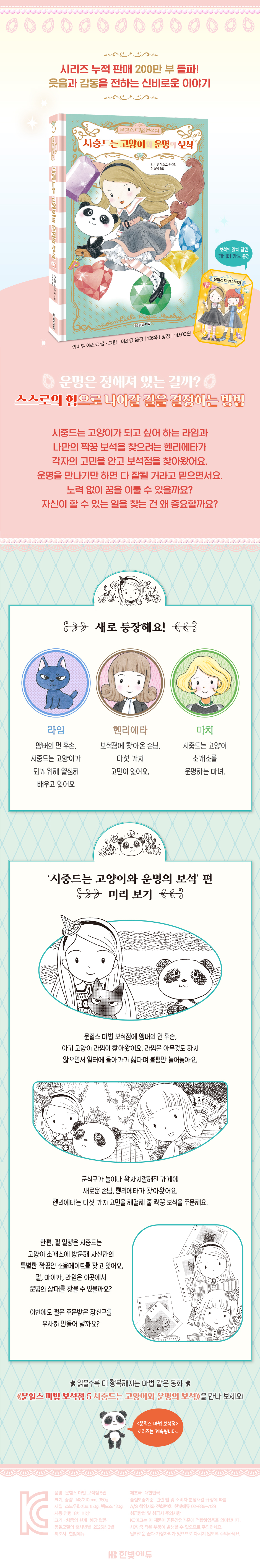 시리즈 누적 판매 200만 부 돌파!웃음과 감동을 전하는 신비로운 이야기〈문힐스 마법 보석점〉 시리즈는 〈무엇이든 마녀상회〉, 〈숲속의 꼬마 파티시에〉, 〈마법의 정원 이야기〉로 잘 알려진 인기 동화 작가 안비루 야스코가 가장 최근에 내놓은 작품이에요. 오래된 마법 보석점에서 새내기 마녀로 일하게 된 펄이 손님의 의뢰를 받아 보석 장신구를 만드는 이야기예요. 이곳에는 저주를 받아 초상화 속에 갇힌 천재 보석 세공사 마녀 세레니티스와, 그의 시중을 드는 아기 판다 앰버가 살고 있어요. 언제나 자기 생각뿐인 세레니티스와 앰버가 다른 사람을 도우면 ‘도움 표시기’의 눈금이 움직이는데, 눈금이 10까지 올라가면 저주가 풀려요. 운명은 정해져 있는 걸까?스스로의 힘으로 나아갈 길을 결정하는 방법이번에는 앰버의 먼 후손, 어린 고양이 라임이 새로 등장해요. 라임은 시중드는 고양이가 되기 위해 일터에서 일을 배우고 있는 견습 고양이에요. 그런데 휴가를 맞아 보석점에 자리를 잡고는 아무것도 하지 않아요. 일을 배우는 건 너무 시시하고, 특별히 무언가를 하지 않아도 운명의 상대인 소울메이트만 만나면 모든 것이 해결된다고 생각해요.뜻밖의 군식구가 된 라임으로 인해 북적이는 가게에 마녀 헨리에타가 손님으로 찾아와요. 헨리에타는 어렸을 적부터 쭉 간직해 오던 다섯 가지 고민을 털어놓아요. 그리고 이것들을 전부 해결해 줄 짝꿍 보석을 찾아 장신구를 만들어 달라고 주문해요. 누구에게나 일생에 하나, 언젠가 만나게 되는 운명의 보석이 있는데 이 보석을 지니고 있으면 어떤 일이든 쉽게 잘 풀린다면서요.헨리에타의 이야기를 들은 펄은 자신에게도 운명의 보석이 있을지 곰곰이 생각하며 헨리에타의 짝꿍 보석을 찾기 위해 노력합니다. 그러다가 친구 마이카와 함께 ‘시중드는 고양이 소개소’를 찾아가요. 마녀와 고양이, 모두에게 잘 맞는 상대를 찾아 주는 이곳에서 펄 일행은 운명의 힘에 의지하기보다 스스로를 믿고 노력하며 살아가야 한다는 걸 깨달아요. 이윽고 펄은 내 주변부터 돌아보기로 결심하고, 헨리에타 할머니의 오랜 소망이 깃든 반지의 목소리에 귀를 기울입니다.“소울메이트는 ‘만나는 것’이 아니라 ‘되어 가는 것’이야.상대를 위해 자신이 할 수 있는 일을 하는 것이 중요해.”세상에서 단 하나뿐인 운명의 상대 ‘소울메이트’는 특별한 존재임이 분명해요. 소울메이트를 만나면 인생의 부족한 퍼즐 조각을 찾은 것처럼 완전해질지도 몰라요. 하지만 운명을 찾는 데만 급급하다 보면, 정작 곁에 있는 소중한 인연을 놓쳐 버릴 수도 있어요.시중드는 고양이 소개소를 운영하는 마녀, 마치도 이렇게 말해요. “소울메이트는 ‘만나는 것’이 아니라 ‘되어 가는 것’”이라고요. 어려운 순간마다 곁에 있는 사람과 함께 힘을 모으고, 스스로 할 수 있는 일을 찾아 한 걸음씩 나아가다 보면 어느새 서로를 빛나게 해 주는 보석 같은 존재가 되어 있을 거예요. 어쩌면 우리 곁에서 묵묵히 함께해 온 이들이야말로, 펄 일행이 찾던 진정한 소울메이트가 아닐까요?