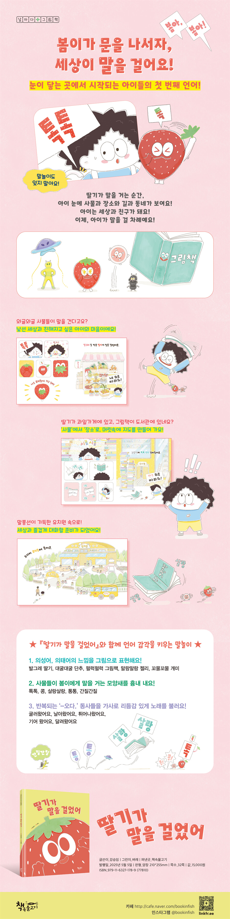 낯선 세상과 친해지고 싶은 아이의 마음이에요! 봄이가 유치원으로 출발해요. “봄아! 봄아!” 누군가 봄이에게 말을 걸어요. 발그레 잘 익은 딸기예요. “나도 유치원에 가고 싶어!” 봄이는 딸기와 함께 유치원에 간다고 생각하니 신이 나요. “내 뒤로 따라와!” 봄이는 딸기를 반갑게 맞아요. 그 뒤로 단추도, 그림책도, 젤리도, 개미도 봄이에게 말을 걸어요. 가만 보니, 봄이가 좋아하는 것들이에요. 봄이가 자기 방에서 한가득 그려 놓은 것들이지요. 맞아요, 봄이는 내가 좋아하는 것들과 친구가 되듯 세상과도 친해지고 싶었던 거예요. 이 그림책을 보면 자꾸만 설레요. ‘봄’이라는 이름이, 하루의 ‘아침’이, 누군가 ‘말을 거는’ 순간들이 새로운 시작을 힘껏 응원해 주고 있거든요. 딸기가 과일가게에 있고, 그림책이 도서관에 있네요? ‘사물’에서 ‘장소’로, 머릿속에 지도를 만들어 가요! 딸기를 만나고 나니, 과일가게가 보여요. 단추는 세탁소, 그림책은 도서관, 젤리는 편의점, 개미는 놀이터에 있어요. 이 그림책은 왼쪽 페이지에 사물을 만나고, 오른쪽 페이지에 장소가 보이는 구도로 진행돼요. 사물에 먼저 주목하고 나서, 시점이 넓어지면서 그 사물이 있는 장소가 눈에 들어오지요. 이는 아이의 ‘인지’가 넓어지는 과정이에요. 익숙한 사물을 마주하면서 장소를 이해하고, 길을 기억해 가고, 동네와 사회를 차근차근 알아 가는 것이지요. 인지는 머릿속에 지도를 만들어 가는 일과 같아요. 마지막 페이지에 봄이가 완성한 지도처럼 말이에요. 말풍선이 가득한 유치원 속으로! 세상과 즐겁게 대화할 준비가 되었어요! 드디어 유치원에 왔어요. 선생님이 봄이를 반갑게 맞아요. 그리고 봄이가 들어서는 유치원에는 말풍선이 가득해요. 이제는 봄이가 말을 걸 차례예요. 딸기랑 단추랑 그림책이랑 젤리랑 개미는 사라지지 않고 봄이와 함께 유치원에 들어서요. 상상 속 친구들과 나눈 대화는 봄이의 목소리가 되어 현실과 잘 소통하게 될 거예요. 봄이의 이야기가 힘이 되었다면, 문을 열어 볼래요? 나를 더 빛나게 해 줄 멋진 세상이 기다리고 있을 테니까요. ★ 『딸기가 말을 걸었어』와 함께 언어 감각을 키우는 말놀이 ★ 1. 의성어, 의태어의 느낌을 그림으로 표현해요! 발그레 딸기, 대굴대굴 단추, 펄럭펄럭 그림책, 말랑말랑 젤리, 꼬물꼬물 개미 2. 사물들이 봄이에게 말을 거는 모양새를 흉내 내요! 톡톡, 콩, 살랑살랑, 통통, 간질간질 3. 반복되는 ‘-오다.’ 동사들을 가사로 리듬감 있게 노래를 불러요! 굴러왔어요, 날아왔어요, 튀어나왔어요, 기어 왔어요, 달려왔어요 |