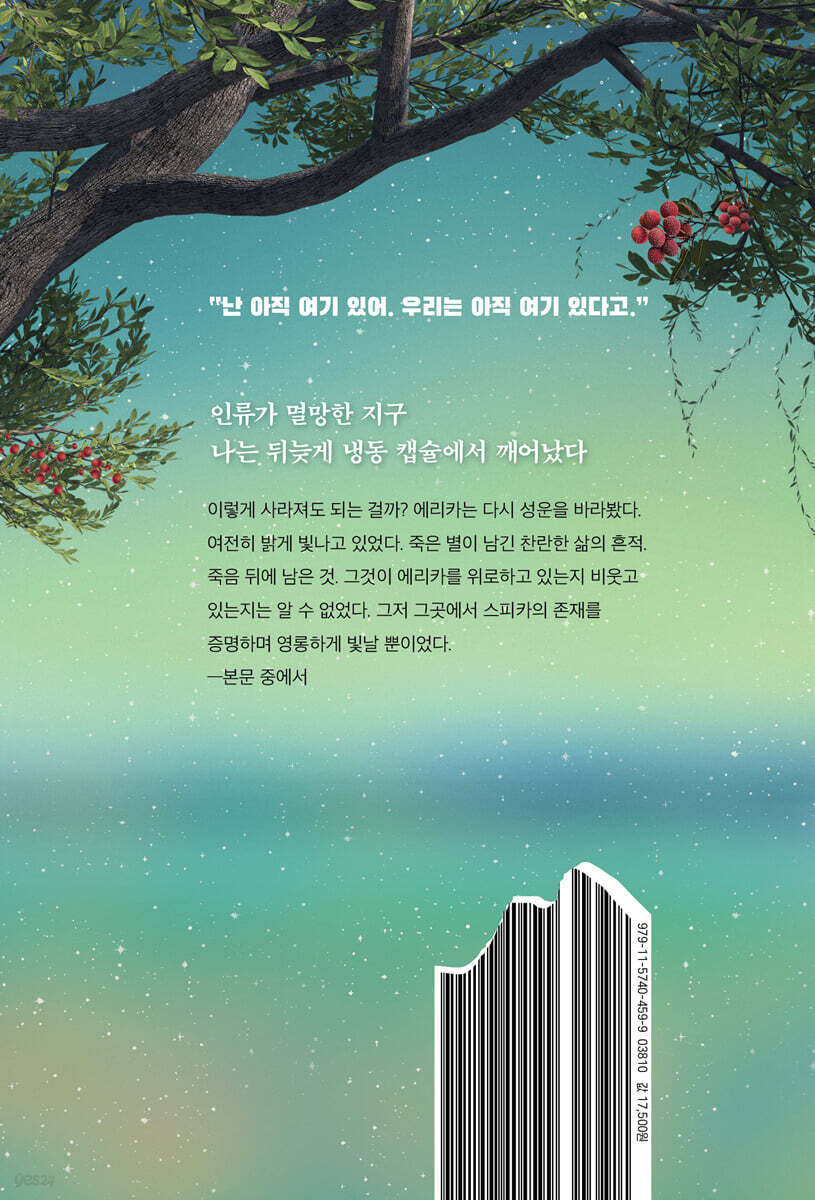 --- pp.8-9 딱히 떠오르는 건 없었다. 하지만 기억 속 어딘가에 에이다가 여전히 남아 있을 것이라고 에리카는 굳게 믿기로 했다. 어쩌면 에이다도 다른 캡슐에 탔을지도 모른다. 이런 캡슐을 하나만 만들었을 리는 없을 테니 그리 멀지 않은 곳에 에이다가 있을지도 모른다. 무엇보다 에이다는 26세기에 ‘다시’ 만나자고 했으니까. --- p.17 27543.04.26.13.43.34.372 마지막 세 자리 숫자는 읽을 수 없을 만큼 빠르게 변했다. 그다음 두 숫자는 초가 분명했다. 그렇다면 그다음은 분, 시, 일, 월 그리고……. 27543년. 약속한 시간에서 약 25000년이 지났다. 구름이 태양을 가렸고 멀리서 빗소리가 들려오기 시작했다. 비는 사흘 동안 이어졌다. --- p.19 이윽고 알아볼 수 있는 커다란 글씨가 나타났다. 철자는 에리카가 아는 것과 조금 달랐지만 그래도 충분히 읽고 해석할 수 있었다. ‘구원.’ 계단 벽에 이렇게 썼다는 건 구원이 오지 않았다는 뜻이다. 방주가 작동한 이후로 시간이 얼마나 지났든 결국 구원을 바랄 수밖에 없는 재난이 닥쳤고, 끝내 구원은 오지 않았다. --- p.37 에리카는 옥상 난간 위에 올라섰다. 이상하리만큼 평온한 마음이었다. 불안도, 두려움도, 고독도 없었다. 오히려 깊은 바다에 몸을 맡기는 듯 기분 좋은 해방감이 온몸으로 퍼져나갔다. 향긋한 숲의 바람이 얼굴을 스쳐 지나가며 다정한 마지막 인사를 건네는 것 같았다. --- p.46 마지막 순간까지 이곳에 있었던 이들을 기억하는 것. 이제 아무도 기억하지 않을 인간 사회의 마지막을, 누군가는 잠시라도 더 오랫동안 기억해야 했다. 그리고 에리카가 이곳에 있었다. 에리카는 조금 덜 외로워졌다. --- p.61 저 거대한 건축물은 방주가 분명했다. 약 25000년 전, 인류가 어떤 재앙을 직감하고 만든 생존 시설. 인간이 만든 것 중 가장 오랜 시간을 견딜 수 있는 구조물. 에리카가 잠들어 있던 방주인지는 알 수 없었다. 인류가 단 하나의 방주에만 미래를 걸었을 것 같지는 않았다. 어쩌면 에리카의 방주는 실패했고, 숲 아래에 묻혀 있을지도 몰랐다. 어찌되었든, 저곳은 아직 무사해 보였다. --- p.127 “켄티, 날 봐.” 켄티가 에리카에게 고개를 돌렸다. “나, 좋은 사람. 굿 피플.” 에리카는 유인원을 가리켰다. “저기, 나쁜 사람. 배드 피플.” 켄티는 알겠다며 고개를 끄덕인다. --- p.143 “퀴마 뉨 뷸로.” 저 인간을 보라. 환청이 아니었다. 저 아래에 있는 투리들이 웅성거리는 소리였다. 그들이 에리카를 가리키며 저 인간을 보라고 말하고 있었다. 에리카는 스스로 기적이 되기로 했다. 투리들을 위한 기적이 되기로 했다. --- p.205 |