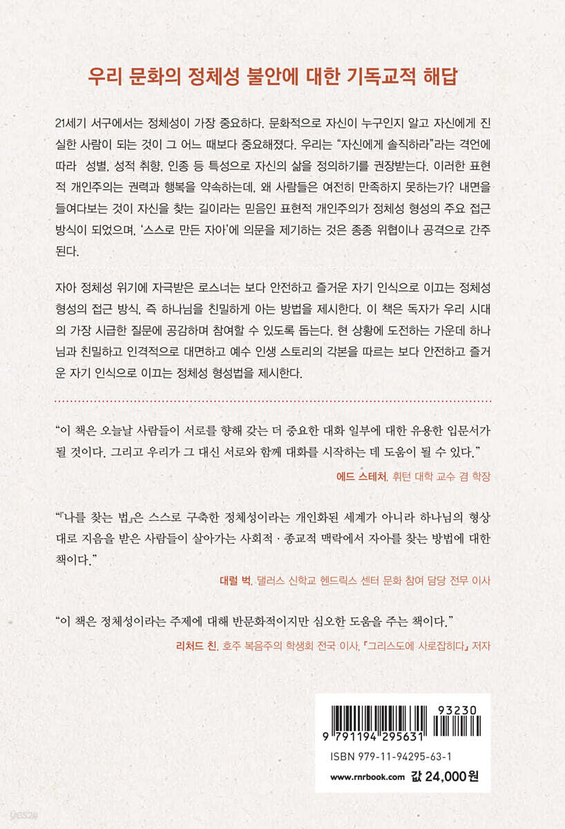 어떻게 하면 ‘나 자신을 찾을 수’ 있을까? 오늘날 많은 사람에게 이 질문은 당혹스럽고 도발적인 질문이다. 이 질문은 내 성적 정체성, 민족성, 가족, 국가, 영혼과 어떻게 연관되어 있을까? 브라이언 로스너에게 이 질문은 단순히 학문적인 것이 아니라, 지극히 개인적인 문제다. 그는 내면만 들여다보는 것의 단점을 폭로하면서 사회학, 무엇보다도 성경을 통해 이런 질문에 답한다. 이 책은 정체성이라는 주제에 대해 반문화적이지만 심오한 도움을 주는 책이다. - 리처드 친 (호주 복음주의 학생회 전국 이사, 『그리스도에 사로잡히다』(Captivated by Christ) 저자)