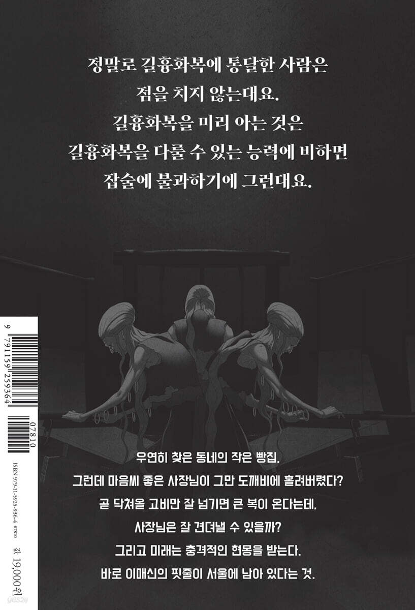 ---「89화 길흉자(吉凶者) (2)」중에서 “을지 님은 이미 돌잡이 때 자기 마음에 들지 않는 걸 쥐여줬다고 과보족 신장의 정강이뼈를 일곱 번 부러뜨린 분이다. (…) 그 타고난 싸가지와 안하무인의 인성, 무지한 포악함은 타의 추종을 불허하고, 스스로 내뱉은 말 중 선하고 상식에 준하는 것은 별로 지킨 적이 없으나, 특유의 괴이하고 기이하며 끔찍한 공갈협박은 지키지 않는 법이 없는 것으로 유명했다. 오죽하면 선대 요왕 어르신 부부께서 당신들의 아들을 그 끔찍한 오행금옥(五行禁獄)에 가두셨겠느냐?” ---「90화 길흉자(吉凶者) (3)」중에서 “맛있어져라, 맛있어져라. 한번 맛보면 꿈에도 나올 만큼 맛있어져라. 아기 입에 든 것도 긁어 뺏어 먹을 정도로 맛있어져라.” ---「90화 길흉자(吉凶者) (3)」중에서 “도깨비들이 기본적으로 제멋대로긴 해도, 자신들이 생각했을 때 ‘선업이다’ 싶은 일은 하기 좋아해요. 그리고 사람을 싫어한다면서도, 항상 사람들에 대해 알고 싶어 하고 호기심도 많대요.” ---「91화 길흉자(吉凶者) (4)」중에서 “사주란 자신이 있어야 할 곳을 찾도록 도와주는 수많은 실마리 중 하나에 불과하대요. 결국 아직 자기 자리를 찾지 못한 사주가 있을 뿐, 사주 자체가 박복하거나 길하거나 할 수는 없다는 말이죠.” ---「91화 길흉자(吉凶者) (4)」중에서 “오빠, 혹시 어릴 때 북시에 살았어요?” ---「92화 길흉자(吉凶者) (5)」중에서 “야. 개망나니. 미쳤냐?” ---「92화 길흉자(吉凶者) (5)」중에서 “정말로 길흉화복에 통달한 사람은 점을 치지 않는대요. 길흉화복을 미리 아는 것은 길흉화복을 다룰 수 있는 능력에 비하면 잡술에 불과한 것이어서 그렇다는데… 진짜 맞는 말 같아요.” ---「96화 길흉자(吉凶者) (完)」중에서 “특히 육비저주령, 그 저주받을 귀물(鬼物)에 대해선, 신녀님이 꼭 알아두셔야 할 것이 있습니다.” ---「96화 길흉자(吉凶者) (完)」중에서 “이매신의 핏줄이… 서울에 있다고?!” ---「96화 길흉자(吉凶者) (完)」중에서 “인왕산은 무(武)를 관장하며 서울에서 가장 기세가 좋고 정한 산이래요. 무(武)와 무(巫)는 여러 면에서 엇비슷하고 풍수적으로 인왕산은 금(金)과 인(寅)의 기운을 품고 있기 때문에 무(巫)에 몸을 담고 있는 사람들에겐 북악산보다 더 좋은 산이라고 할 수 있거든요.” ---「99화 인왕산 (2)」중에서 “여기가 일방통행이야, 아우토반이야? 산에선 앞 좀 잘 보고 다녀라.” ---「99화 인왕산 (2)」중에서 “주진은 원래 고대 동이족의 주술이었어요. 동이족은 뱀을 숭상하는 민족과 항상 사이가 좋지 못했는데 그때 그들에게 맞서기 위해 만들어진 거래요.” ---「101화 인왕산 (4)」중에서 “미카엘 신부님이 항상 하시던 말씀이 있습니다. 너의 생각과 판단으로 천주님에 속한 것을 가두려 하지 마라. 예수 그리스도께서 구유의 아기로 세상에 오심은, 너에게 권위를 주기 위해서가 아니라 낮은 곳에서부터 임하는 사랑을 가르치기 위함이라.” ---「103화 인왕산 (6)」중에서 “무당은 기다렸어요. 사람의 생살과 뼈, 피가 타는 역한 냄새를 맡으면서. 귀를 찢는 비명을 듣고 고통과 후회로 처절하게 몸부림치는 사람들을 바라보며, 기다렸죠.” ---「104화 인왕산 (7)」중에서 “그리고 잠에서 깨어난 무당의 악귀는 본능적으로 찾아간 거야. 자신과 피로 연결된 이를.” ---「104화 인왕산 (7)」중에서 “무배입산(無配入山) 실시득붕(失矢得朋) 불의수명(不擬受命) 짝이 없이 산에 오른다. 화살을 잃고 친구를 얻는다. 예상치 못한 명을 받는다라….” ---「105화 인왕산 (8)」중에서 |