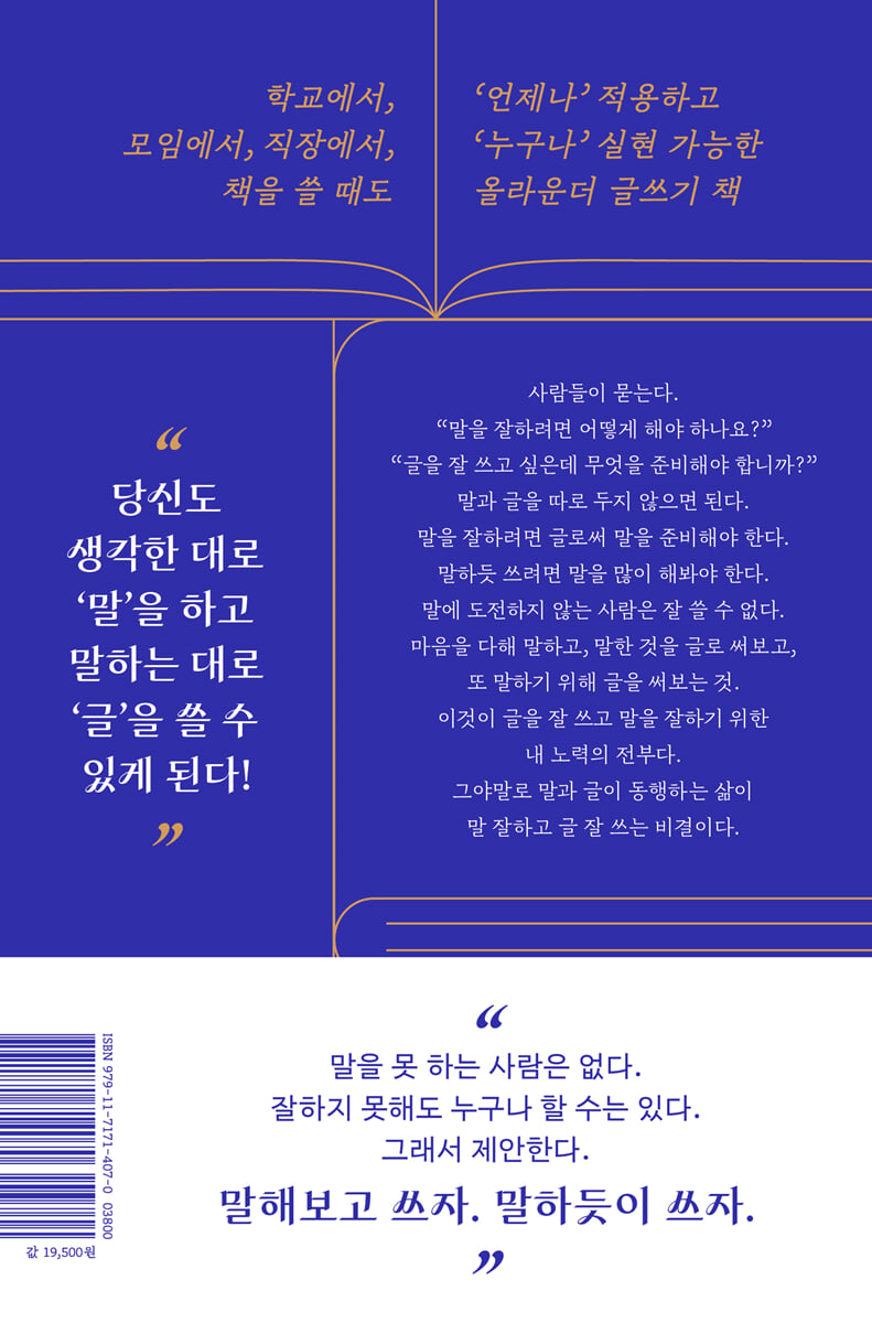 말하는 대로 ‘글’을 쓸 수 있게 된다! 과연 생각한 대로 말이 되고, 말하는 대로 글이 되는 사람이 세상에 몇이나 될까? 이 책은 그렇게 어려운 이야기를 하는 게 아니다. 저자는 일단 말하듯이 말해보고, 말한 대로 써보라고 강조한다. 말이든 글이든 모두 자기 생각을 표현하는 수단이다. “말을 못 하는 사람은 없다. 잘하지 못해도 누구나 할 수는 있다”라는 저자의 말처럼 우리는 말은 할 수 있다. 그러니 말로 읊어보고 그걸 받아적자는 것이다. ‘말하기 위한 글’을 썼던 저자가 ‘글쓰기를 위한 말’을 하면서 얻게 된 통찰이자 노하우다. 책은 일단 말해야 하는 이유를 다섯 가지로 정리한다. 첫째, 생각을 얻는다. 둘째, 생각이 정리된다. 셋째, 반응을 미리 알 수 있다. 넷째, 글의 호흡과 운율을 가늠할 수 있다. 다섯째, 하면 할수록 내용이 늘어난다. 이렇게 쓴 글은 독자에게 인기가 많다. 구어체를 바탕으로 해 읽기 편하고, 반응이 좋은 내용만 남았으며, 그래서 꾸미기보다는 핵심으로 직입(直入)하기 때문이다. 혹자는 말하듯이 쓰는 법은 짧은 글 정도에만 적용할 수 있다고 할지도 모른다. 하지만 말을 ‘많이’ 하면 책이 된다. 저자가 산증인이다. 그는 “《대통령의 글쓰기》라는 책을 쓰지 않았다. 5년간 말했을 뿐이다”라고 회고한다. 노무현 정부 이후 사회에 나오니 수많은 사람이 청와대 생활을 물어 답했을 뿐인데, 점차 생각이 정리되어 한 권의 책이 되었다. 우스갯소리로 군대 이야기는 밤새 해도 모자란다고 한다. 누구에게나 이런 이야기가 하나쯤은 있다. 직장에서든 집에서든, 반려동물이나 친구, 하물며 자기가 겪은 경험 등이 모두 ‘이야기’다. 말하듯이 쓰기만 해도 ‘저자’가 될 수 있다면 머뭇거릴 이유가 없다. 《나는 말하듯이 쓴다》는 글쓰기를 고민하는 모든 이에게 ‘가장 친절한 길잡이’가 되어준다. 말처럼 ‘술술’ 읽히는 글쓰기를 위한 ‘준비 운동’부터 ‘실전’까지, 2000회의 강의를 한 권의 책으로 압축하다! 여타 글쓰기 안내서들과 다르게 이 책은 글쓰기 전략이 아니라 ‘말과 글에 바탕이 되는 힘’이 무엇인지부터 알아본다. 겁부터 집어먹고 포기하지 않도록 저자가 고안한 가벼운 ‘몸풀기’다. 그렇다면, 글쓰기의 바탕이 되는 그 힘은 무엇일까? 질문하기, 관찰하기, 공감하기, 통찰하기, 비판적으로 사고하기, 감정 들여다보기, 상상하기, 이 7가지는 우리가 평소에도 자연스럽게 사용하는 감각이자, 말과 글의 토대를 이루는 핵심 요소들이다. 저자는 각 능력이 어떻게 글쓰기로 확장되는지 알려주고 그것을 연습하는 구체적인 방법을 제시한다. 예를 들어, 결정적 질문은 글의 ‘주제’가 되며, 관찰하기는 ‘글감’을 찾는 능력이고, 공감은 독자와의 ‘연결 고리’를 만드는 데 중요한 역할을 한다는 식이다. 무엇보다 중요한 건 이 7가지 힘은 누구나 이미 갖고 있다는 사실을 깨닫는 것. 이렇게 일단 준비운동부터 시작해보면, 말이 글이 되는 순간이 훨씬 가까워진다. 책은 이렇게 몸풀기에서 기본기로, 글쓰기 도구 사용법에서 훈련법으로, 그리고 최종 실전 책 쓰기까지 초심자의 호흡에 맞춰 차근차근 나아간다. 저자를 따라서 글을 쓰기 위한 자신만의 루틴을 만들어보고, 모방할 책을 선정해보자. 길을 걷다가 혹은 샤워를 하다가 번뜩이는 생각이 떠올랐을 때 메모로 남겨보자. 자신이 궁금해하는 결정적 질문을 따라 두서없이 글을 쏟아내보고, 또 이리저리 배열해보자. 그러는 동안, 독자들은 두려워만 했던 글쓰기가 좀 더 수월해지는 마법 같은 순간을 경험하게 된다. 물론 이 책은 글쓰기 초심자들만을 위한 것은 아니다. 글 좀 쓰는 사람이더라도 슬럼프에 빠졌을 때, 글쓰기는 되는데 말하기가 잘 안 될 때도 필요한 부분만 발췌해서 읽으면 도움이 된다. 평범한 직장인이었던 저자가 대통령 연설비서관으로 성장하기까지, 배우고 터득한 ‘인생 글쓰기 비법’ 이 책의 백미는 모든 설명에 저자의 경험이 녹아 있다는 것이다. 대기업 회장 비서, 대통령 연설비서관이라는 화려한 경력 때문에 특별한 사람이라 생각하기 쉽지만, 저자야말로 회사원으로 일하다 갑작스럽게 글쓰기 업무를 떠안게 된 평범한 직장인이었다. 여느 한국 사람처럼 남의 말을 듣고 따르는 데 익숙한 삶을 살았고, 자기 생각을 글로 옮기는 일은 시도할 기회조차 없었다. “회장이나 대통령의 연설문을 쓰는 것은 쓰기 영역이 아니다. 읽기, 듣기 영역이다. … 나는 잘 받아들이기만 했다.” 이러한 ‘평범함’은 독자가 더 쉽게, 더 몰입해서 책을 읽게 한다. 물론 마냥 평범하지만은 않다. 저자는 청와대를 나온 후 ‘백수’가 된 우연한 기회에 자기 생각대로 말하고 쓰는 삶을 살게 된다. 남의 눈치 안 보고, 하고 싶으면 하고, 하기 싫으면 안 하는 삶을 사는 것이다. 과거에는 ‘누구’보다 잘나기 위해 노력했지만, 이제는 ‘어제의 나’가 비교 대상이다. “어제의 글보다 오늘의 글이 낫다. 하고 쓰는 사람은 주체고, 읽고 듣는 이는 대상이다. 그래서 나는 말하고 쓴다.” 바로 이 ‘특별함’이 독자에게 좋은 동기부여가 된다. 말하듯이 쓰는 법에는 많은 장점이 있다
