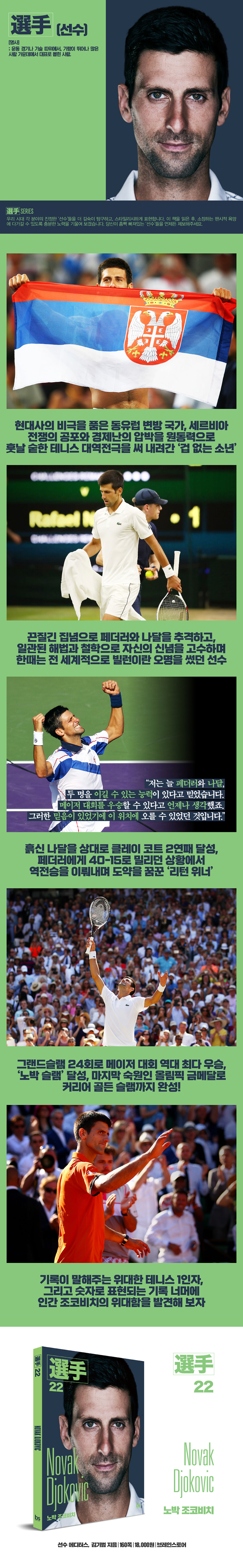 --- 「지하 벙커와 폭격」 중에서 이것이 얼마나 대단한 기록이냐면, 나달은 2001년을 시작으로 프로페셔널 커리어를 통틀어 클레이 코트에서 특정인에게 연패를 허용한 적이 없었다. 2005년 그가 흙신에 등극한 이후 81연승을 내달리다 로저 페더러에게 함부르크 마스터스에서 제동이 걸린 적 있었지만, 나달은 결코 클레이에서 두 번 연속 패배를 내주지 않았다. 그런데 2011년 그 ‘언빌리버블한’ 사건이 발생간 한 것이다. 조코비치는 클레이에서 열리는 마스터스 시리즈인 마드리드 오픈과 로마 오픈에서 두 번 연속, 그것도 결승전에서 나달을 꺾고 챔피언에 올랐다. --- 「2011」 중에서 연대기적으로 봤을 때 조코비치의 우승은 그의 커리어 그랜드슬램 달성보다 더 위대한 의미가 있었다. 남자 테니스에서 47년 묵은 기록이 달성된 순간이었기 때문이다. 4대 메이저 대회를 순차적으로 한꺼번에 우승한 47년 만의 위업, 바로 ‘노박 슬램’의 완성이었다. --- 「노박 슬램」 중에서 조코비치는 현역 선수 가운데 가장 서브를 잘 넣는 페더러를 상대로, 그것도 서브가 가장 위력을 발휘하기 좋은 조건인 잔디 코트에서 역전에 성공했다. 심지어 두 개의 챔피언십 포인트에 몰려 있는 벼랑 끝 상황이었지만, 역대 최고의 선수 1인으로 추앙받은 페더러를 좌절시킨 것이다. 그 어느 때보다 분명한, 대권 교체의 신호탄이었다. --- 「40-15의 전설」 중에서 2008년 베이징올림픽을 시작으로, 2012년 런던올림픽, 2016년 리우올림픽과 2021년 도쿄올림픽까지, 그토록 조코비치를 좌절시켰던 지난 15년간의 올림픽 잔혹사를 마침내 극복한 순간이었다. 올림픽 금메달 획득을 위한 그의 집념과 헌신은 경기장에 모인 관중들을 숙연하게 만들 정도였다. 조국 세르비아를 위해 금메달을 선물하고 싶은 진심이 전달됐고, 우승을 확정한 뒤 땅바닥에 엎으려 손에 파르르 경련이 이는 장면에서는 전율이 느껴졌다. --- 「“다 이루었도다”」 중에서 |