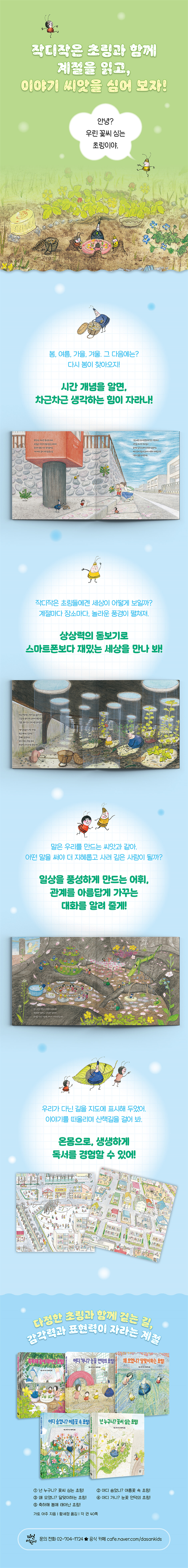 스마트폰보다 더 재밌는 세상을 보여 주는 책 작디작은 초링의 시선으로 보면 고양이는 집채만큼 크고, 운동화는 하늘을 나는 비행기만 하다. 이렇게 조그마한 생명체에 맞춰 그려진 세상은 마치 돋보기를 들이댄 것처럼 익숙한 풍경을 낯설고 새롭게 보여 준다. 길가의 들꽃, 맨홀 뚜껑 하나도 이야기 속에서는 커다란 배경이 되는 것이다. 이처럼 일상을 새롭게 비추는 시각은 아이의 상상력을 넓히고 관찰력까지 길러 준다. 초링들이 동네 구석구석을 누비며 겪는 일들은 계절마다 다채롭고, 장소에 따라 특별하다. 언제 어디서나 모험을 찾는 어린이에게 초링들은 마치 동네를 함께 뛰노는 친구처럼 느껴진다. 책의 마지막 장에는 초링들이 다녀간 동네 지도가 수록되어 있어, 이야기를 다시 떠올리며 공간 감각까지 함께 키워 볼 수 있다. 스마트폰에 갇힌 요즘 아이들에게, 〈초링 시리즈〉는 더 크고 생생한 세상을 만나게 해 줄 소중한 기회가 될 것이다. 일상을 풍성하게 만드는 어휘, 관계를 아름답게 만드는 표현이 가득한 이야기 모든 사람은 어린 시절에 쓰는 말을 씨앗 삼아, 세상을 이해하고 자신을 표현하는 수단을 만들어 나간다. 그만큼 어린이가 듣고 읽는 어휘와 표현은 사려 깊고 다정하며, 생활 속에서 유용하게 쓰일 수 있어야 한다. 〈초링 시리즈〉에는 계절마다 피는 다양한 들꽃, 날씨 변화, 동네의 풍경 등에 대한 구체적이고 정감 어린 표현이 가득하다. 들꽃의 이름을 부르고 공원과 길가의 풍경을 묘사하는 글을 읽으며, 아이는 일상에서 직접 사용할 수 있는 어휘들을 자연스럽게 익히게 된다. 또한 초링들은 언제나 함께 행동하며 서로를 돌본다. 함께 밥상을 차리고 씨앗을 모으며, 친구들과 축제를 즐기기도 한다. 이런 이야기 장면을 통해 아이들은 "도와줘.", "괜찮아?", "축하해.", “같이 하자.” 같은 사회적 언어, 즉 부탁하고 공감하고 협동하는 표현을 자연스럽게 배울 수 있다. 이처럼 이 책은 아이들이 언어의 뿌리를 만들고, 말로 관계 맺는 힘을 차곡차곡 키워 가는 데 든든한 밑거름이 되어 줄 것이다. 산책길에 배우고 추억을 쌓는, 온 가족의 생생한 독서 경험 〈초링 시리즈〉는 글과 그림을 넘어, 가족이 함께 살아 있는 독서를 실천할 수 있도록 돕는다. 책 속에는 실제 동네에서도 만날 수 있는 들꽃과 식물들이 등장하고, 계절에 따라 다채로운 자연의 모습이 섬세하게 담겨 있다. 책을 들고 산책을 나서면, 아이는 금세 “이 꽃, 책에서도 봤어!”, “초링이 지나간 길이랑 비슷해!” 하고 외칠 것이다. 그렇게 책과 현실이 연결되는 순간, 독서는 눈으로만 읽는 활동이 아니라 발로 걷고, 입으로 말하고, 마음으로 기억하는 일이 된다. 같은 들꽃이라도 계절마다 다른 모습으로 자라는 것을 관찰하며 자연에 대한 감수성도 함께 자라난다. 〈초링 시리즈〉를 통해 아이와 부모가 함께 책을 읽고, 함께 길을 걷고, 함께 이야기를 나누는 선물 같은 시간을 경험해 보자. 다정한 초링과 함께 걷는 길, 감각력과 표현력이 자라는 계절 작디작은 생명체, 초링은 꽃씨를 심으며 계절을 살아간다. 들꽃 사이를 오가고, 함께 먹을 꽃잎을 모으며, 서로를 챙기고 돌본다. 〈초링 시리즈〉는 초링들의 하루와 계절 속 이야기를 따라가며, 자연의 흐름과 생명의 순환을 아이의 시선에 맞춰 섬세하게 담아낸 그림책이다. 《넌 누구니? 꽃씨 심는 초링!》은 봄을 배경으로, 보도블록 사이와 돌담 틈에 꽃씨를 심으러 다니는 초링들의 하루를 그린 이야기다. 꽃씨를 품은 채 동네 곳곳을 누비던 초링들은 길에서 새 학기를 맞아 유치원에 가는 아이와 마주친다. 꽃이 피듯 새로운 시작을 맞이하는 아이의 일상이, 초링들의 봄날과 자연스럽게 겹쳐진다. 《어디 숨었니? 여름꽃 속 초링!》은 한여름 뜨거운 햇볕을 피해 그늘을 찾고, 갑작스러운 소나기에 꽈리 속으로 숨는 초링들의 이야기를 담고 있다. 여름꽃 사이를 바쁘게 오가는 초링들의 모습과 함께, 시원하게 물놀이를 즐기는 아이들의 여름날 풍경이 어우러진다. 《왜 모였니? 달맞이하는 초링!》은 보름달이 뜬 가을밤, 모두가 모여 풍성한 축제를 여는 이야기다. 초링들이 춤을 추며 음식을 나누는 장면은 우리 명절, 추석을 따뜻하게 떠올리게 한다. 《어디 가니? 눈꽃 언덕의 초링!》은 추운 겨울을 보내기 위해 초링들이 따뜻한 할머니 댁으로 떠나는 이야기다. 눈 내리는 여행길을 따라 도착한 집에는 친척과 친구들이 함께 모여 있다. 겨울방학 동안 친척 집을 찾아가는 아이들의 일상과 닮은 풍경이 포근하게 펼쳐진다. 《언제 만나? 봄에 돌아온 초링!》에서는 새로 태어난 아기를 축하하는 파티가 열린다. 모두가 함께 모여 축하하고, 기뻐하며, 선물을 나누고, 봄의 귀환을 반긴다. 계절이 다시 돌아오듯, 매년 찾아오는 생일의 설렘과 따뜻한 기억을 떠올리게 한다. 〈초링 시리즈〉는 자연의 변화와 어린이의 일상이 아름답게 어우러지는 이야기다. 계절을 온몸으로 느끼고, 가족과 함께 시간을 보내며 자라는 아이들에게, 이 책은 함께 걷는 다정한 친구이자 늘 곁을 지켜 주는 포근한 배경이 되어 줄 것이다. |
