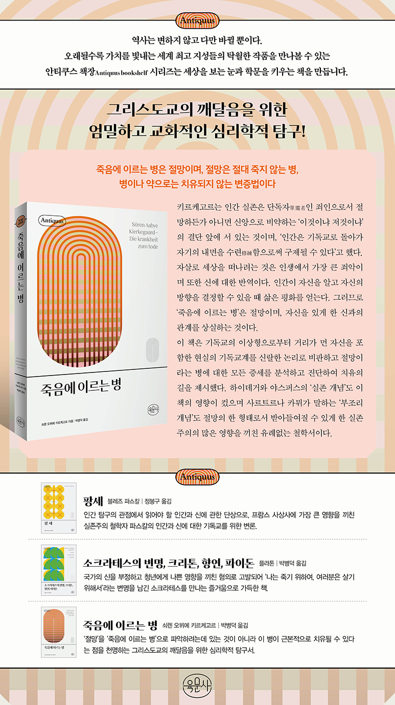 기독교계에 기독교를 끌어들일 『죽음에 이르는 병』은 자신의 상처를 통해 불안과 절망에 고뇌하는 근대적 인간의 모습을 적나라하게 폭로한다. 이 세상에 진리는 수난에 의해 밝혀지고 그리스도는 수난을 위하여 이 세상에 온 것이다. 그러므로 그리스도를 따르는 자는 당연히 몰락을 각오해야 한다. 참으로 진리에 따르고자 하는 사람은 누구나 순교자여야 하며, 이 세상의 지혜와는 반대로 신에게 선택된 자라면 누구보다도 깊이 고뇌해야 한다. 이처럼 신과의 관계는 박해받고 순교하는 것이므로 참된 그리스도교는 대중의 종교일 수 없다. 기독교인이 되는 길은 자기 자신의 죄의식에 의해 자기 스스로 결단하는 길밖에 없으므로 기독교인이 되기 위해서는 혼자이지 않으면 안 된다. 각자가 오직 하나의 인간으로서 신 앞에 서야 한다고 키르케고르는 말한다. 키르케고르에게 있어 인간은 ‘정신’이며 그 ‘정신’은 곧 ‘자기’였다. 인간은 무언가에 대해 절망함으로써 자기 자신에 대해서도 절망하며 자기 자신으로부터 탈출하려 한다. 절망이란 자기의 ‘영원한 것’을 상실한 상태이며 절망의 강도는 인간 실존에 대한 인식의 강도에 따라 상승한다. 인간에게 있어서 이러한 절망이 곧 ‘죽음에 이르는 병’이며 인간은 절망을 통해서만 진실로 구제될 수 있다. 사람들은 절망을 ‘병’으로 받아들이고 ‘약’으로는 이해하지 않는다. 한 마디 덧붙이면 죽음에 이르는 병이란 자칫 죽을 병, 즉 그것으로 죽어 버리는 병처럼 그런 의미의 병이 아니라 그것으로는 절대 죽지 않는 병이며 죽으려야 죽을 수 없는 병이다. 역설적으로 ‘절망’이란 바로 그런 것이다. 죽어서 또는 자살해서 묘지에 안주할 수 있다면 그것은 아직 절망의 극치라고 할 수 없다. 죽으려야 죽을 수 없는 것, 끊임없이 죽음에 직면하고 죽음에 이르면서도 죽을 수 없는 것, 그러고 영원히 죽지 않으면 안 되는 것, 이것이 절망하는 사람 또는 가장 불행한 사람의 참모습이다. 키르케고르는 인간 실존은 단독자(單獨者)인 죄인으로서 절망하든가 아니면 신앙으로 비약하는 ‘이것이냐 저것이냐’의 결단 앞에 서 있는 것이며, ‘인간은 기독교로 돌아가 자기의 내면을 수련(修練)함으로써 구제될 수 있다’고 했다. 이 책은 기독교의 이상형으로부터 거리가 먼 자신을 포함한 현실의 기독교계를 신랄한 논리로 비판하고 절망이라는 병에 대한 모든 증세를 분석하고 진단하여 치유의 길을 제시했다. 하이데거와 야스퍼스의 ‘실존 개념’도 이 책의 영향이 컸으며 사르트르나 카뮈가 말하는 ‘부조리 개념’도 절망의 한 형태로서 받아들여질 수 있게 한 실존주의의 많은 영향을 끼친 유례없는 철학서이다. |