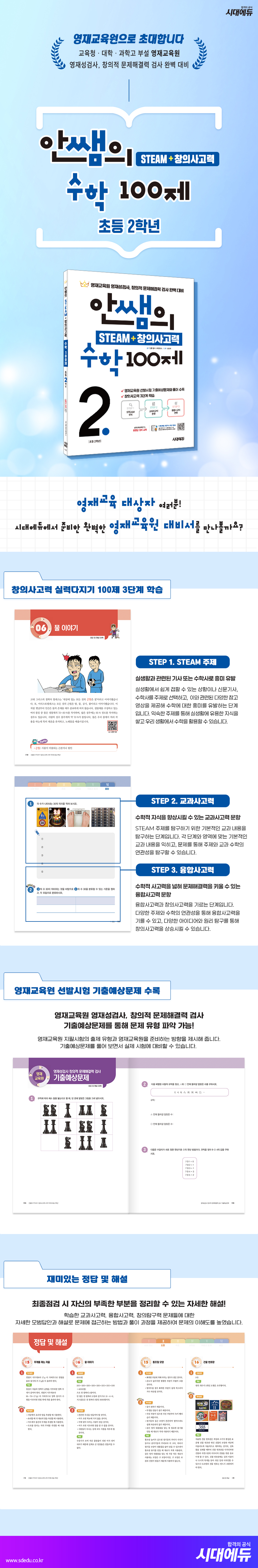 ·창의사고력 실력다지기 100제 3단계 학습 STEP 1. STEAM주제 실생활과 관련된 기사 또는 수학사로 흥미 유발 STEP 2. 교과사고력 수학적 지식을 향상시킬 수 있는 교과사고력 문항 STEP 3. 융합사고력 수학적 사고력을 넓혀 문제해결력을 키울 수 있는 융합사고력 문항·영재교육원 선발시험 기출예상문제 및 풀이 수록