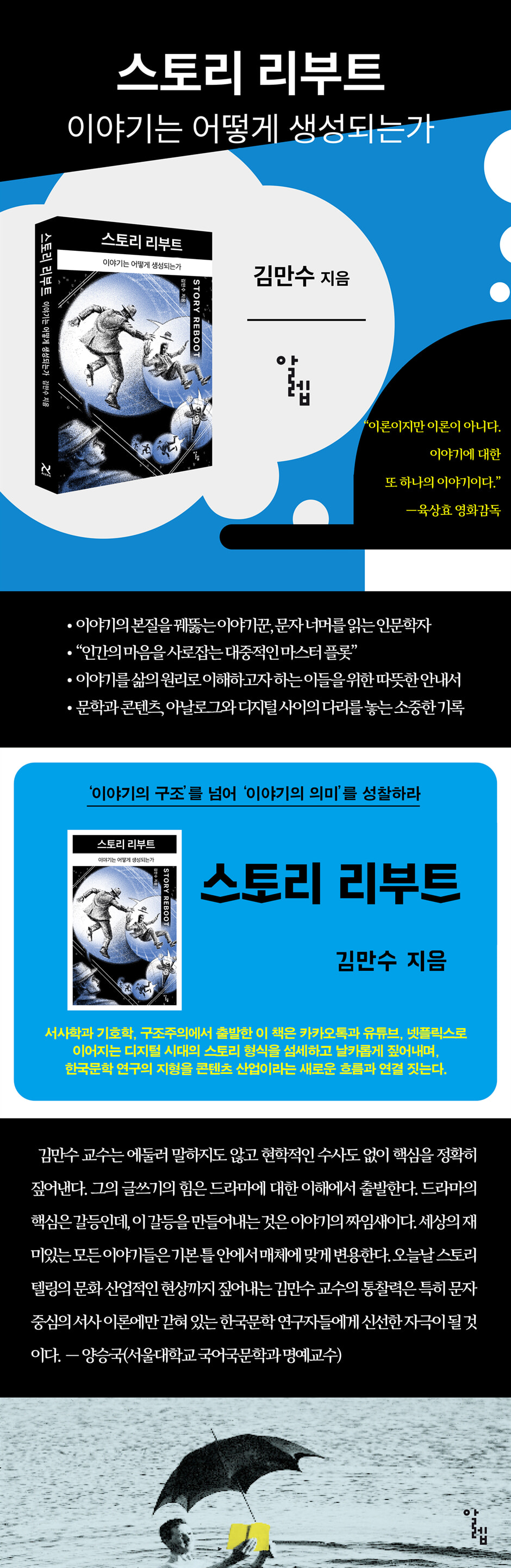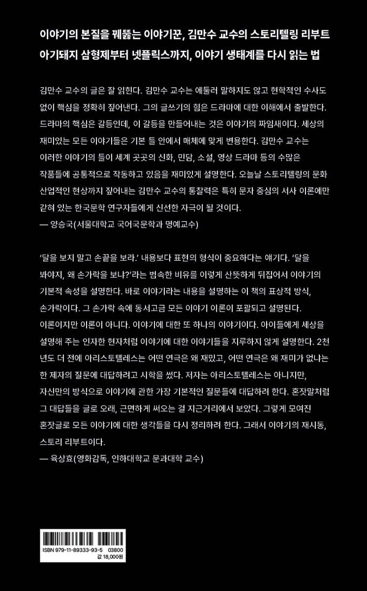 ‘달을 보지 말고 손끝을 보라.’ 내용보다 표현의 형식이 중요하다는 얘기다. ‘달을 봐야지, 왜 손가락을 보냐?’라는 범속한 비유를 이렇게 산뜻하게 뒤집어서 이야기의 기본적 속성을 설명한다. 바로 이야기라는 내용을 설명하는 이 책의 표상적 방식, 손가락이다. 그 손가락 속에 동서고금 모든 이야기 이론이 포괄되고 설명된다. 이론이지만 이론이 아니다. 이야기에 대한 또 하나의 이야기이다. 아이들에게 세상을 설명해 주는 인자한 현자처럼 이야기에 대한 이야기들을 지루하지 않게 설명한다. 2천 년도 더 전에 아리스토텔레스는 어떤 연극은 왜 재밌고, 어떤 연극은 왜 재미가 없냐는 한 제자의 질문에 대답하려고 시학을 썼다. 저자는 아리스토텔레스는 아니지만, 자신만의 방식으로 이야기에 관한 가장 기본적인 질문들에 대답하려 한다. 혼잣말처럼 그 대답들을 글로 오래, 근면하게 써오는 걸 지근거리에서 보았다. 그렇게 모여진 혼잣글로 모든 이야기에 대한 생각들을 다시 정리하려 한다. 그래서 이야기의 재시동, 스토리 리부트이다. - 육상효 (영화감독, 인하대학교 문과대학 교수)