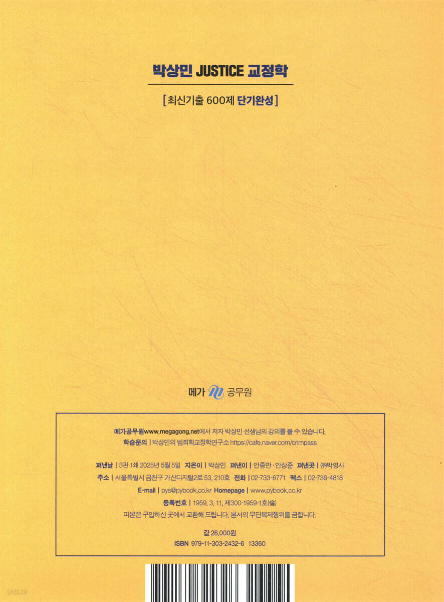 CHAPTER 01 교정학의 이해 CHAPTER 02 교정시설과 수용제도론 CHAPTER 03 수용자의 지위와 처우 CHAPTER 04 시설 내 처우 Ⅰ CHAPTER 05 시설 내 처우 Ⅱ CHAPTER 06 사회적 처우 CHAPTER 07 지역사회교정 CHAPTER 08 가석방과 시설 내 처우의 종료 CHAPTER 09 교정의 민영화와 한국교정의 과제 PART 02 형사정책 CHAPTER 01 형사정책 일반론 CHAPTER 02 형사정책의 발전과정 CHAPTER 03 범죄원인론 CHAPTER 04 범죄예방 및 범죄방지대책 CHAPTER 05 형벌론 CHAPTER 06 보안처분론 CHAPTER 07 소년범죄와 그 대책 최신기출 2025년 [교정9급] 교정학개론 |