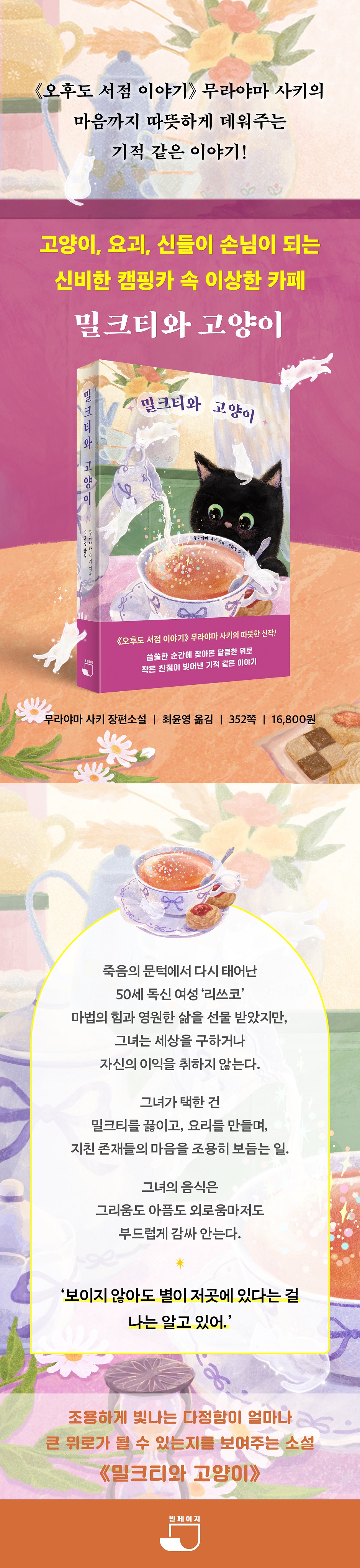 삶을 지탱할 원동력을 주는 이야기 주인공 리쓰코는 어릴 때부터 사람을 좋아했지만 지나치게 내성적인 성격 탓에 혼자서 무리를 지켜보는 삶을 살아왔다. 리쓰코는 독감 때문에 병원에 갔다가 환자가 많은 것을 보고 그대로 발길을 돌리는, ‘기침 때문에 괴로운 자신보다 더 아픈 사람들이 많을 거라고 여기’(p. 60)는 인물이다. 다른 사람을 위해 자신의 아픔은 묵묵히 견뎌내는 리쓰코의 모습을 보면 지나치게 미련하다는 생각이 들 수도 있다. 그러나 나보다 다른 존재를 먼저 생각하는 착한 마음은, 리쓰코만의 용기이자 삶을 가치 있게 이끄는 원동력이 된다. 고양이는 살기 위해 적극적으로 노력하고 있었다. 귓가에 울리던 환청이 진짜라면, 이 아이는 다시 태어나기를 반복해 리쓰코에게 겨우 돌아왔으니 괜히 또 죽을 생각은 없을 것이다. 리쓰코는 미소 지었다. 그렇다면 자신도 죽을 수는 없다. (p. 62) 아픈 길고양이를 돌보며 집안의 화초를 살피고, 성실하게 일하며 살아온 리쓰코의 삶은 언뜻 평범해 보이지만, 그녀가 돌봤던 무수한 존재를 떠올리면 경이로운 마음까지 들게 한다. 나와 다른 대상을 보살핀다는 건 결코 쉬운 일이 아니다. 그럼에도 소설 속 리쓰코는 그 일이 정말 좋아서 하는 게 느껴지는데, 좋아하는 밀크티를 끓이고 달달한 디저트를 준비하며 아픈 고양이까지 돌보는 리쓰코의 모습은 생동감이 넘친다. 좋아하는 것을 즐기며 나와 다른 것을 소중히 하는 마음이 리쓰코의 세상을 지탱한다. ‘보이지 않아도 별이 저곳에 있다는 걸 나는 알고 있어.’(p. 311)라는 리쓰코의 독백처럼, 세상에 가려진 무수한 존재를 떠올리게 하는 이 책은 삶의 의미를 다시 새겨볼 순간을 선물할 것이다. 생명에 대한 공감이 이 소설의 시작 환상과 현실을 오가는 ‘이상한 카페 네코미미’ 아동문학에서도 두각을 나타낸 작가답게, 장면마다 동화적 상상력을 느낄 수 있는 것도 이 책의 매력이다. 특히 그림책 《아기 고양이 토토》, 《레미 할머니의 서랍》, 《왕의 과자》로 국내 독자들에게도 잘 알려진 구라하시 레이의 삽화는 소설의 여운을 더욱 짙게 한다. 무라야마 사키만의 섬세한 묘사는 삶의 흔적이 베인 집안의 풍경과 그 안에 스민 향마저 생생하게 떠올리게 하며 맛과 긴밀하게 이어지는 기억까지 연결시킨다. 특히 리쓰코가 준비하는 요리들을 하나하나 따라가다 보면 음식의 식감과 향이 머릿속에 맴도는 듯한 느낌마저 준다. 작가는 맛을 통해 기억을 떠올려 본 경험을 소중히 느끼게 하며, 인물이 내면을 직면하는 순간까지 탁월하게 배치한다. “생각지도 못한 병이 유행하면서 좀처럼 상황이 수습되지 않고, 바다 건너에서는 비참한 침략 전쟁이 계속되고 있습니다. 매일 많은 생명이 사라지는 것. 그걸 너무 가볍게 취급하는 것에 고뇌하고 신음하는 일이 많은 날들입니다. 이럴 때일수록 사소하게 여겨지는 우리의 삶에 의미가 있다고 쓰고 싶었는지도 모릅니다.”(p. 350) _ 작가의 말 중에서 '작가의 말'에서 보다시피, 이 소설은 전쟁과 생명의 가치에 대한 고뇌로부터 시작된 이야기라는 걸 추측할 수 있다. 《밀크티와 고양이》는 마법사와 고양이, 요괴와 유령에서부터 신까지 나오는 소설이지만 그 누구도 악한 캐릭터가 없다. 이들 모두 저마다의 사연을 갖고 세상을 지키고 보살피는 존재들이다. 이처럼 우리와 다른 존재를 특이하거나 특별하다고 구분 짓지 않고, 보편적 존재로 여기는 마음가짐이 평화로운 세상을 만든다. 씁쓸한 마음을 위로하고 내일을 향한 용기를 전해줄 《밀크티와 고양이》와 함께 차 한 잔의 여유를 가지며 따뜻하고 향기로운 시간을 만끽하길 바란다. |