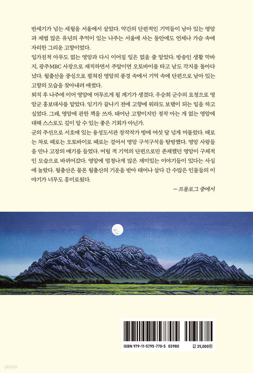 일주일 이상 차를 몰고 영암 이곳저곳을 탐방하고 있는 중인데, 몇 군데를 제외하고 어디를 가든 월출산이 보인다. 바라보는 앵글이나 거리에 따라 그 모습은 달라질지언정 월출산은 하루 스물네 시간 일년 삼백육십오일 사람들의 시야를 지배한다. 옛날 옛적 사람들도 그랬을 것이다. 너른 평야에 갑툭튀한 거대한 바윗덩어리. 영암은 곧 바위였다. 지명의 유래가 되었다는 전설이 있다. 전국 여기저기 흔히 보는 유의 전설이다. 중국 사람들이 조선땅에 큰 인물이 날 것을 우려해 해꼬지를 했고, 우리 조상들은 그걸 어떤 식으로든 극복했다는. 옛날 월출산 꼭대기에 동석(움직이는 돌)이 셋 있었다. 큰 인물이 날 것을 염려한 중국사람들이 동석을 세게 밀어 전부 떨어뜨려버렸는데, 그중 하나가 스스로 굴러 제자리로 돌아왔다. 이후 사람들은 이 고장을 영암이라고 불렀다. ---「15~16쪽 ‘영암, 왜 지명이 신령스런 바위(靈巖)일까’」중에서 세조실록에 재미있는 기록이 있다. 세조 3년인 1457년 4월 16일자 기사다. 임금이 별진상(別進上)을 없애라는 교지를 내렸는데도 전라도 관찰사 송처관이 건어란을 바쳤으니 형조가 조사해 보고하라고 지시했다는 내용이다. 세조는 정례 진상이 아닌 별도의 진상품을 마련하기 위해 겪어야 하는 지방관아와 백성들의 고통을 잘 알고 있었다. 관찰사라는 자가 남들 안 할 때 아부해서 돋보이려고 바친 진상품이 건어란이었다는 사실이 흥미롭다. 어떤 생선알로 만든 것인지 분명하진 않지만 그냥 말린 생선알이 아니라 엄청나게 공들여 만든 어란이었을 것이다. 전라도 관찰사였으니 송처관이 바친 어란은 영암어란이었을 가능성이 크다. 어란은 숭어 외에도 민어, 청어, 조기알로도 만들었지만 숭어알로 만든 것을 최고로 쳤다. 최태근 명장도 한때 민어알로 어란을 만든 적이 있었지만 그만두었단다. 숭어알에 없는 충이 있었다. 먹어도 지장은 없지만 꺼림칙했다. 현재는 오로지 숭어알로만 만들고 있다. ---「85쪽 ‘임금님께 바친 영암어란’」중에서 트로트 가수 명예의 전당. 유명 가수들의 사진 액자들로 채워져 있다. 영암 출신으로는 단연 하춘화가 있다. 오랜 무명생활 끝에 ‘땡벌’로 유명해진 가수 강진도 있다. 영암 출신인 걸 처음 알았다. 이발소, 손님들의 리퀘스트를 받아 틀어주던 DJ박스가 있는 다방, 문방구, 극장 매표소 등을 재현해 놓았다. 2층으로 올라가는 계단 아래는 옛날 주조장 바깥 풍경이다. 검은 자전거가 세워져 있다. 순식간에 먼 유년시절로 타임슬립했다. 술심부름이었을까. 아버지가 타던 큰 짐바리 자전거를 타고 가다 2미터는 될 개천 아래로 떨어진 적이 있었다. 안장에 앉으면 페달에 다리가 닿지 않아 안장 아래 프레임 안으로 한 다리를 집어 넣고 비스듬히 매달려 페달을 돌렸다. 그러다 균형이 무너져 추락했는데 개천 옆 돌밭이었다. 다행히 다친 데 하나 없이 멀쩡했다. 가난했지만 즐거웠던 시절이다. 그립다. 극장에서는 서너 명의 관객이 하춘화 다큐를 관람하고 있고 옆에 있는 노래방에선 반짝이 재킷에 모자를 쓰고 제법 가수 흉내를 내며 노래하는 이들이 있다. ---「106~107쪽 ‘기찬랜드 한국트로트가요센터’」중에서 월출산의 큰바위얼굴은 뉴햄프셔주 큰 바위 얼굴과는 비교할 수 없을 정도로 멋지다. 옆 얼굴이 아니라 거의 정면이고, 크기도 8배 이상이나 된다(월출산 큰바위얼굴 높이 100m vs 뉴햄프셔주 큰바위얼굴 높이 12m). 다만, 불리한 것은 뉴햄프셔주의 큰바위얼굴은 평지에서 보이는데 반해 월출산의 큰바위얼굴은 산에 올라야만 볼 수 있다는 것이다. 하지만, 이것도 설명하기 나름이다. 성스러운 얼굴을 알현하는데 조금의 수고도 들이지 않는다면 그게 더 이상하지 않은가. 뉴햄프셔주 큰 바위얼굴보다 해발로 200미터 정도 낮은 해발 750m 정도 높이에 위치한 월출산 큰바위얼굴은 몸이 불편한 사람에게는 힘들겠지만, 웬만한 보통 사람이라면 크게 어렵지 않게 올라가 볼 수 있다. 월출산, 나아가서 영암을 상징하는 엠블럼으로 이보다 좋은 게 있을까. 큰바위얼굴을 메타 엠블럼으로 삼고 그 아래 각종 특산품, 공예품, 관광지 마크를 사용하는 것도 얼마든지 가능할 것이다. 캐릭터 상품을 만드는 데도 큰바위얼굴한 게 없다. ---「125~126쪽 ‘큰 바위 얼굴, 뉴햄프셔주와 영암’」중에서 1930년대 어느 해 여름, 당산나무로 마을 사람들의 섬김을 받던 이팝나무에 벼락이 떨어졌다. 김창오 씨가 쓴 책 ‘모정마을 이야기’를 보면 말 그대로 마른 하늘에 날벼락이었던 모양이다. 나무 아래에서 낮잠을 자고 있던 해전 하네(=할아버지)는 벼락 때문에 귀가 먹었다. 시끄럽게 울던 매미들은 우박처럼 우수수 땅바닥에 떨어졌다. 벼락에 맞는 순간, 나무 속 수맥을 따라 흐른 수억 볼트의 전기로 이팝나무의 몸은 폭발하듯 터지고 수천 도 뜨거운 불에 휩싸였을 것이다. 몸통의 반이 떨어져 나가고 중화상을 입은 이팝나무는 그러나 용케 살아남았다. 가장 잘 알려진 이팝나무의 유래는 꽃송이가 사발에 담은 흰 쌀밥 같아서 이밥나무라 하던 것이 이팝나무로 변했다는 것이다. 다른 설은 여름으로 들어가는 입하에 꽃이 피는 나무