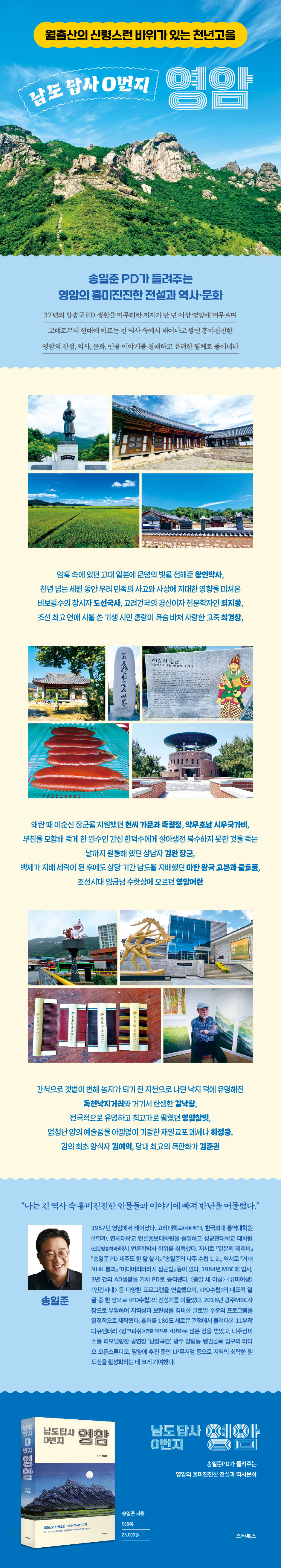 “나는 긴 역사 속 흥미진진한 인물들과 이야기에 빠져 반년을 머물렀다” 퇴직 후 저자가 꿈꾸는 제2의 인생은 이곳저곳을 여행하면서 일 년에 한 권 정도 책을 쓰는 여행 작가의 삶이다. 저자의 첫 번째 결실은 '제주도 한 달 살기'였다. 한 달 간의 제주도 체류와 여행의 경험을 술술 읽히는 구어체와 유머러스한 필체로 엮어낸 '제주도 한 달 살기'는 440페이지에 달하는 적지 않은 분량에도 불구하고 많은 독자들의 환영을 받았고 지금도 받고 있다. 두 번째 결실은 '나주수첩'이란 타이틀로 나온 두 권의 여행서다. 저자는 전주와 함께 전라도란 명칭의 유래가 된 천년고도 나주에서 일 년을 살았다. 구석구석을 발로 뛰며 저자가 길어 올린 나주의 역사 문화 인물들의 이야기는 나주배 말고는 별반 알려진 게 없는 나주를 알리고 나주에 관해 아는 데 크게 도움이 되는 가이드북이다. 세 번째 타이틀을 고민하던 저자가 영암을 선택한 계기가 있었다. 영암군수가 저자에게 영암군 홍보대사를 맡아 달라 요청했기 때문이다. 저자의 마음속에 고향에 대한 사랑에 더해 영암을 널리 알려야겠다는 의무감이 생겼다. 『남도답사 0번지 영암』은 무려 560 페이지에 달하는 두꺼운 책이다. 가뜩이나 책이 안 팔리는 시대. 어찌 보면 출판사로선 무모한 모험일 수도 있다. 하지만 출판사는 상업적으론 불리할지 모르지만 월출산 말고는 거의 알려진 것이 없는 영암을 제대로 알리려면 최소한 이 정도 내용은 담아야 하지 않겠느냐는 저자의 의견을 존중했다. 『남도답사 0번지 영암』책에 담긴 소재는 다양하다. 암흑 속에 있던 고대 일본에 문명의 빛을 전해준 왕인박사, 천년 넘는 세월 동안 우리 민족의 사고와 사상에 지대한 영향을 미쳐온 비보풍수의 창시자 도선국사, 고려건국의 공신이자 천문학자인 최지몽, 조선 최고의 연애 시 묏버들가를 쓴 기생 시인 홍랑이 목숨 바쳐 사랑한 고죽 최경창, 왜란 때 이순신 장군을 지원하고 교류했던 현씨 가문과 죽림정, 부친을 모함해 죽게 한 원수인 간신 한덕수에게 살아생전 복수하지 못한 것을 죽는 날까지 원통해 했던 상남자 김완 장군, 을미왜변의 영웅 양달사 장군 같은 위대한 인물들의 스토리는 영암이란 지명의 유래가 된 월출산의 정기가 예사롭지 않음을 증거 한다. 고대, 백제가 지배적인 세력이 된 후에도 상당한 기간 남도를 지배했던 마한 왕국들의 고분과 출토품의 모습은 신기하고 대단하다. 조선시대 임금님 수랏상에 오르던 영암어란, 간척으로 갯벌이 변해 농지가 되기 전 지천으로 나던 낙지 덕에 유명해진 독천낙지거리와 거기서 탄생한 갈낙탕, 전국적으로 유명하고 최고가로 팔렸던 영암참빗 이야기도 재밌다. 영암이 배출한 인물들을 소개하는 장에서는 지금 전 세계에 열풍을 불러일으키고 있는 김의 최초 양식자 김여익은 영암 사람이다. 당대 최고의 목판화가 김준권, 인생은 미완성 숨어 우는 바람소리 등 300곡이 넘는 유명 가요를 작사·작곡한 음악가 김지평, 영암아리랑을 불러 영암을 알리는 데 지대한 공헌을 한 가수 하춘화의 고향은 영암이다. 상상을 초월하는 엄청난 양의 예술품을 아낌없이 기증한 재일교포 메세나 하정웅의 스토리는 감동적이다. 하정웅의 부모는 일본에 살면서 평생 고향 영암을 그리워했다. 영암에 하정웅이 기증한 작품들로 세운 군립하정웅미술관이 있는 까닭이다. 영암에는 지역 이상의 흥미진진한 전설과 역사를 참 많은 고장으로 과연 남도 0번지답다. ─월출산 아래 있는 호남의 으뜸 명촌 구림마을에서 위대한 세 명의 인물이 태어났다. 고대 일본에 문명의 빛을 전한 왕인박사, 땅과 자연에 대한 우리 민족의 사고에 깊숙이 뿌리내린 비보풍수사상의 창시자 도선국사, 고려의 건국 공신이자 당대 최고의 천문학자 최지몽. ─통일신라 말. 구림마을 한 처녀는 월출산 빨래터에 떠내려 오는 오이를 먹고 배가 불러 도선국사를 낳았다. ─조선 최고의 연애 시 묏버들가를 쓴 기생 홍랑은 뛰어난 시인으로 명성이 자자했던 영암 출신 선비 최경창을 지독히 사랑했다. 관습과 신분을 초월해 기생 시인 홍랑과 인격적으로 교감하고 사랑했던 선비 최경창을 기념하는 고죽관이 구림마을에 있다. ─임금님께 진상했던 영암어란. 더운 여름날, 학질에 걸린 병자에게 찬물에 만 흰밥에 영암어란 한 조각을 얹어 먹이면 자리를 훌훌 털고 벌떡 일어났다. 영암에는 세계 최고로 맛있는 어란을 만드는 장인이 있다. ─소년 김완은 원수를 갚기 위해 문신의 꿈을 버리고 무인이 됐다. 부친을 모함해 죽게 한 간신 한덕수를 죽이려 두 번 시도했다가 실패했다. 전쟁 영웅으로 벼슬이 높아졌지만 죽을 때까지 부친의 원수를 갚지 못한 것을 한으로 여겼다. 저자는 호랑이장군 김완보다 효자이자 상남자 김완에게 끌린다. ─월출산 구정봉은 봉우리 전체가 사람 얼굴을 한 거대한 바위다. 명암대비로 얼굴이 또렷이 드러나는 정오 무렵, 전망대에 앉아 큰 바위 얼굴을 응시하면 순간 신비로운 기운에 사로잡힌다. 영암이 예로부터 기가 센 고장으로 알려진 데는 까닭이 있다. 또한 『남도답사 0번지 영암』엔 또 전작들처럼 저자가 좋아하는 카