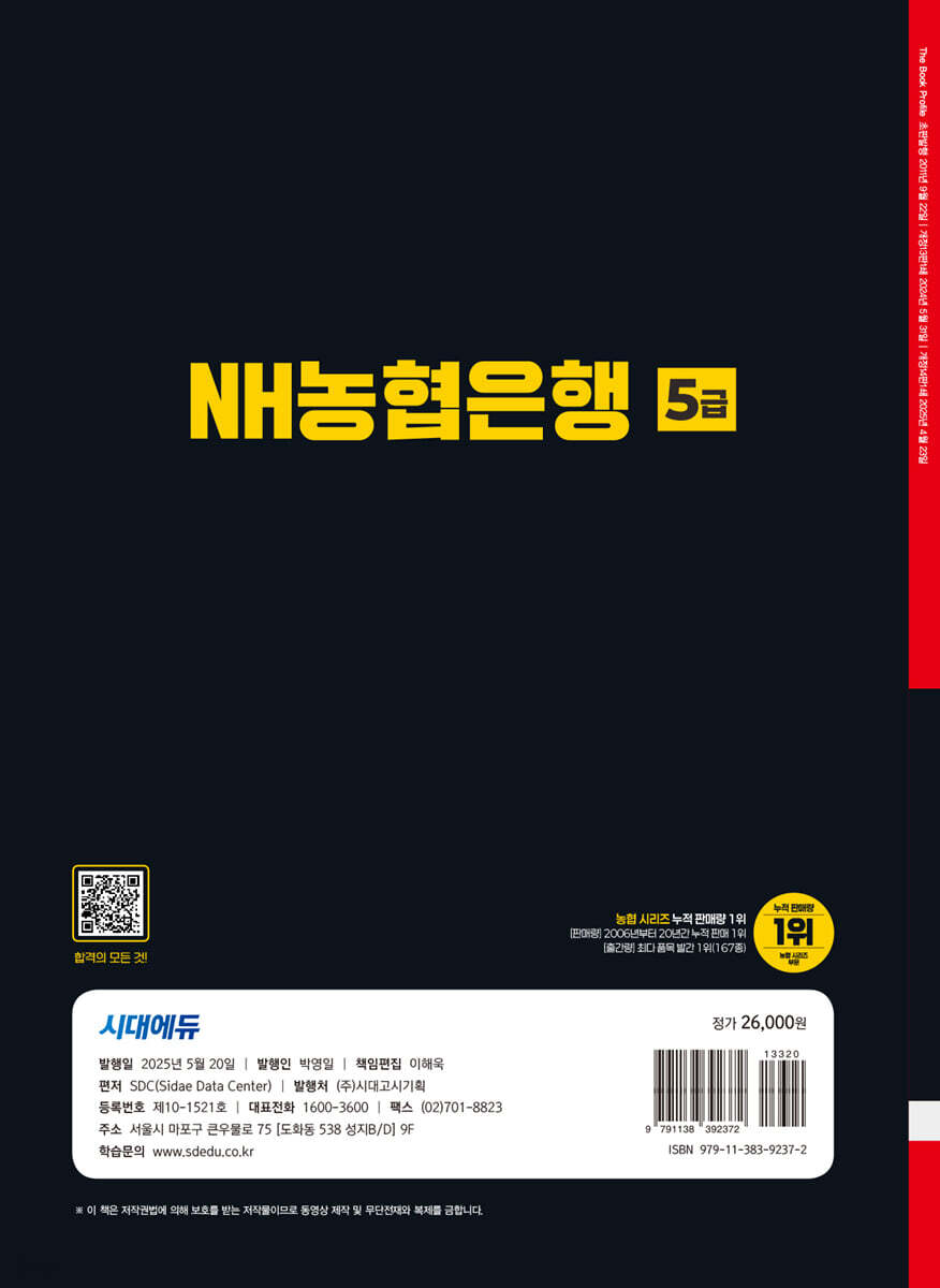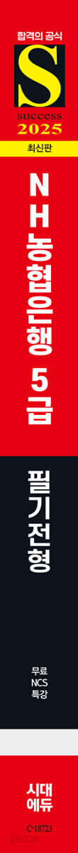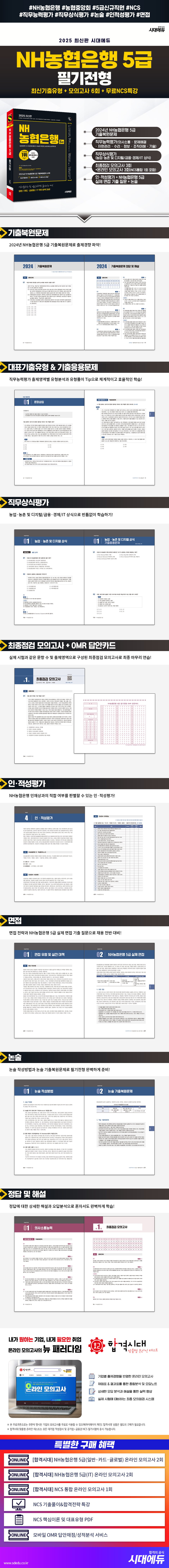 1. 직무능력평가(의사소통 · 문제해결 · 자원관리 · 수리 · 정보 · 조직이해 · 기술) 2. 직무상식평가(농업 · 농촌 및 디지털 / 금융 · 경제 / IT 상식) 3. 최종점검 모의고사 3회 + 온라인 모의고사 3회(직무별 2회+NCS통합 1회 포함) 4. 인 · 적성평가 + NH농협은행 5급 면접 기출 질문+논술 [특별혜택] 1. [합격시대] NCS 통합 온라인 모의고사 1회 2. [합격시대] NH농협은행 5급(일반 · 카드 · 글로벌) 온라인 모의고사 2회 3. [합격시대] NH농협은행 5급(IT) 온라인 모의고사 2회 4. NCS 특강 무료쿠폰 5. NCS 핵심이론 및 대표유형 PDF 6. 모바일 OMR 답안채점/성적분석 서비스 |
