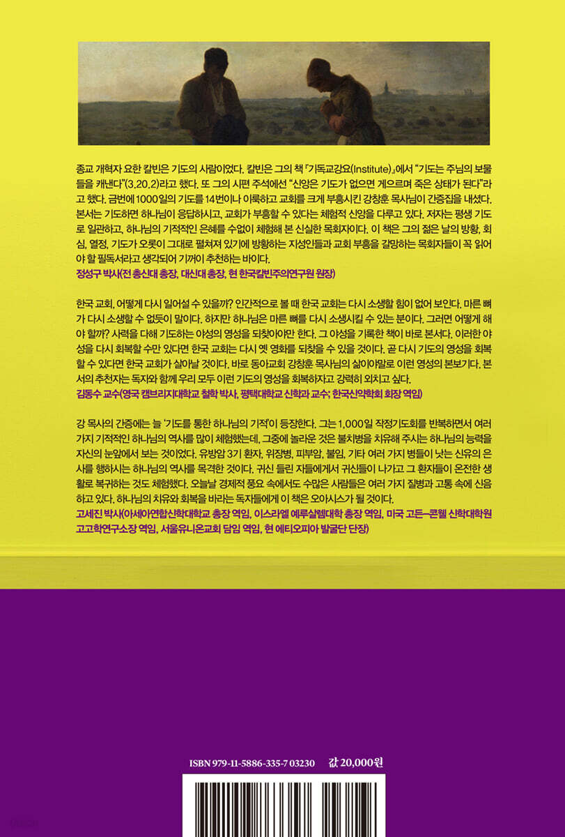 주님은 부족한 종과 동아교회 성도들의 쉼 없는 기도를 통해 전국 초교파 목회자 및 사모 세미나를 지속적으로 개최케 하셨고, 많은 한국 교회가 1,000일 작정기도회를 실천하는 놀라운 역사를 이루셨습니다. 이 책을 읽는 목사님들과 교회 속에 꺼지지 않는 기도의 불길과 부흥의 불길이 타오르길 소원합니다. 특히 성도들에게는 중단 없는 기도와 충성된 봉사로써 주님이 주시는 한량없는 은혜와 복을 경험하시길 기도합니다. 저와 동아교회의 1,000일 작정기도회는 이제 평생 작정기도회가 됐습니다. 부디 이 기도 운동이 한국 교회와 성도님들 속에 더 넓고 더 뜨겁게 전해지기를 소원합니다. 하나님께서 이끌어주시고 성도들과 손잡고 걸어 온 저의 사역 여정이 한 권의 책으로 재출간될 수 있게 출판을 맡아주신 킹덤북스(Kingdom Books) 윤상문 대표님께 진심으로 감사드립니다. 자료 수집과 원고 작성 등을 맡아 기꺼이 도움을 주신 믿음의 여러 지체들께도 감사와 사랑의 마음 전합니다. 부족한 종의 사역과 건강을 위해 기도로 협력해주신 동아교회 교우들에게 진심으로 감사를 드립니다. - 2025년 3월 10일, 강창훈 목사 |
