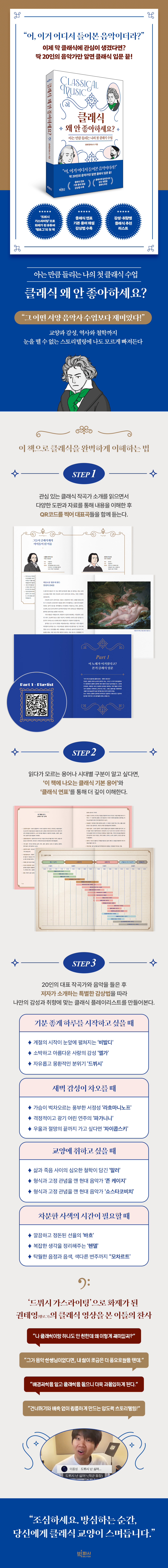“어, 이거 어디서 들어본 음악이더라?”이제 막 클래식에 관심이 생겼다면? 딱 20인의 음악가만 알면 클래식 입문 끝! ★★★ 클래식 연표 · 기본 용어 해설 · 감상법 수록★★★ 감성·취향별 클래식 추천 리스트수백 년 전에 작곡된 클래식이 지금까지 연주되는 이유는 무엇일까? 분명 오늘날 우리에게도 통하는 아름다운 메시지가 담겨 있기 때문일 것이다. 하지만 클래식은 섣불리 접근하기에 어렵게 느껴지는 것도 사실이다. 길고, 지루하다는 선입견이 먼저 고개를 든다. 수많은 음악과 작곡가, 각 곡에 얽힌 역사적 배경과 다양한 분류까지…. 그 내용이 방대하면서 어려울 것 같고, 어디서부터 시작해야 할지도 막막하다. 하지만 《클래식 왜 안 좋아하세요?》는 K-POP만큼이나 친숙하게 클래식을 즐길 수 있도록 돕는 흥미로운 입문서다. 클래식 스토리텔러이자 음악 교육가 권태영(유튜버 탱로그)의 첫 책으로, 베토벤부터 라흐마니노프까지 꼭 알아두어야 할 20인의 음악가를 통해 클래식이라는 세계로 독자들을 초대한다. “그 어떤 서양 음악사 수업보다 재미있다!”교양과 감성, 역사와 철학까지 눈을 뗄 수 없는 스토리텔링에 나도 모르게 빠져든다저자는 이 책에서 일단 부담 없이 취향에 따라 음악을 고르고, 관심 가는 작곡가부터 차차 알아가 보자고 말을 건넨다.[PART 1. 이 노래가 이거였다고? 본격 클래식 입문]에서는 베토벤, 파가니니, 모차르트, 드뷔시 등 입문자에게도 친숙한 작곡가들을 통해 클래식의 매력을 맛보게 한다. [PART 2. 알고 들으면 더 재미있는 클래식 비하인드]에서는 바흐, 쇼팽 등 천재들이 명곡을 탄생시킨 순간의 뒷이야기를 생생하게 소개하며, 음악을 더 깊이 이해하도록 돕는다. 또 [PART 3. 시대와 함께한 음악의 결정적 순간들]에서는 한 시대를 마무리하거나 새 시대를 연 음악가들과 시대정신이 담긴 명곡들을 조명하며, 세계사의 흐름 안에서 음악을 만끽할 수 있도록 한다. 마지막으로 [PART 4. 취향과 감성에 따라 골라 듣는 클래식 리스트]에서는 감정과 취향에 따라 골라 들을 수 있는 추천곡을 소개하며, 클래식을 한층 더 가깝게 느끼도록 돕는다. 이처럼 이 책은 클래식의 다양한 매력을 짚어내며, 자기만의 방식으로 감상할 수 있도록 안내한다. 더불어 작곡가들의 대표곡을 통해 그들이 어떻게 음악에 의도, 철학, 사상 등을 어떻게 담아냈는지도 친절하게 설명한다. 아는 만큼 보인다는 말이 있다. 사전 지식 없이 음악부터 즐기는 것도 좋지만, 저자가 들려주는 이야기와 함께 감상한다면 클래식이 내 삶에 더 깊이 스미는 경험을 하게 될 것이다.‘드뷔시 가스라이팅’으로 다수의 커뮤니티를 뒤흔든 유튜버 ‘탱로그’의 첫 책!“조심하세요. 방심하는 순간, 당신에게 클래식 교양이 스며듭니다”이 책은 ‘드뷔시 가스라이팅’ 영상으로 다수의 커뮤니티에서 화제가 됐던 권태영(유튜버 탱로그)의 첫 책이다. 그의 채널로 클래식을 접한 이들은 입을 모아 이같이 말한다. “나 클래식이랑 하나도 안 친한데 왜 이렇게 재미있지?”“그가 음악 선생님이었다면, 내 삶이 조금은 더 풍요로웠을 텐데.” “배경지식을 알고 클래식을 들으니 더욱 과몰입하게 된다.”“건너뛰기와 배속 없이 집중하게 만드는 압도적 스토리텔링!”약 4년간 초등학교 교사로 재직했고, 현재 미국 조지아주립대학교 음악교육학 박사 과정에 재학 중인 저자는 음악 교육가답게 입문자의 눈높이에서 쉽고 친절하게 클래식 음악을 소개한다. 그뿐 아니라 취향과 감성에 맞는 음악도 추천한다. ***기분 좋게 하루를 시작하고 싶을 때***- 계절의 시작이 눈앞에 펼쳐지는 ‘비발디’- 소박하고 아름다운 사랑의 감성 ‘엘가’- 자유롭고 몽환적인 분위기 ‘드뷔시’***새벽 감성이 차오를 때***- 가슴이 벅차오르는 풍부한 서정성 ‘라흐마니노프’- 격정적이고 광기 어린 연주의 ‘파가니니’- 우울과 절망의 끝까지 가고 싶다면 ‘차이콥스키’***교양에 취하고 싶을 때***- 삶과 죽음 사이의 심오한 철학이 담긴 ‘말러’- 형식과 고정 관념을 깬 현대 음악가 ‘존 케이지’- 음악으로 읽는 이념과 시대정신 ‘쇼스타코비치’***차분한 사색의 시간이 필요할 때***- 깔끔하고 정돈된 선율의 ‘바흐’- 복잡한 생각을 정리해주는 ‘헨델’- 탁월한 음정과 음색, 색다른 변주까지 ‘모차르트’클래식, 어렵게 생각하지 말고 일단 시작한 다음 천천히 알아가 보는 것은 어떨까? 오랜 시간 많은 이를 위로했던 그 음악이, 이제 내 일상의 기쁨이 되어줄 테니 말이다.“예술이란 고독 속에서 혼자만의 기쁨을 누리는 것이 아닙니다. 오히려 예술은 사람들의 기쁨과 고통을 담아내는 도구이며, 더 많은 사람과 연결해주는 매개체입니다.”_알베르 카뮈, 노벨문학상 수상 소감 중에서