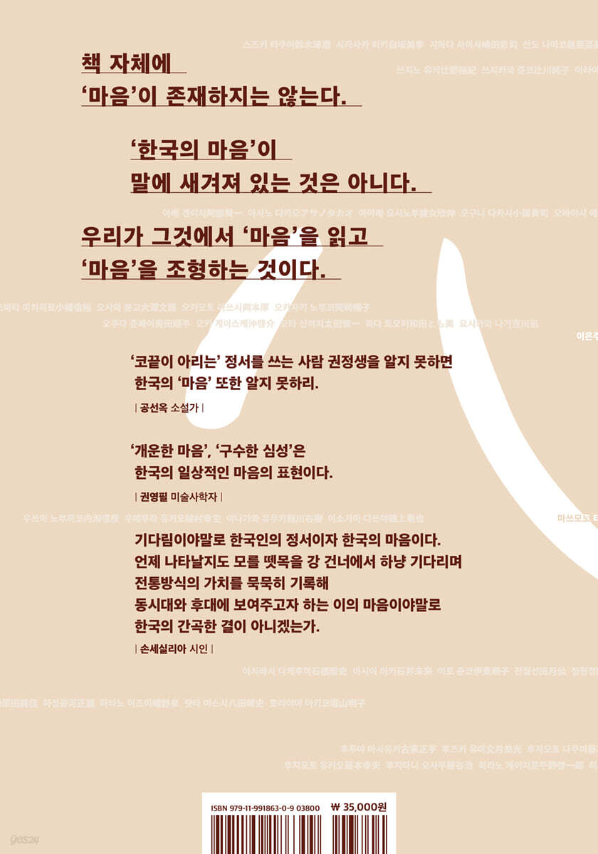 2014년 『한국의 지(知)를 읽다』를 시작으로 2024년 『한국의 미(美)를 읽다』, 2025년 『한국의 마음(心)을 읽다』까지 10여 년에 걸친 ‘한국의 진선미(眞善美)’ 3부작이 완결되었다. 특히 『한국의 마음(心)을 읽다』는 2025년 3월 한국과 일본에서 동시 출간되며 10여 년의 대장정을 마무리했다. 언어학자로서 2005년 대한민국 문화포장을 수장하고 2010년에는 『한글의 탄생』으로 마이니치신문사와 아시아조사회가 주최하는 제22회 아시아태평양상 대상, 2012년 한글학회 주관 주시경학술상, 2014년 일본 파피루스상을 수상한 노마 히데키(野間秀樹)와, 연세대학교 명예교수이자 세교연구소 이사장으로 2023년 제7회 중국학공헌상, 2025년 제31회 용재학술상을 수상한 백영서가 『한국의 미(美)를 읽다』에 이어 『한국의 마음(心)을 읽다』를 함께 엮었다. 『한국의 마음(心)을 읽다』는 시인, 소설가, 언어학자, 번역가, 서점인, 출판인, 저널리스트, 심리학자, 철학자, 미술가, 음악가, 사진가, 건축가, 영화제작자 등 한국과 일본에서 활동하는 122명의 저자가 저마다의 방식으로 ‘한국의 마음’을 엿볼 수 있는 책을 추천한다. 고대부터 미래에 이르는 다양한 시간 속의 마음, 일상의 사소한 마음부터 천지를 뒤덮을 듯한 위대한 마음에 이르기까지, 투철한 지성에 담긴 마음부터 뜨겁게 불타오를 듯한 마음까지, 300여 권의 책과 함께 한국·조선의 마음에 가닿게 해준다. 마음이야말로 경계도 없고 한없이 큰, 그래서 보이지 않는 힘이다 저자들은 한국, 한국인의 마음을 대표하는 정(情)과 한(恨), 신명(神明)을 비롯해 고독, 연민, 공동체 의식, 유교주의 등을 떠올리게 하는 작품과, 한국이 현대화를 겪으며 진보와 보수, 좌와 우, 가부장제와 페미니즘, 주류와 소수, 개인과 공동체 등으로 양분되는 양상이 한국인의 마음속에 자리 잡는 과정을 보여주는 작품을 다양한 방식으로 소개한다. 왜 그런지는 몰라도 항상 엄마가 밤새워 짠 ‘나이’라거나 ‘베’라고 부르던 그 천연 직물을 팔아서 사 가지고 온 지지미 옷 생각이 나고 그 생각이 나면서 말로는 설명하기 어려운 ‘코끝이 아리는’ 증세를 느끼고(공선옥 글 / 권정생, 『우리들의 하느님』), 칼이 아니라 음악을 통해 나라를 하나로 묶으려고 했던 가실왕과 고을의 자연을 가야금에 담아 예술로 승화시킨 우륵의 모습에서 한국인의 삶과 심성이 자연에서 비롯되었음을 알게 되고(김건숙 글 / 김훈, 『현의 노래』), 인간은 역경을 겪으며 어떻게 부서지고 또 단련되면서 변화하는지, 연민 경건 따위는 어디에서 생기는지 고민한 끝에 “양심은 우리 마음의 가장 은밀한 골방이며, 우리가 하느님과 단독으로 대하는 지성소입니다”라고 한 말에서 그가 ‘행동하는 양심’이라는 실존의 척도를 얻었다고 생각하고(김형수 글 / 김대중, 『김대중 옥중서신』), 아직도 현재의 슬픔인 ‘80년 5월 광주’의 소년 동호를 ‘함께’ 기억하기에 앞으로 나아갈 수 있다고 생각한다(변용란 글 / 한강, 『소년이 온다』). 막막한 시대에 갈 곳을 잃어가는 사람들의 비극이 연이어 그려지는 작품에서도 희망의 실마리를 찾고(나카마타 아키오 글 / 조세희, 『난장이가 쏘아올린 작은 공』), 일제강점기에 일본의 수산물 수탈에 맞서 싸운 제주해녀들의 항일투쟁을 통해 ‘인간의 존엄성’과 ‘사람의 마음’에 대해 생각해보고(니미 스미에 글 / 허영선, 『해녀들』), 1937년에 스탈린의 명령으로 강제 이주당해 중앙아시아 각지에서 소수민족으로 명맥을 겨우 유지하는 고려인이 조선어 발음을 연습하는 광경을 보며 입에서 입으로 오랫동안 이어져 내려온 그 말의 구석구석에서 말로 하기 어려운 ‘언령(言靈)’을 느낀다(다카기 다케야 글 / 강신자, 『추방당한 고려인: 천연의 미와 백년의 기억』). 그리고 학생 시절의 ‘허세’가 원인이 되어 몇 년 후 큰 대가를 치르게 되는 주인공의 슬플 정도로 가슴 아프며 동시에 어딘지 모르게 해학적이어서 도저히 미워할 수 없는 모습에서(이나가와 유우키 글 / 이기호, 「원주 통신」), 일을 마치고 회사 사람들과의 교류가 끝나고 그야말로 ‘파김치’가 되어 귀가하는 아빠가 아이와 약속한 아이스크림을 사러 가는 모습에서(후루야 마사유키 글 / 김영진, 『아빠의 이상한 퇴근길』) 한국의 마음을 읽어낸다. 한국·조선인의 ‘마음’을 찾는 장대한 여행 이 책에는 모두 122명의 저자가 283종의 책을 추천한다. 이 중에서 여러 저자가 중복 추천한 책은 23종에 불과하다. ① 5명이 중복 추천한 도서가 1종, ② 3명이 중복 추천한 도서가 5종, ③ 2명이 중복 추천한 도서가 17종으로, 전체 도서 중 10%가 되지 않는다. 가장 많은 저자의 추천을 받은 도서는 ① 『소년이 온다』(한강)로 한국 저자 1명, 일본 저자 4명의 추천을 받았다. 다음으로 많이 추천받은 도서는 ② 『그 많던 싱아는 누가 다 먹었을까』(박완서), 『난장이가 쏘아올린 작은 공』(조세희), 『떠도는 땅』(김숨), 『한국현대시선』(이바라기 노리코), 『흙 속에 저 바람 속에』(이어령)로 저자 3명에게서 중복 추천을 받았다. 저자 2명에게서 중복 추천받은 도서는 17종으로 ③ 『거기, 내가 