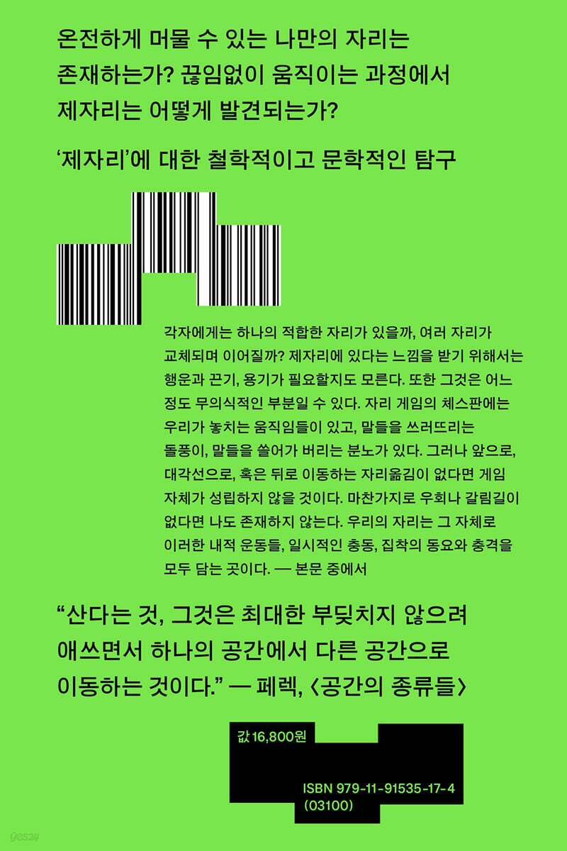 도마뱀 놀이, 볕드는 자리에서 빈둥대기 “모든 것이 제자리에 있고” 탈주하기 한자리에 머물지 못하는 사람들 뿌리내리기 줄어드는 삶 공간의 시련 왕국 없는 여왕 제 목소리 찾기 불손한 사람들 침입의 논리 자리의 곤경 “진정한 장소”라는 것 욕망의 불협화음 표류와 흘러넘침 이중생활 내 안에 자리 만들기 안의 공간 내 몸에 깃들어 살기 바로 여기 일곱 가족 게임 가지를 잘라내기 의자 놀이 누락된 자리 자리를 발명하기 유령들 실향민들 잘못된 장소에 있다는 것 어쩌다 있게 된 곳 철새들 소리의 원 자리 옮김을 사유하기 무엇을 위한 자리인가? 책의 여백에 옮긴이의 말 |