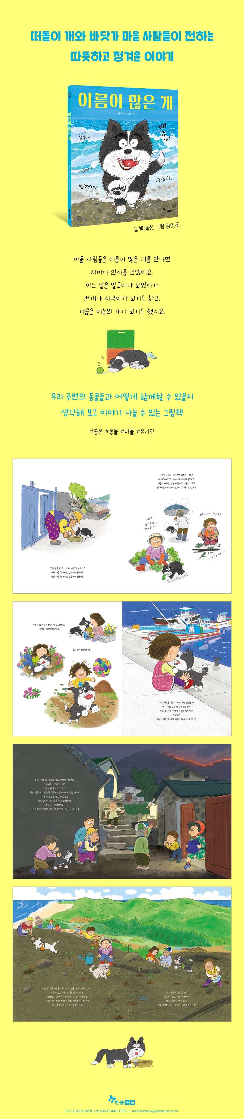 ― 휴가철 버려지는 반려동물들 vs 산타독 프로젝트 박혜선 작가는 ‘산타독 프로젝트’에 대한 뉴스를 보고 《이름이 많은 개》를 구상하게 되었습니다. ‘산타독 프로젝트’는 한국유기동물보호협회에서 처음으로 시작했는데, 산불이 나서 황폐해진 지역을 유기견, 반려견과 함께 다니며 씨앗을 뿌리는 자원봉사 활동입니다. ‘산타독’은 ‘산을 타는 개’라는 뜻으로, 캠페인에 참여하는 개들은 구멍이 뚫린 씨앗 주머니를 매달고 자연스럽게 뛰어 놀면서 씨앗을 뿌립니다. 이 프로젝트는 유기견에 대한 인식을 개선하고, 나아가 동물과 사람 모두를 돕는다는 취지를 가지고 있습니다. 작가는 산타독 프로젝트를 통해 동물과 사람, 자연의 공존에 대해 생각하게 되었습니다. 매년 휴가철이면 피서지에 버려지는 반려동물에 대한 안타까운 뉴스를 접하게 됩니다. 여행객들이 반려동물을 데리고 여행을 갔다가 여행지에 그대로 버리고 오는 경우가 많아서, 휴가철이면 유기 동물의 수가 급증한다고 합니다. 버려진 동물들은 먹이를 찾아 근처 마을을 헤매거나 무리를 지어 이곳저곳을 떠돌게 되지요. 실제로 바닷가나 계곡 등 유명한 관광지 인근에 가면 떠돌이 개와 고양이를 많이 볼 수 있습니다. 《이름이 많은 개》의 주인공도 연휴가 끝난 바닷가에 홀로 버려져, 떠돌이 개가 되어 마을로 흘러들게 됩니다. 주인에게 버려져 이름을 잃어버린 개는 정 많은 마을 사람들을 만나 새로운 이름들을 갖게 되고, 제집처럼 동네를 누비며 나름 잘 살아갑니다. 말려 놓은 생선이나 슬리퍼를 물고 가서 혼이 나기도 하지만, 마을에 산불이 났을 때는 이 집 저 집 돌아다니며 사람들을 깨워 주어 고맙다는 인사를 듣기도 합니다. 그리고 한 아이를 만나 특별한 우정을 쌓게 되지요. 마을 사람들과 이름이 많은 개, 그리고 다른 떠돌이 개들이 함께 서로를 보듬고 어울려 살아가는 모습은 뭉클한 마음으로 ‘공존’의 의미를 생각해 보게 합니다. 김이조 작가의 그림은 실제로 바닷가에 있는 한 마을을 옮겨 온 듯, 이름이 많은 개와 마을 사람들의 이야기를 정겹고 따뜻하게 완성해 주었습니다. 《이름이 많은 개》를 통해 우리 주변의 동물들과 어떻게 함께할 수 있을지 이야기 나누고 고민할 수 있는 기회가 되기를 바랍니다. 통합교과 2-1 마을 국어 1-2 5. 생각을 키워요 국어 2-1 5. 마음을 짐작해요 국어 2-2 3. 내용을 살펴요 국어 3-1 6. 일이 일어난 까닭 | 10. 문학의 향기 국어 3-2 1. 작품을 보고 느낌을 나누어요 국어 4-1 1. 생각과 느낌을 나누어요 | 10. 인물의 마음을 알아봐요 국어 4-2 4. 이야기 속 세상 | 7. 독서 감상문을 써요 |