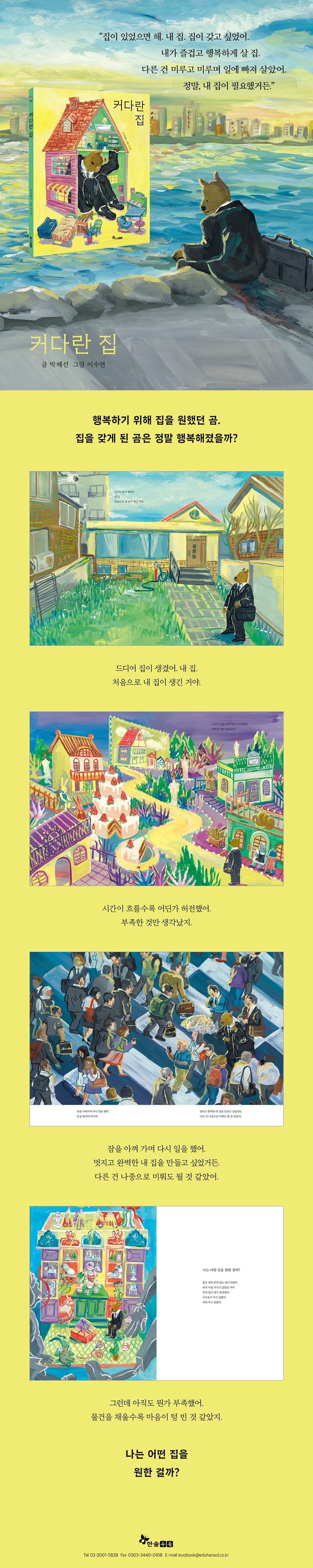 여러분에게 집은 어떤 의미인가요? 《커다란 집》은 행복하기 위해 집을 갖고 싶었던 곰의 이야기를 담고 있습니다. 곰은 남들처럼 내 집을 갖게 되면 행복해질 거라고 생각했습니다. 그래서 좋아하는 것도 참고, 하고 싶은 것도 꾹 참으며 열심히 일만 했습니다. 마침내 내 집을 갖게 되었을 때 곰은 기쁨의 순간을 맞이합니다. 언제나 쫓기듯 바빴던 마음도 편안해졌지요. 하지만 그것도 잠시, 집을 갖게 되니 또 부족한 것이 보였습니다. 크고 화려한 친구네 집에 비해 자신의 집이 초라하게 느껴졌습니다. 곰은 허전한 마음을 채우듯 집에 새로운 물건들을 들였습니다. 정작 그 좋은 물건들을 사용하고 즐길 여유도 없이, 잠을 아껴 가며 다시 일을 해야 했습니다. 어느새 온갖 물건들로 집이 가득 차게 되었지만 곰의 마음은 채워지지 않았습니다. 집은 더 이상 즐겁고 편안한 곳이 아니라 숨 막히는 곳이 되었습니다. 결국 곰은 집을 빼곡히 채웠던 물건들을 비우기 시작하며 자신이 원했던 집이 무엇인지 깨닫게 됩니다. 누군가에게 집은 안식과 행복을 주는 공간이기도 하고, 누군가에게는 꿈을 실현하는 곳이거나 또 다른 누군가에게는 단순히 잠만 자는 곳 혹은 벗어나고픈 곳이 되기도 합니다. 집은 그곳에 사는 사람의 삶을 그대로 보여 주고, 그 사람이 집에 대해 갖고 있는 생각과 태도만큼의 의미가 됩니다. 타인과의 비교나 욕심은 곰의 마음을 점점 더 허전하게 했고 집을 편히 쉴 수 없는 답답한 곳으로 만들었습니다. 그러다 곰이 진정으로 자기가 원하는 것이 무엇인지 깨달았을 때 집은 또 다른 의미가 되었습니다. ‘작지만 커다란 집’에서 곰은 비로소 자유와 평안을 얻었습니다. 여러분에게 집은 어떤 의미인가요? 《커다란 집》은 독자들에게 질문합니다. 그리고 자신의 마음에 따라 집의 의미와 모습은 달라질 수 있고, 그 안에서 행복을 찾을 수 있는 것도 결국은 본인의 선택일 것이라 이야기합니다. │ 초등교과 연계 국어 1-2 5. 생각을 키워요 국어 2-1 5. 마음을 짐작해요 국어 3-1 6. 일이 일어난 까닭 │ 10. 문학의 향기 국어 3-2 1. 작품을 보고 느낌을 나누어요 국어 4-1 1. 생각과 느낌을 나누어요 │ 10. 인물의 마음을 알아봐요 국어 4-2 4. 이야기 속 세상 │ 7. 독서 감상문을 써요 |
