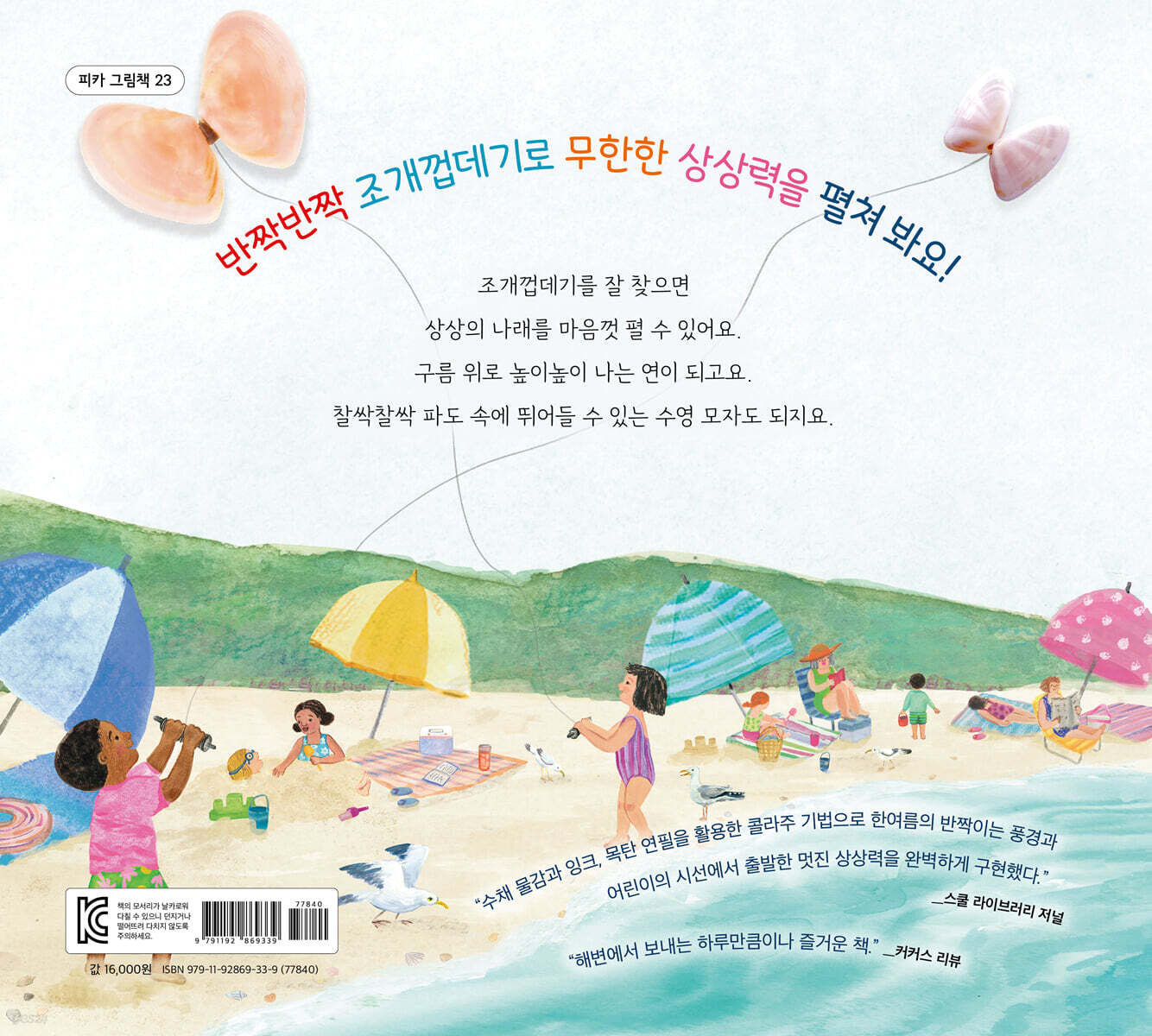 상상에 푹 빠진 아이의 얼굴은 바다에 일렁이는 햇빛만큼이나 밝게 빛납니다. 밤하늘을 밝히는 환한 달 같기도 합니다. 현실 속에서 아이는 어른의 보호를 받아야 하고, 지시를 따라야 하는 작은 존재이지만, 상상 속에서만큼은 온 우주를 누비며 강력한 힘을 뽐낼 수 있습니다. 완전히 몰입했던 시간을 되돌아보며 아이는 작게 탄성을 외칩니다. 완전히 몰입했던 재미있는 시간은 아이의 삶 속에 켜켜이 쌓여 조개껍데기 같은 아름다운 무늬를 만듭니다. 자신의 힘으로 날아오르고 싶은 아이들의 작고 보드라운 손에 조개껍데기를 꼭 쥐여 주고 싶습니다. - 우서희 (서울잠원초 교사, 《철학 버스》 저자)
