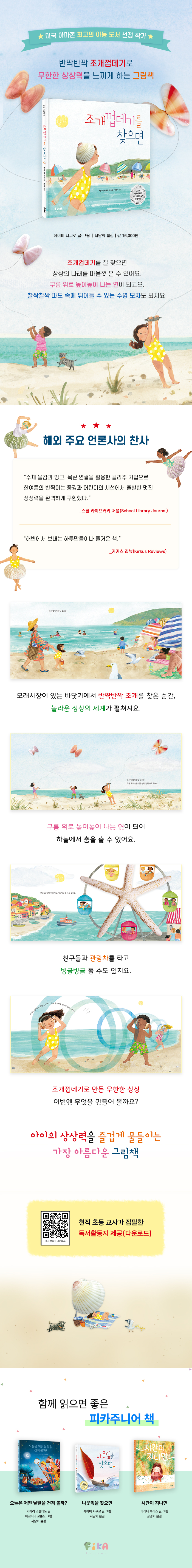 아마존 최고의 아동 도서로 선정된 『나뭇잎을 찾으면』의 작가 에이미 시쿠로의 신작. 조개껍데기를 주운 아이의 시선을 따라 펼쳐지는 다채로운 이야기를 담았다. 상상 속에서 조개껍데기는 뜨거운 햇볕을 막아 줄 파라솔이 되기도 하고, 연이 되어 구름 위로 날아가기도 한다. 수채화와 콜라주 기법으로 표현된 여름 바다의 풍경은 보는 것만으로도 즐겁다. 아이의 무한한 상상력을 키워줄 특별한 그림책. - 유아 PD 송고운