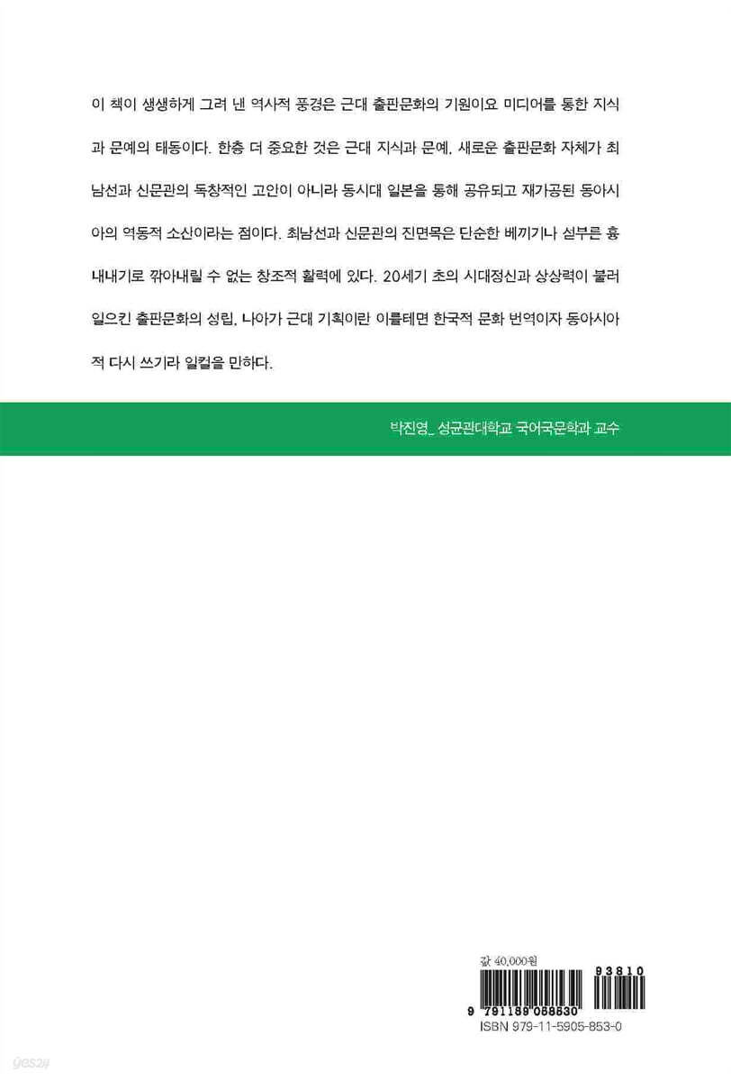 최남선을 비롯한 조선의 지식인들이 어떻게 일본의 문헌을 활용해서 민중계몽을 의도하고 독자적인 출판문화를 발전시키려 했는가, 그것을 밝히는 것이야말로 이 책의 목적이다. 또 당시 조선의 지식인들이 참고한 일본의 출판계는 서양의 영향을 받으면서 형성된 것이었다. 그런 의미에서 일본과 조선의 관계에 초점을 맞추어 근대 조선에서 출판문화가 형성되는 과정을 분석한 이 책의 시도는 조선의 출판 역사를 세계사의 틀에서 파악하는 작업의 일부이기도 하다. 이 책을 계기로 한국의 독자 여러분이 조금이나 일본의 ‘출판’에도 관심을 기울이게 되어 한국과 일본 사이의 미디어와 역사, 문학연구자 사이의 교류 활성화로 이어질 수 있기를 바라마지 않는다.