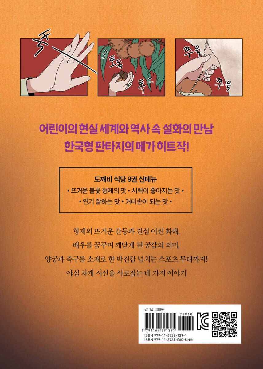 황금 비녀로 감칠맛을 더하는 요리법, 식당 주인 '도화랑'의 요술 청동거울, 실제인 듯 꿈인 듯 오묘한 분위기 〈신기한 맛 도깨비 식당〉 시리즈는 삼국유사의 설화 속 인물 ‘도화랑’을 둘러싸고 다양한 주인공의 이야기가 오가며 펼쳐지는 옴니버스 동화이다. 한국형 판타지 동화의 장르를 본격적으로 연 작품이라 할 수 있다. 어린이, 청소년, 어른까지 세대를 넘나들며 등장하는 도깨비 식당의 손님들은 저마다의 가치관, 욕망과 자신을 둘러싼 환경이 충돌하는 상황에서 고민과 갈등을 안고 요리를 먹는다. 도화랑이 마법과 요술을 더해 완성한 음식은 고민 해결의 열쇠가 되며 전반적인 분위기를 끌어 올리는 역할을 하지만 재료의 실제 효능과 쓰임이 고증되어 이야기에 현실감을 더하기도 한다. 메뉴의 이름과 재료의 특성이 어떻게 연결되는지 찾아보는 재미도 엿볼 수 있다. 각 단편을 거듭할수록 식당을 찾는 인물들의 연결점을 발견하는 즐거움은 옴니버스의 장르적 특성을 극대화한다. 전 권에서 등장한 사연자가 후속 이야기의 사연자에게 도움이 되기도 하고, 신라 시대를 배경으로 하는 ‘도화랑의 비밀’에 재등장하기도 한다. 각 편 주인공이 얽히고설키는 구성은 〈신기한 맛 도깨비 식당〉의 세계관이 점점 확대될 수 있다는 기대감을 심어 준다. 어린이의 목소리로 담아낸 리얼리티의 세계 장면을 발 빠르게 그릴 수 있는 간결한 문장 두 저자는 학교 현장에서 아이들과 많은 시간을 보내며 어린이의 세계와 오랫동안 밀착되어 지내 왔다. 〈신기한 맛 도깨비 식당〉 시리즈가 고민을 해소하고 희망으로 나아가는 과정에서 수많은 공감을 불러일으킨 이유는 아이들의 현실을 깊이 이해하고, 상호작용한 경험이 우러나온 데에 있다. 특히 직접 받은 사연을 소재로 삼은 이야기는 더욱 생생한 리얼리티를 추구하며 많은 독자의 주목을 받았다. 『신기한 맛 도깨비 식당 9』는 엄마의 손길이 어린 동생에게 기울어지자 질투를 느끼며 동생과 멀어지는 인물이 첫 번째로 등장한다. 질투심이 사소한 다툼으로 표현되며, 아웅다웅하는 형제의 일상이 따뜻하게 그려졌다. 양궁 경기에서 일인자가 되고 싶은 마음, 연기자로 카메라 앞에 다시 서기를 바라는 마음은 스포트라이트를 받으며 주인공이 되고 싶은 아이들의 욕망을 솔직하게 보여 준다. 새로 등장한 경쟁자에게 1위라는 왕관을 빼앗겼을 때, 같은 출발선에서 시작한 친구가 멀리 앞서간 모습을 볼 때 상대를 부러워하기도 하고 또 미워하기도 하는 모습이 공감과 위로를 건넨다. 어마어마한 점수 차로 경기를 진 축구부의 진수와 민우는 좌절감을 맞닥뜨리면서도 어떻게든 헤쳐 나가려는 도전 정신을 통해 ‘노력’과 ‘희망’이 어떤 형태로 드러날 수 있는지 알려 준다. 〈신기한 맛 도깨비 식당〉의 군더더기 없고 깔끔한 문장은 인물의 생각과 감정이 단숨에 와닿게 하는 큰 장점이다. 특히『도깨비 식당 9』에 등장하는 양궁과 축구 경기 장면을 중계하듯 속도감 있게 전개한 부분이 탁월하다. 독서가 익숙하지 않은 아이들도 말맛을 살려 읽을 수 있도록 친숙한 문형을 길어 올리면서도 다양한 표현을 익힐 수 있도록 공들여 단어를 선택한 점도 이 책이 얼마나 큰 애정 속에서 태어났는지 말하고 있다. 애니메이션을 보는 듯 생생한 그림, 시각적 재미를 더하는 질감과 색감 〈신기한 맛 도깨비 식당〉에 감칠맛을 더하는 중요한 재료로서 ‘그림’을 빼놓을 수 없다. 센개 작가는 새로운 스토리텔링과 배경이 거듭되는 가운데서도 일관된 세계관을 유지하며 각각의 개성으로 차별화되는 캐릭터를 구축했다. 이번에 등장하는 양궁과 축구 경기 장면은 경기장의 분위기를 활달한 구도로 배치하고 재치 있는 만화 효과를 풍부하게 곁들여 단연 ‘킬링 파트’라고 할 수 있다. 또한 이 동화의 정수라고 할 수 있는 요리 장면과 음식은 애니메이션 영화처럼 생동감 있게 표현되어 이야기를 더욱 흥미진진하게 해 준다. 『신기한 맛 도깨비 식당 9』에 등장하는 찹쌀떡, 밤 젤리, 당근 차, 회오리 감자 등이 대담하게 구성된 화면 안에서 마치 움직이듯 시각적 재미를 더한다. 열매를 따서 입힌 고기의 색, 도토리묵과 청포묵, 메밀묵의 질감과 부딪치는 컵 속에서 빛을 발하는 과일 주스의 선명하고 시원한 색감도 눈여겨볼 만하다. 교과 연계 초등 국어 3학년 1학기 1. 생생하게 표현해요 | 5. 인물에게 마음을 전해요 초등 국어 3학년 2학기 1. 작품을 보고 느낌을 나누어요 | 9. 작품 속 인물이 되어 초등 국어 4학년 1학기 5. 말과 글로 전하는 생각 초등 국어 4학년 2학기 1. 이어질 장면을 생각해요 | 7. 독서 감상문을 써요 초등 국어 5학년 1학기 2. 작품을 감상해요 | 10. 주인공이 되어 초등 국어 5학년 2학기 1. 마음을 나누며 대화해요 초등 국어 6학년 1학기 8. 인물의 삶을 찾아서 | 9. 마음을 나누는 글을 써요 초등 국어 6학년 2학기 1. 작품 속 인물과 나 | 8. 작품으로 경험하기 초등 사회 5학년 2학기 1. 옛사람들의 삶과 문화 |