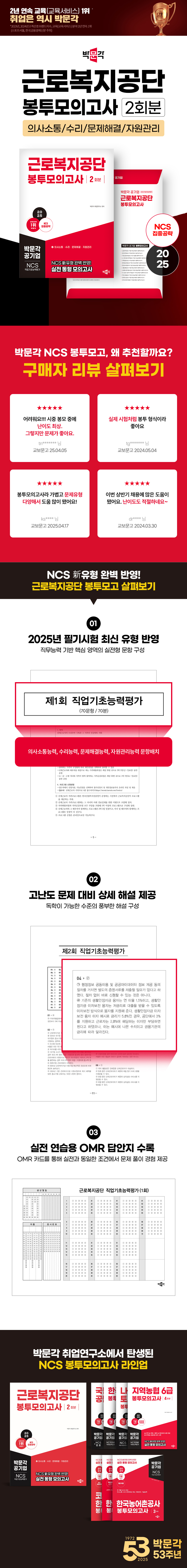 《2025 근로복지공단 NCS 직업기초능력평가 봉투모의고사》는 근로복지공단 채용 필기시험 중 NCS 직업기초능력에 대비하기 위한 봉투모의고사 문제집입니다. 시험을 보기 전 최종적으로 시험 유형 및 실력을 점검할 수 있도록 하기 위해 최신 출제경향을 철저히 분석하고 이와 가장 부합하는 문제들로 구성하였습니다. 독자들이 교재를 통해 최대의 효과를 얻게 하고자, 다음과 같은 방향으로 구성하였습니다.