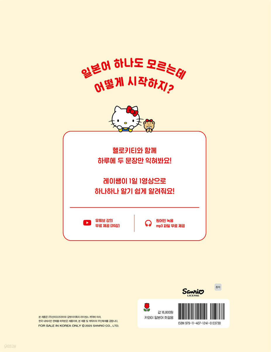 어떻게 시작하지? 1. 하루 두 문장만 가볍게 익혀봐요 회화, 문법, 패턴, 단어... 배워야 할 게 정~말 많은 일본어 첫걸음서! 한 번에 소화해야 할 학습량이 정말 많죠? 의욕이 뿜뿜 하는 시작 단계에서는 괜찮지만 뒤로 갈수록 부담이 커지면서 책을 덮게 되는 경험, 누구나 있으실 거예요. 《카와이 일본어 첫걸음》은 정말 쉽고 간단합니다. 하루에 딱 두 문장만 배우면 끝! 학습의 포인트가 되는 두 문장을 하나하나 알기 쉽게 알려줍니다. 일본어를 처음 시작하는 학습자의 눈높이에 맞춰서 최대한 부담 없이 학습을 이어나갈 수 있도록 설계했어요. 하루에 두 문장만 꾸준히 공부해도, 책 한 권을 끝내면 일본어 기초가 탄탄해져 있을 거예요! 2. 레이쌤의 무료 유튜브 강의와 함께해요 일본어, 혼자서 공부하기 막막하다면? 걱정 마세요! 저자 레이쌤의 핵심 강의(20강)가 준비되어 있습니다. 각 과의 핵심 두 문장을 발음까지 꼼꼼하게 알려주고, 기초를 탄탄하게 해주는 확장 표현들도 하나하나 상세히 짚어줍니다. 본 책의 QR 코드를 찍으면 강의 영상을 볼 수 있어요! 3. 세젤귀 헬로키티와 함께 즐겁게 공부해요 귀여운 거 좋아하는 사람 다 모여라! 산리오의 대표 캐릭터 헬로키티를 본문에 가득 담아 책만 펼쳐도 기분 좋은 시간을 선사합니다. 그리고! 내가 원하는 대로 책을 꾸밀 수 있는 ‘책꾸 스티커’가 들어 있어 나만의 특별한 책을 만들 수 있습니다. 헬로키티와 함께 공부도 즐거운 시간으로 만들어주는 마법을 경험해 봐요!! 「특별 서비스」 원어민 녹음 mp3 파일 무료 제공 일본어 문자와 발음부터 꼼꼼하게 녹음했습니다. 우리말 해석도 같이 녹음하여 듣기만 해도 학습이 가능합니다. 우리말 해석 없이 일본어만 듣기 버전도 추가로 제공합니다. 학습 스타일에 맞게 활용해보세요! 본문 QR 코드를 찍어 바로 듣기 / 길벗 홈페이지 www.gilbut.co.kr 에서 듣거나 다운 받을 수 있습니다. (일본어만 듣기 버전은 길벗 홈페이지에서만 제공합니다.) ★ 본문 구성 미리보기 이 책은 일본어를 처음 시작하는 입문자를 대상으로 합니다. 본 책은 워밍업에 해당하는 [일본어 문자와 발음]과 본격적인 일본어를 배우는 DAY 01~DAY 20으로 이루어져 있습니다. 이 책을 끝까지 학습하면 일본어 명사 파트를 완벽하게 끝낼 수 있습니다. | 도입부 | 오늘 배울 내용에 관한 간단한 설명과 대표 문장, 단어 정리로 구성되어 있습니다. QR코드를 스캔하면 저자 동영상 강의를 보거나 mp3 파일을 들을 수 있는 페이지로 연결됩니다. | 함께 알아보자 | 두 개의 대표 문장을 하나하나 알기 쉽게 설명합니다. | 함께 읽어보자 | 오늘 배우는 핵심 내용과 관련된 확장 표현을 알려줍니다. | 함께 풀어보자 | 간단한 문제를 풀면서 배운 내용을 확인합니다. | 함께 써보자 | 문장을 써보면서 한 과의 학습을 마무리합니다. | 모두 함께 수다 타임 | 일본 문화와 관련한 즐거운 이야깃거리를 나눕니다. ★ 저자 메시지 이 책은 누구라도 ‘혼자서’ 기초를 탄탄하게 쌓을 수 있게끔 구성했습니다. 또 혼자 공부하기 힘든 분들을 위해 각 과마다 핵심강의를 실었습니다. 거기에 헬로키티의 ‘귀여움’까지 더했으니 질릴 틈이 없겠죠? 이 책으로 여러분이 일본어를 마스터하게 될 것이라고 단언할 수는 없습니다. 하지만 여러분의 일본어 ‘기초공사’를 탄탄하게 해줄 수 있을 것이라고 확신합니다. 가장 쉽게 접근할 수 있도록, 가장 효율적으로 공부할 수 있도록 집필했습니다. 일본어를 잘하고 싶다는 마음으로 일본어를 시작한 여러분께, 가장 즐거운 방법으로 공부할 수 있는 길을 소개합니다. |