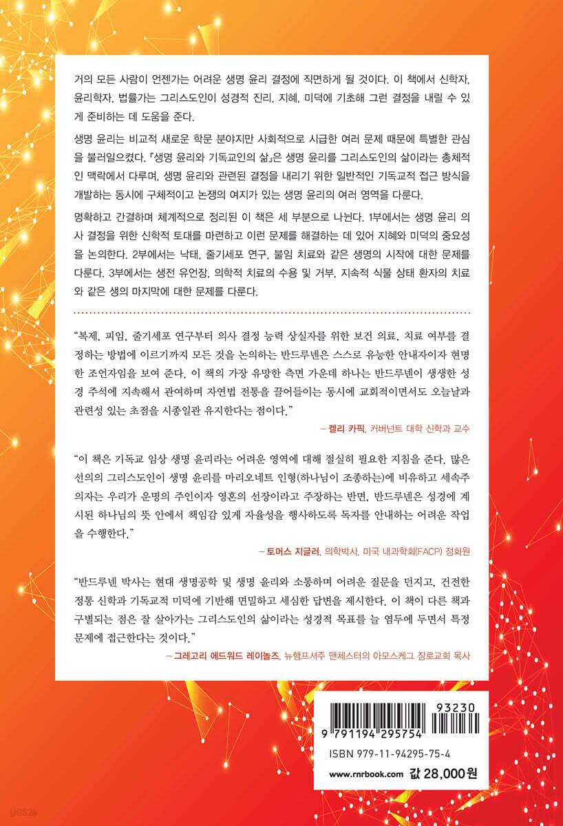 반드루넨 박사는 모든 목사와 사려 깊은 모든 그리스도인이 삶과 죽음의 문제를 생각하는 데 도움이 되는 방식으로 생명 윤리적 대화에 상당히 또한 긍정적으로 공헌하고 있다. 반드루넨은 현대 생명공학 및 생명 윤리와 소통하며 어려운 질문을 던지고, 건전한 정통 신학과 기독교적 미덕에 기반해 면밀하고 세심한 답변을 제시한다. 이 책이 다른 책과 구별되는 점은 잘 살아가는 그리스도인의 삶이라는 성경적 목표를 늘 염두에 두면서 특정 문제에 접근한다는 것이다. 하나님의 율법에 담겨 있는 고정된 도덕적 진리가 모든 윤리적 질문에 항상 명확한 답변을 주는 것은 아니지만, 성경적 지혜는 그리스도인이 어려움을 헤쳐 나가고 손쉬운 답변을 피할 수 있게 해 준다. 반드루넨은 성경이 명확하게 말할 때는 자기의 결론을 확고히 하지만, 성경이 침묵하는 곳에서는 독단적으로 행동하는 태도를 지혜롭게 경계한다. 나는 이 책을 강력히 추천한다. 기독교 윤리 입문서로서 이 책은 모든 교회에서 기독교 교육 과정의 필수 교재가 되어야 한다. - 그레고리 에드워드 레이놀즈 (뉴햄프셔주 맨체스터의 아모스케그 장로교회 목사, 『말씀은 천 개의 그림보다 가치 있다: 전자 시대의 설교』의 저자, 「안수받은 종: 교회 직분자를 위한 저널」의 편집자)