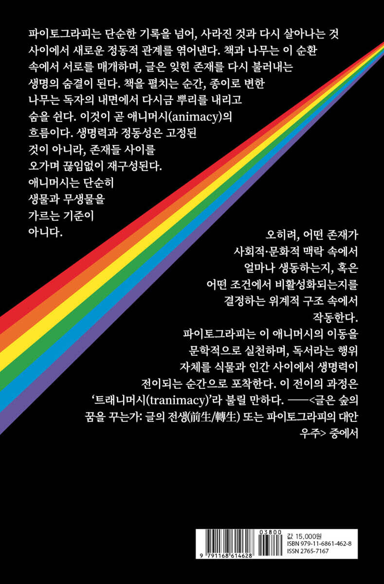 파이토그라피는 단순한 성찰이 아니다. 그것은 상처 입은 공간을 치유하고, 다시 생명의 가능성을 모색하며, 관계를 새롭게 엮어 가는 실천적 행위이다. 책이 나무의 부재를 증언하면서도 다시 깨어나는 나무의 가능성이 되는 것처럼, 독자가 텍스트를 읽는 순간 나무가 다시 살아나는 것처럼, 글쓰기는 정동이 순환하는 생명의 공간을 창출한다.