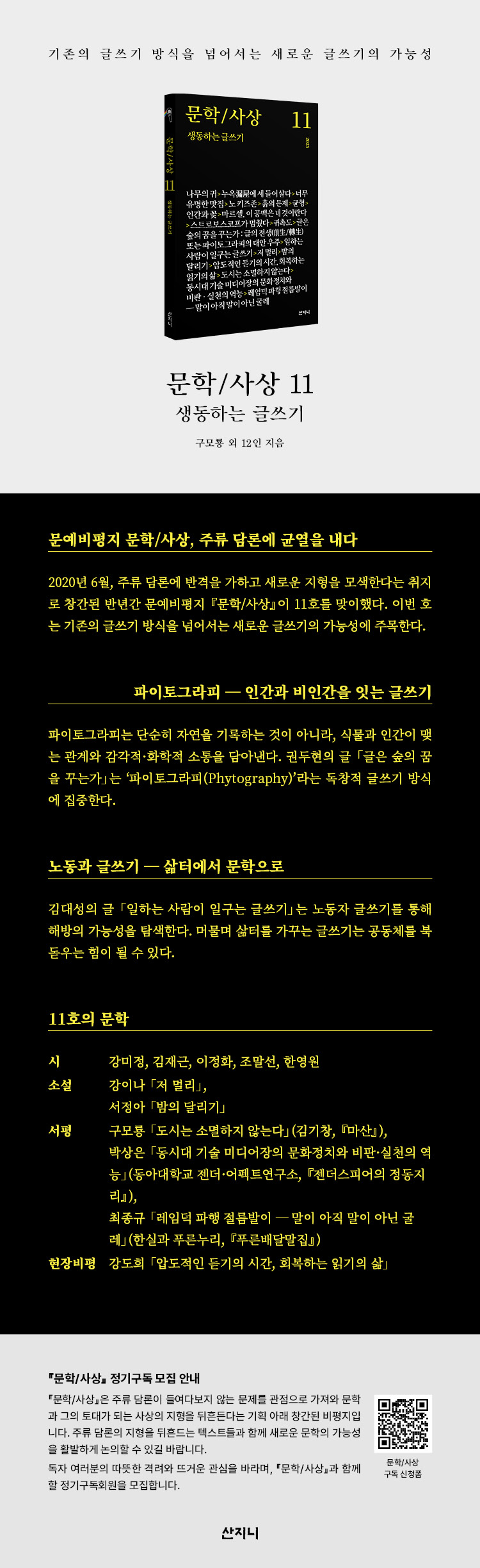 ∑ 시 나무의 귀/누옥漏屋에 세 들어 살다 강미정 시인 너무 유명한 맛집/노 키즈존 김재근 시인 흙의 문제/균형 이정화 시인 인간과 꽃/마르셸, 이 공백은 네 것이란다 조말선 시인 스트로보스코프가 멈췄다/귀촉도 한영원 시인 ∏ 비판-비평 글은 숲의 꿈을 꾸는가: 글의 전생(前生/轉生) 또는 파이토그라피의 대안 우주 권두현 동아대학교 젠더·어펙트연구소 전임연구원 일하는 사람이 일구는 글쓰기 김대성 문학평론가 ∮ 소설 저 멀리 강이나 소설가 밤의 달리기 서정아 소설가 Ⅹ 현장-비평 압도적인 듣기의 시간, 회복하는 읽기의 삶 강도희 문학평론가 ∞ 쟁점-서평 도시는 소멸하지 않는다 『마산』, 김기창 구모룡 문학평론가 동시대 기술 미디어장의 문화정치와 비판·실천의 역능 『젠더스피어의 정동지리』, 동아대학교 젠더·어펙트연구소 박상은 한국 현대문학/문화 연구자 레임덕 파행 절름발이 ― 말이 아직 말이 아닌 굴레 『푸른배달말집』, 한실과 푸른누리 최종규 『우리말꽃』 저자 |