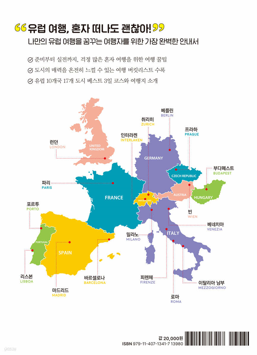 유럽 여행 지도 한눈에 보기 나에게 맞는 유럽 혼여 레벨을 체크하자! PART 1 혼자 여행 계획하기 혼자 여행 시작하기 Q&A 1 유럽, 언제 가는 게 좋나요? 2 유럽, 어디로 갈까요? 3 유럽, 어떻게 가야하고 어떻게 다녀야 하나요? 4 예산은 얼마 정도가 적당할까요? 5 택스 리펀드란 무엇이고, 어떻게 하는 건가요? 6 환전은 어떻게 하는 게 좋을까요? 신용카드를 꼭 준비해야 하나요? 7 해외에서 휴대폰 사용 시, 요금 폭탄을 방지하려면 어ㄸ?ㅎ게 해야 하나요? 혼자 여행 코스 짜기 7박 9일 코스 ① 런던 & 파리 서유럽 코스 7박 9일 코스 ② 이탈리아 일주 서유럽 코스 7박 9일 코스 ③ 동유럽 대표 3국! 프라하/부다페스트/빈 코스 7박 9일 코스 ④ 그리스 만끽 지중해 코스 14박 15일 코스 ① 스페인 & 포르투갈 정열의 이베리아 반도 코스 14박 15일 코스 ② 동류럽 주요 3도시 & 크로아티아 일주! 동유럽 플러스 코스 14박 15일 코스 ③ 서유럽과 북유럽 경계의 매력, 네덜란드/벨기에/독일/발트3국/핀란드 코스 30박 31일 코스 ① 서유럽 끝판 왕! 런던/프랑스/스위스/이탈리아 코스 30박 31일 코스 ② 푸르고 맑은 지중해 여행! 그리스/이탈리아 남부(+시칠리아)/크로아티아 코스 테마 코스 ① 오로지 맛있는 것을 먹기 위해 떠나는 미식 2주 코스 테마 코스 ② 아름다운 도로를 달리는 베스트 드라이브 코스 - 남프랑스 2주 코스/독일 남부 로맨틱 가도 10일 코스 테마 코스 ③ 축제와 나이트라이프를 즐기는 10일 코스 PART 2 혼자 여행 실전 꿀팁 1 숙소 정하기 2 유럽 여행 짐 싸기 3 핵인싸되는 나라별 문화 꿀팁 4 가끔 찾아오는 외로움 달래는 방법, 동행 만들기 5 셀스타그램의 달인 되기, 유럽 여행 사진 잘 남기는 방법 6 잠시도 지루할 틈이 없다! 여행 중 읽을 책과 볼 영화 추천 7 기타 여행 팁 PART 3 베스트 유럽 가이드 런던, 영국 - 런던 여행 정보 - 런던 베스트 3일 코스 - 혼자 여행 버킷리스트 - 런던 베스트 먹거리 - 런던 베스트 맛집 - 런던 베스트 스폿 파리, 프랑스 - 파리 여행 정보 - 파리 베스트 3일 코스 - 혼자 여행 버킷리스트 - 파리 베스트 먹거리 - 파리 베스트 맛집 - 파리 베스트 스폿 밀라노, 이탈리아 - 밀라노 여행 정보 - 밀라노 베스트 3일 코스 - 혼자 여행 버킷리스트 - 밀라노 베스트 먹거리 - 밀라노 베스트 맛집 - 밀라노 베스트 스폿 로마, 이탈리아 - 로마 여행 정보 - 로마 베스트 3일 코스 - 혼자 여행 버킷리스트 - 로마 베스트 먹거리 - 로마 베스트 맛집 - 로마 베스트 스폿 피렌체, 이탈리아 - 피렌체 여행 정보 - 피렌체 베스트 3일 코스 - 혼자 여행 버킷리스트 - 피렌체 베스트 먹거리 - 피렌체 베스트 맛집 - 피렌체 베스트 스폿 베네치아, 이탈리아 - 베네치아 여행 정보 - 베네치아 베스트 3일 코스 - 혼자 여행 버킷리스트 - 베네치아 베스트 먹거리 - 베네치아 베스트 맛집 - 베네치아 베스트 스폿 이탈리아 남부 - 이탈리아 남부 여행 정보 - 이탈리아 남부 베스트 3일 코스 - 혼자 여행 버킷리스트 - 이탈리아 남부 베스트 먹거리 - 이탈리아 남부 베스트 맛집 - 이탈리아 남부 베스트 스폿 바르셀로나, 스페인 - 바르셀로나 여행 정보 - 바르셀로나 베스트 3일 코스 - 혼자 여행 버킷리스트 - 바르셀로나 베스트 먹거리 - 바르셀로나 베스트 맛집 - 바르셀로나 베스트 스폿 마드리드, 스페인 - 마드리드 여행 정보 - 마드리드 베스트 3일 코스 - 혼자 여행 버킷리스트 - 마드리드 베스트 먹거리 - 마드리드 베스트 맛집 - 마드리드 베스트 스폿 리스본, 포르투갈 - 리스본 여행 정보 - 리스본 베스트 3일 코스 - 혼자 여행 버킷리스트 - 리스본 베스트 먹거리 - 리스본 베스트 맛집 - 리스본 베스트 스폿 포르투, 포르투갈 - 포르투 여행 정보 - 포르투 베스트 3일 코스 - 혼자 여행 버킷리스트 - 포르투 베스트 먹거리 - 포르투 베스트 맛집 - 포르투 베스트 스폿 프라하, 체코 - 프라하 여행 정보 - 프라하 베스트 3일 코스 - 혼자 여행 버킷리스트 - 프라하 베스트 먹거리 - 프라하 베스트 맛집 - 프라하 베스트 스폿 부다페스트, 헝가리 - 부다페스트 여행 정보 - 부다페스트 베스트 3일 코스 - 혼자 여행 버킷리스트 - 부다페스트 베스트 먹거리 - 부다페스트 베스트 맛집 - 부다페스트 베스트 스폿 빈, 오스트리아 - 빈 여행 정보 - 빈 베스트 3일 코스 - 혼자 여행 버킷리스트 - 빈 베스트 먹거리 - 빈 베스트 맛집 - 빈 베스트 스폿 취리히, 스위스 - 취리히 여행 정보 - 취리히 베스트 3일 코스 - 혼자 여행 버킷리스트 - 취리히 베스트 먹거리 - 취리히 베스트 맛집 - 취리히 베스트 스폿 인터라켄, 스위스 - 인터라켄 여행 정보 - 인터라켄 베스트 3일 코스 - 혼자 여행 버킷리스트 - 인터라켄 베스트 먹거리 - 인터라켄 베스트 맛집 - 인터라켄 베스트 스폿 베를린, 독일 - 베를린 여행 정보 - 베를린 베스트 3일 코스 - 혼자 여행 버킷리스트 - 베를린 베스트 먹거리 - 베를린 베스트 맛집 - 베를린 베스트 스폿 |
