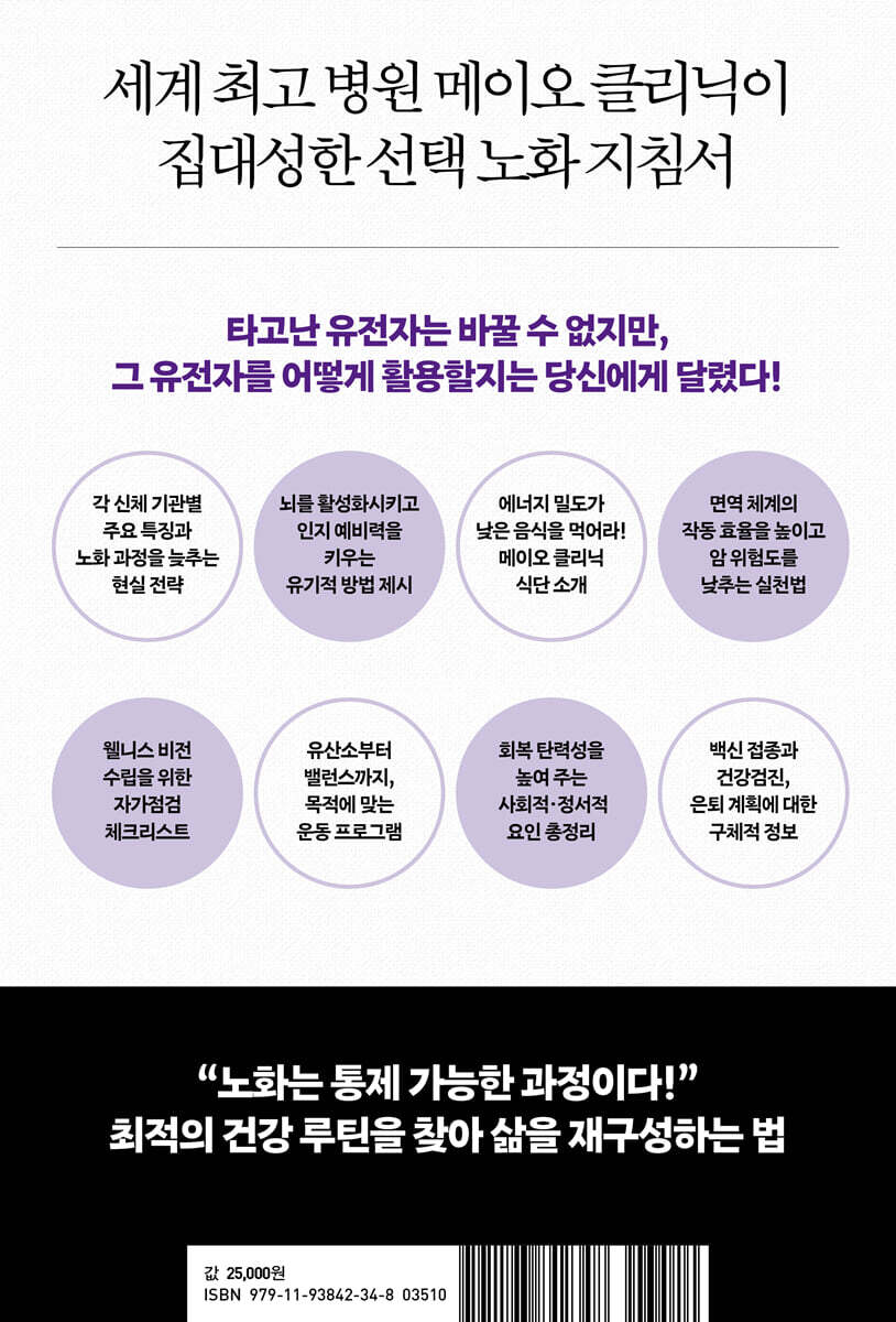 ★ 아마존 노인의학 & 예방의학 1위 ★ 신체 건강부터 정서적·사회적 웰빙까지 아우르는 통합 건강 필독서 최근 뉴스에 따르면, 한국인의 기대수명은 83세, 실제 건강수명은 73세라고 한다. 원하든 원하지 않든 평균 83세까지 살 것으로 예상되는데, 이는 약 10년 이상을 각종 질병에 시달리거나 거동조차 힘들 만큼 노쇠한 상태로 보내야 한다는 뜻이다. 생애 마지막 10년~15년을 어떻게 보낼지에 대한 걱정과 두려움이 늘면서 건강하게 나이 드는 법에 대한 관심도 더욱 커지고 있다. 예전에는 단순히 암이나 치매 같은 특정 질환을 걱정했다면, 이제는 좀 더 포괄적으로 아프지 않고 활력 넘치는 건강한 몸을 추구하게 된 것이다. 그런 맥락에서 세계 최고 병원 메이오 클리닉은 신체적 건강뿐만 아니라 정서적·사회적 건강까지 고려해 삶의 질을 관리하는 것으로 유명하다. 글로벌 시사 매거진 《뉴스위크》가 선정한 세계 최고 병원에 7년 연속 1위로 선정된 메이오 클리닉은, 이건희 전 삼성 회장이 쓰러졌을 때, 우리나라 의료진이 협진을 요청하면서 잘 알려진 병원이기도 하다. 이 책은 그런 메이오 클리닉 노화 센터의 전방위적 건강법을 국내 최초로 소개하는 노화 예방 지침서이다. 출간 즉시 미국 아마존에서 노인의학 1위, 예방의학 1위를 찍은 베스트셀러이며, 각종 신체 질환부터 인지 건강, 정서 건강 등을 아울러 점검할 수 있도록 통합 건강을 다루고 있다. “선택 노화는 어떻게 이루어지는가?” 신체 기능 감소율과 질병 위험도 관리 전략으로 노쇠와 손상 없이 누리는 삶 그렇다면 선택 노화는 어떻게 이루어질까? 책의 저자인 메이오 클리닉 코고드 노화 센터 소장은 “건강한 노화란 누적되는 건강 문제의 위험도를 낮추기 위해 되도록 건전하게 생활하며, 일부 제약이 있더라도 삶을 즐길 수 있도록 좋은 기분을 유지하는 것”이라고 정의한다. 이를 위해서 두 가지 신체 건강 전략을 제안한다. 하나는 노화의 메커니즘을 이해하고, 나이 들면서 찾아오는 자연스러운 변화와 조기에 잡아야 할 비정상적인 징후인지를 구별해 적절히 대응하는 질병 위험도 관리 전략이다. 위험한 질환일수록 초기에 발견해서 대응하는 게 중요하지만, 많은 사람들이 나이 들면 다 그런 거라는 생각으로 적정 시기를 넘겨 병을 키우곤 한다. 예를 들어 나이 들면 청력이 나빠지는 게 당연하다고 생각해서 대수롭지 않게 넘기는 경우가 많은데, 한 연구에 따르면 중년기에 청력 소실을 치료하지 않은 사람들은 치매에 걸릴 위험도가 더 높다고 한다. 이러한 위험성은 청각장애가 정보를 부호화하고 기억하는 뇌의 능력에 악영향을 미친다는 과학적 사실로 뒷받침된다. 다른 하나는 나이 들수록 저하되는 신체 기능을 적절히 관리해서 신체 기능 감소율을 낮추는 전략이다. 예를 들어 기본적인 신체 기능은 30세 이후 매년 약 1~2% 비율로 감소하기 시작한다. 이는 노화 과정에서 부인할 수 없는 사실이다. 하지만 운동을 하면 이러한 기능 감소율을 1년에 약 0.5%로 늦출 수 있다. 즉, 신체 활동을 전혀 하지 않는 사람은 90세가 되면 신체 기능의 약 70%를 잃는 반면, 규칙적으로 운동하는 사람은 90세가 되면 신체 능력의 30%만 잃는다. 운동뿐만 아니라 식단, 수면, 회복 탄력성, 목적의식, 사회적 연결성 등도 신체 기능 감소율에 영향을 끼친다. 책은 이렇게 노쇠와 질병으로부터 내 몸을 지키기 위해 반드시 알아야 할 정보를 신체 각 기관과 주제별로 나누어 소개해, 선택 노화의 단단한 틀을 마련한다. 기대수명과 건강수명의 격차를 없애려면, 최적의 건강 루틴을 찾아 삶을 재구성하라! 신체 기능 감소율과 질병 위험도 관리 전략은 삶에 전 영역에 걸쳐 일어나는 선택 및 습관과 연결되어 있다. 즉, 일상에서 이 전략들을 제대로 활용하려면 나에게 맞는 최적의 건강 루틴을 찾아 삶을 재구성할 필요가 있다. 그런 까닭에 대부분의 건강서들이 식단이나 운동, 뇌건강, 비만 등 특정 주제를 집중적으로 다루고 있는데 반해, 이 책은 삶의 재구성에 포커스를 두고 건강수명을 위해 알아야 할 정보를 삶의 전 영역에 걸쳐 짚어내고 있다. 먼저 신체 각 부위의 노화가 어떻게 이루어지고 왜 질병이 생기는지, 어떻게 관리해야 하는지를 자세히 소개한다. 신체 기관별 주요 특징과 노화 과정을 늦추는 현실적인 전략을 소개할 뿐만 아니라, 뇌를 활성화시키고 인지 예비력을 키우는 유기적 방법을 제시한다. 그다음 목적에 맞는 운동 프로그램을 짤 수 있도록 유산소부터 밸런스 운동까지 한 번에 소개하고, 과 메이오 클리닉에서 실제 활용하고 있는 식단 짜기의 원칙을 소개한다. 또한 생활 전반에 걸친 자가점검 체크리스트를 제시하고, 회복 탄력성을 높여 주는 사회적·정서적 요인을 정리해, 몸과 마음을 위한 웰니스 비전을 세울 수 있도록 돕는다. 식단, 운동, 인간관계, 목적성 등 건강수명을 위해 챙겨야 할 지침과 실천법을 구체적으로 점검하다 보면, 우리의 개별적인 선택이 건강수명 전반에 어떤 영향을 미치는지를 유기적으로 살펴볼 수 있게 될 것이다. 이제 몸, 마음, 영혼을 아우르는 건강 최적화 플랜을 세워 보자. |