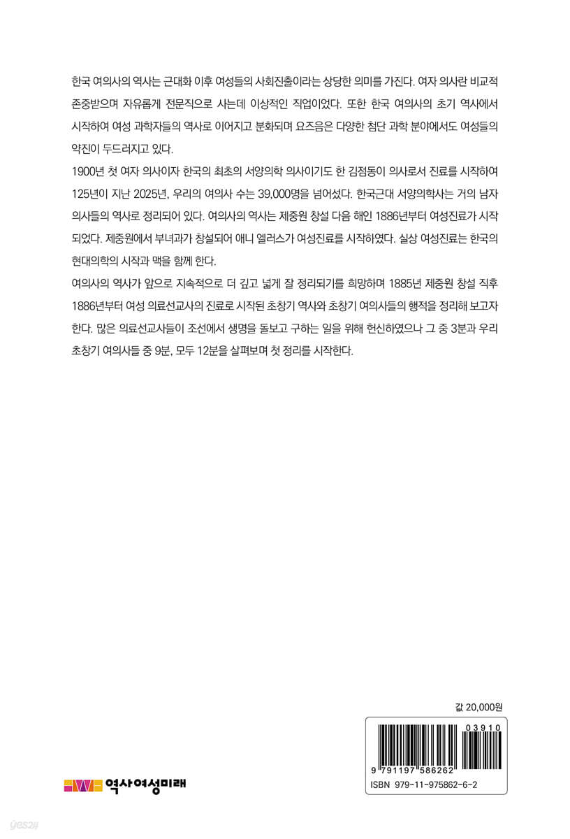 --- p.5 1886년의 의사 스크랜튼의 어머니인 스크랜튼 여사가 설립한 ‘이화학당’과 1887년 엘러스 의료선교사가 설립한 ‘정동여학당’은 이렇게 시작되었다. 내외법에 의해 자신의 능력을 계발하지 못하고 활동 범위가 가정 내에 한정되어 있던 여성들이 밖으로 활동 영역을 넓히는 계기가 되었다. --- p.23 여권통문은 우리나라 최초의 한국여성인권선언서다. ‘여권통문(女權通文)’, 여성인권선언문에는 명시적으로 ‘권리’라는 단어가 사용되었다. 교육권, 노동권(경제활동 참여권, 직업권), 정치참여권(참정권,정치권) 등 크게 3가지 권리에 대한 주장을 담고 있다. --- p.26 1970년부터의 의대 입학생 성별분포를 살펴보면 여학생의 의대 입학 비율 증가 경향은 더 두드러진다. 다음 통계에서 나타나듯이 1998년까지는 의대의 여학생이 30%를 못 미치는 상황이었으나 여학생의 비율은 이미 20여 년간 30% 이상에 달하며 곧 전체 여의사의 비율은 총 의사수의 30%를 넘을 것으로 예상된다. --- p.44 조선초기에는 활인 철학에 입각, 양반 출신들이 의원진출이 두드러지고 특히 태종, 세종시대에는 백성들의 생명을 중시하는 의료제도를 매우 중하게 여기면서 의료제도 및 의학발달이 함께 이루어졌다. 세종시대에는 세종의 의학에 대한 특별한 관심에 힘입어 의녀제도가 발전하였다. --- p.50 1900년 10월 귀국 직후부터 의료현장에서 환자를 바로 진료하기 시작한 김점동(박에스더)은 우리 국민 곁의 진정한 활인의사로 고국에서 의사생활을 시작하였다. 남녀를 막론하고 환자를 돌보는 첫 한국인 서양의사였다. --- p.58 근대 여의사들이 주로 담당했던 분야는 산부인과, 소아과였다. 여의사가 되는 과정도 힘들었지만 사회 편견은 물론, 가정과 일을 양립하는 어려움 역시 매우 컸다. 대단한 의지로 그녀들은 의료활동과 여성운동, 3·1 운동을 비롯한 독립운동, 사회계몽운동에 맹렬한 열정으로 참가하였다. 근대 여의사들은 여성과 미래세대 교육, 여성운동의 최일선에 서서 전문가로서 인술을 펼치며 생명을 구하고 나아가 사회와 나라를 구하는 운동을 펼쳤다. --- p.77 로제타 홀은 1890년 25세 처녀로 당시 미국에서도 흔치 않았던 의료선교사로 조선을 찾은 뒤 43년간 조선 땅에 머물며 조선 여성들의 건강과 교육을 위해 자신의 인생을 헌신한 여성이다. 그는 최초의 한국 여의사 배출을 포함하여 여의사 양성의 지평을 열어 ‘한국 여의사의 어머니’로 존경받고 있다. --- p.106 |