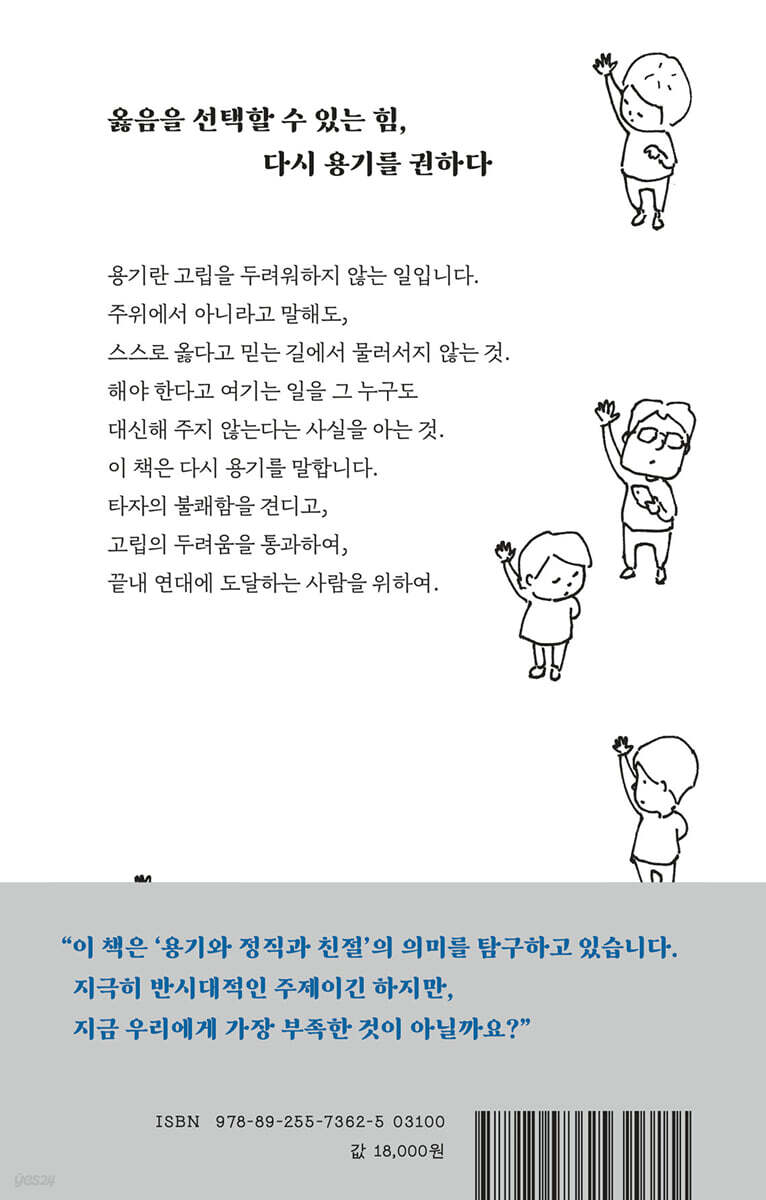 서문 편지 1 첫 번째 편지 용기란 대체 무엇일까요? 첫 번째 회신 용기에 이어지는 덕목은 정직과 친절이었습니다 편지 2 두 번째 편지 용기가 광기와 관련 있는 걸까요? 두 번째 회신 공자는 지는 데 용기가 필요하다고 했습니다 편지 3 세 번째 편지 아버지는 말했습니다, 넥타이 맨 사람은 믿지 말라고 세 번째 회신 믿을 만한 사람을 가려내는 것은 사활이 걸린 문제입니다 편지 4 네 번째 편지 문득 교무실에 불려갔던 기억이 떠올랐습니다 네 번째 회신 직감이 따르는 것에는 깊은 맛이 있습니다 편지 5 다섯 번째 편지 1 그건 한 가수 때문이었습니다 다섯 번째 편지 2 용기 이야기 전후로 세상이 달라보입니다 다섯 번째 회신 1 압박을 견디고 웃는 용기에 감동했습니다 다섯 번째 회신 2 지성은 물음에 닿을 때 활성화됩니다 편지 6 여섯 번째 편지 용기가 사라진 시대에는 무슨 일이 생길까요? 여섯 번째 회신 현대인은 심술궂어졌습니다 편지 7 일곱 번째 편지 사회가 각박해지지 않는 방법은 무엇일까요? 일곱 번째 회신 1 정직에는 지성적, 감성적 성숙이 필요합니다 일곱 번째 회신 2 정직하려면 자신에게서 벗어나야 합니다 일곱 번째 회신 3 친절한 마음은 ‘측은지심’이며 생각한다고 나오는 것이 아닙니다 편지 8 여덟 번째 편지 돈을 위해 다른 사람이 싫어하는 일을 할 필요가 있을까요? 여덟 번째 회신 감수성을 둔하게 하는 삶은 자멸적입니다 편지 9 아홉 번째 편지 용기라는 말에 반응한 제가 불안했는지도 모릅니다 아홉 번째 회신 마지막으로 용기의 의미를 찾아보도록 하죠 저자 후기 전에 저자 후기 옮긴이 후기 |