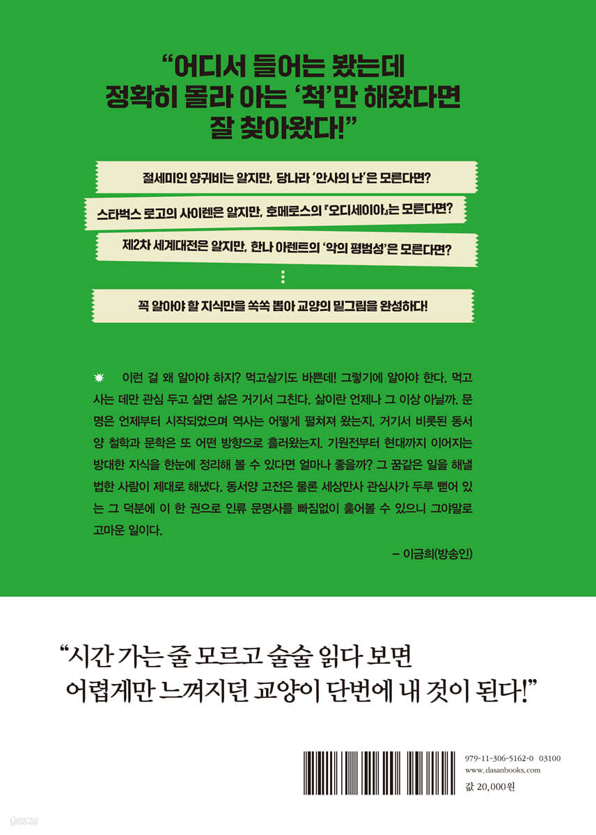 이런 걸 왜 알아야 하지? 먹고 살기도 바쁜데! 그렇기에 알아야 한다. 먹고 사는 데만 관심 두고 살면 삶은 거기서 그친다. 삶이란 언제나 그 이상 아닐까. 문명은 언제부터 시작되었으며 역사는 어떻게 펼쳐져 왔는지, 거기서 비롯된 동서양 철학과 문학은 또 어떤 방향으로 흘러왔는지. 기원전부터 현대까지 이어지는 방대한 지식을 한눈에 정리해 볼 수 있다면 얼마나 좋을까? 그 꿈 같은 일을 해낼 법한 사람이 제대로 해냈다. 동서양 고전은 물론 세상만사 관심사가 두루 뻗어 있는 그 덕분에 이 한 권으로 인류 문명사를 빠짐없이 훑어볼 수 있으니 그야말로 고마운 일이다. - 이금희 (방송인)