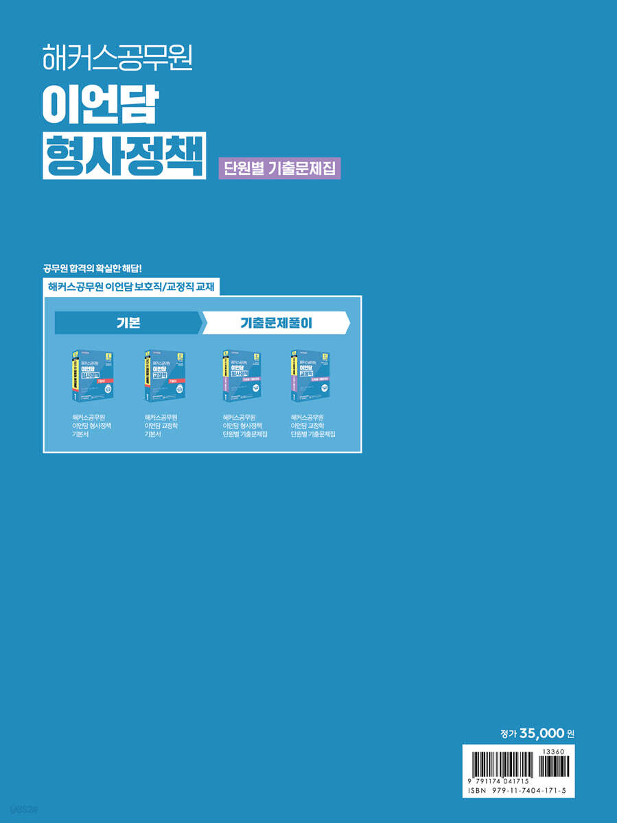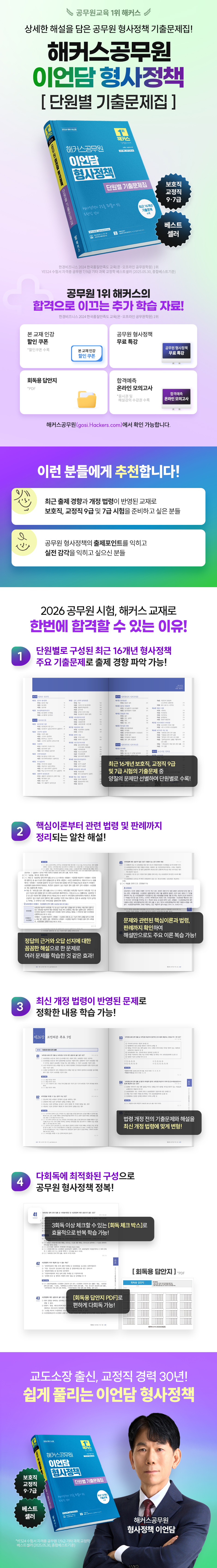 상세한 해설을 담은 공무원 형사정책 기출문제집 [이런 분들에게 추천합니다] 1. 최근 출제 경향과 개정 법령이 반영된 교재로 보호직, 교정직 9급 및 7급 시험을 준비하고 싶은 분들 2. 공무원 형사정책의 출제포인트를 익히고 실전 감각을 익히고 싶으신 분들 [해커스 교재만의 특장점] 1. 단원별로 구성된 최근 16개년 형사정책 주요 기출문제로 출제 경향 파악 가능 최근 16개년 보호직, 교정직 9급 및 7급 시험과 유사개념을 다룬 경찰 범죄학 시험의 주요 기출문제 중 양질의 문제들을 선별하여 단원별로 수록하였습니다. 형사정책의 필수 이론을 다루는 다양한 유형의 문제들을 풀어봄으로써 완벽한 시험 대비가 가능합니다. 2. 핵심이론부터 관련 법령 및 판례까지 정리되는 알찬 해설 (1) 정답의 근거를 명확하게 설명하고 오답 선지까지 상세하게 분석해주는 꼼꼼한 해설을 통해 한 문제를 풀더라도 여러 문제를 학습한 것과 같은 효과를 얻을 수 있습니다. (2) 문제와 관련된 핵심이론과 관련 법령 및 판례까지 확인할 수 있어, 해설만으로도 공무원 형사정책 주요 이론을 복습할 수 있습니다. 3. 최신 개정 법령 반영된 문제로 정확한 내용 학습 가능 법령 개정 전의 기출문제를 최신 개정 법령에 맞게 변형하고 해설에도 반영하여 현재 시점에 맞는 올바른 내용의 법령을 학습할 수 있습니다. 4. 다회독에 최적화된 구성으로 공무원 형사정책 정복 (1) 모든 문제의 번호 옆에 3회독 이상 체크할 수 있는 회독 체크 박스를 제공하여, 자신의 약점과 강점을 명확히 파악하며 효율적으로 반복 학습할 수 있습니다. (2) ‘회독용 답안지 PDF’를 통하여 교재에 직접 답을 체크하지 않고 문제를 여러번 편하게 풀어볼 수 있습니다. |
