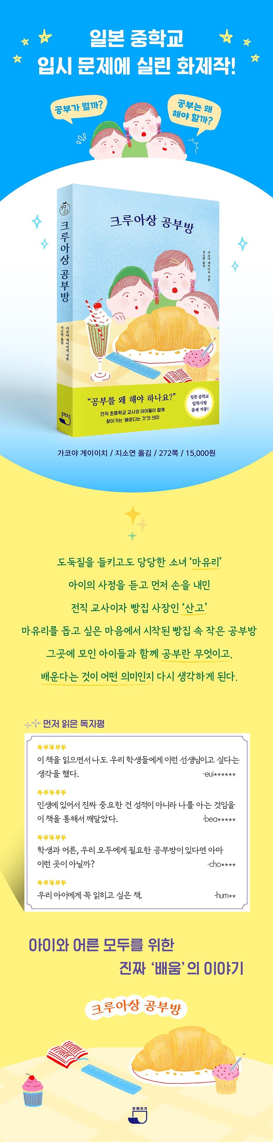 이름하여 ‘크루아상 공부방’! 초등학교 교사였던 구로하 산고는 아들 신지와 고향으로 내려와 아버지의 빵집에서 일하며 지내게 된다. 어느 날 빵집에서 샌드위치 도난 사건이 발생해 범인을 잡게 되었는데, 범인은 바로 초등학교 4학년 마유리, 아들과 같은 학교 여학생이다. 마유리와 이야기를 나누는 사이, 바쁜 어머니가 학교 숙제를 봐주지 않아 힘들어 하고 있다는 사실을 알게 된다. 문득 마음속에 옛 제자의 안타까운 모습이 떠오른 산고는 무료 공부방을 열어 마유리의 숙제를 봐주기로 하고, 마유리 어머니를 만나러 가지만 큰 반대에 부딪히게 된다. “전직 선생님, 숙제를 봐주지 않으면 역시 문제가 될까요?” 도둑질을 들키고도 사과하지 않는 마유리, 딸의 공부를 봐주려는데 고마워하기는커녕 기분이 나쁘다며 함부로 말하는 마유리의 엄마, 아빠를 위해 상황을 전환시키려 노력하는 아들 신지와 친구 류노스케. 꼬여만 가는 상황 속에서도 산고는 무료 공부방에 자꾸 마음이 쓰이는 건 왜일까? 그 속에는 과거에 도움이 되지 못했던 제자에게 속죄하는 마음이 담겨 있었다. 모든 아이의 숙제를 봐줄 수는 없지만 산고는 공부방을 열어 지금 당장 본인이 할 수 있는 일을 해 보는 것만이 속죄의 길이자 전직 교사인 빵집 아저씨가 할 수 있는 일이라고 생각한다. “'배우기 위한 공부’를 할 줄 모르면 세계는 더 이상 넓어지지 않고 정말로 하고 싶은 일을 평생 찾지 못할 수도 있습니다. 설령 찾더라도 실현할 힘이 없을 테고요.”라고 말하는 산고. 산고는 ‘공부의 힘’, ‘배우는 힘’을 터득한다는 것은 행복해지고 인생을 풍요롭게 만들기 위한 원천이 될 거라 믿기에 아이들의 숙제를 봐주는 동시에 공부의 의미를 일깨워 조금 더 나은 세상을 꿈꾸게 하려는 마음으로 무료 공부방을 열고자 생각했다. “공부를 왜 해야 하나요?” 전직 초등학교 교사와 아이들이 함께 찾아가는 ‘배운다는 것’의 의미 우여곡절 끝에 마유리와 신지, 신지의 친구 류노스케까지 합류하게 된 ‘크루아상 공부방’. 숙제뿐만 아니라 뒤쳐진 진도까지, 아이들 한 명 한 명에 맞춘 맞춤형 공부방에서 함께 공부하게 된다. 이상적인 수업의 한 형태를 보여주는 크루아상 공부방은 산고의 곧은 신념의 결과물이다. 장래희망과 꿈이라는 질문에 답하기 어려워하는 아이들에게 산고는 학력을 목표로 삼거나 공부를 위한 공부는 지양하고 “더 넓은 의미에서 내가 뭘 좋아하는지, 뭘 할 때 행복하고 가슴이 설레는지, 자기 자신을 잘 들여다봤으면 좋겠어.”라고 이야기하며 꿈과 목표를 자유롭게 가져보라고 말한다. “학교에서 무엇을 가르치느냐가 아니라, 어떻게 해야 배우는 즐거움을 아이들에게 전할 수 있느냐. 그 점을 더 진지하게 생각하는 시대가 왔다고, 교편을 놓기 전부터 생각했다.”며 공부는 삶을 풍요롭게 하기 위한 힘, 꿈을 이루기 위해 필요한 장치라고 생각하는 산고는 그 신념이 아이들에게 전달되도록 노력한다. 살면서 한 번쯤은 공부는 왜 해야 하는지, 학교는 어떤 역할을 하는지 막연하게 궁금했던 적이 있을 것이다. 특히 학생들의 경우 이유도 모른 채 학습을 강요당하고 있다는 생각에 답답하기도 할 것이다. 《크루아상 공부방》은 학교 시스템 밖에서 바라보는, 조금은 자유로운 시선으로 공부와 학교의 역할을 이야기해 본다. 왜 지금의 학교 시스템이 생겨났는지, 왜 지금의 이 교육과정 속에서 학습하게 되었는지에 대해 작품 속에서 집어보고 생각해 보게 해 준다. 아이들의 고민에서 시작됐기에 가볍게 건드리지만 결코 가볍지 않은 고민을 함께 생각하고 이야기해 볼 수 있는 좋은 기회를 선사한다. |