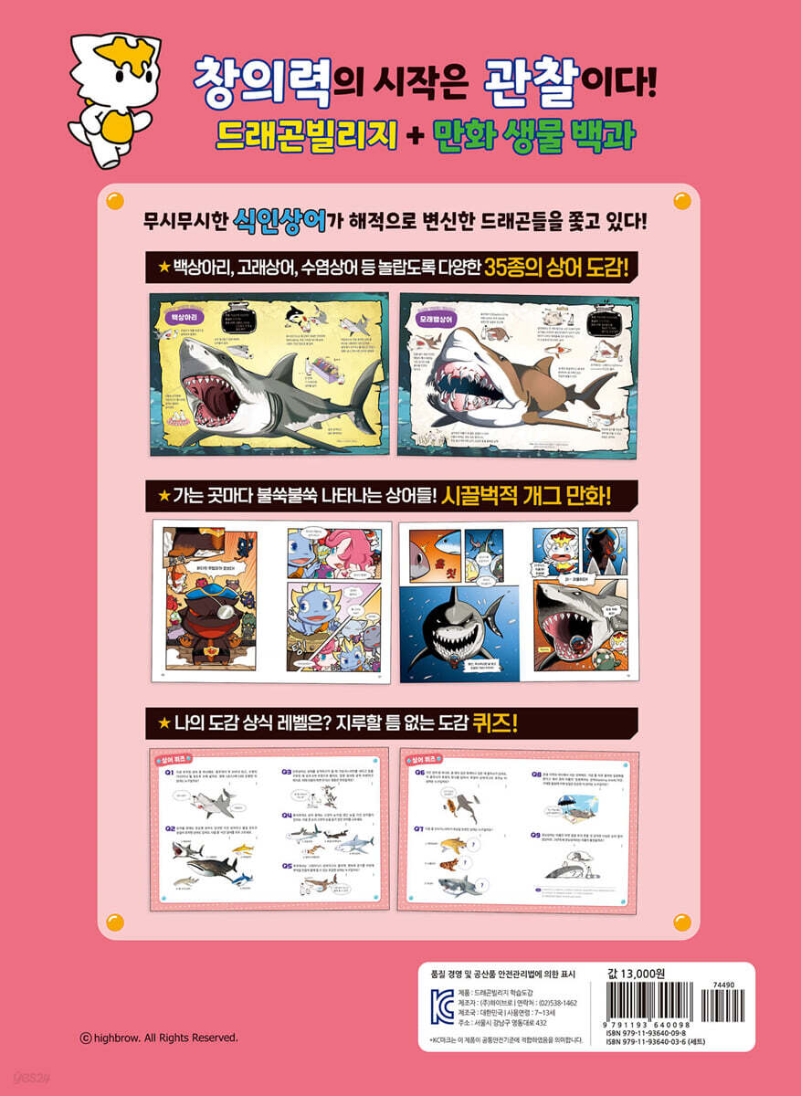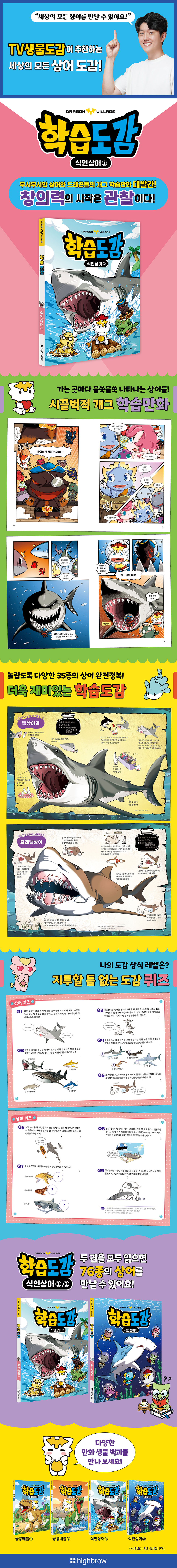 해적이 된 드래곤들이지만 그보다 무시무시한 식인 상어가 그들을 끊임없이 쫓아온다! 잡으냐 잡아먹히느냐! 드래곤과 상어의 긴장감 넘치는 개그 학습 만화. 놀랍도록 다양한 상어들을 만나 보자! ● 손바닥만한 상어부터 20m가 넘는 대형 상어까지 총 망라! ● 쫓고 쫓기며 예상을 깨는 기막힌 반전, 요절복통 개그 만화! ● 24마리의 개성이 너무나도 뚜렷한 사고뭉치 드래곤 캐릭터들! ● 위트 넘치는 그림으로 재미있게 배우는 상어 깨알 상식! 재미있는 학습만화와 시각을 사로잡는 유익한 도감의 콜라보! 사람을 공격하는 식인 상어인 백상아리를 비롯하여 악상어, 마귀상어, 흑점얼룩상어, 수염상어, 아구상어 등 지구상에 살고 있는 놀랍도록 다양한 상어들을 한 눈에 살펴본다. 드래곤 캐릭터들이 기상천외한 상어를 만날 때마다 펼쳐지는 개그 만화는 상상력에 날개를 달아 준다. 무시무시한 식인 상어에 쫓기는 드래곤들을 보며 평소 책에 관심이 없거나 다소 산만한 아이들까지 사로잡으며 집중력을 높인다. '드래곤빌리지 학습도감' 시리즈는 초등학교 교육 과정에서 필수적인 다양한 주제들을 다룬다. 〈공룡배틀〉에 이어 출간된 〈식인상어〉에서는 초등 저학년들에게 특히 인기 있는 ‘상어’를 주제로 하여 재미있게 구성하였다. |