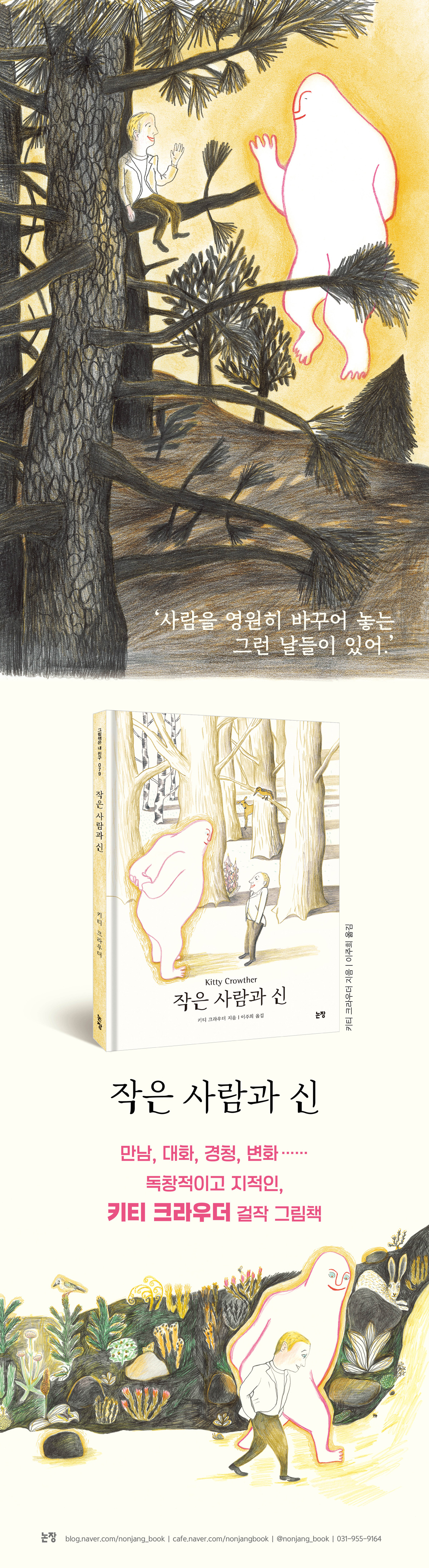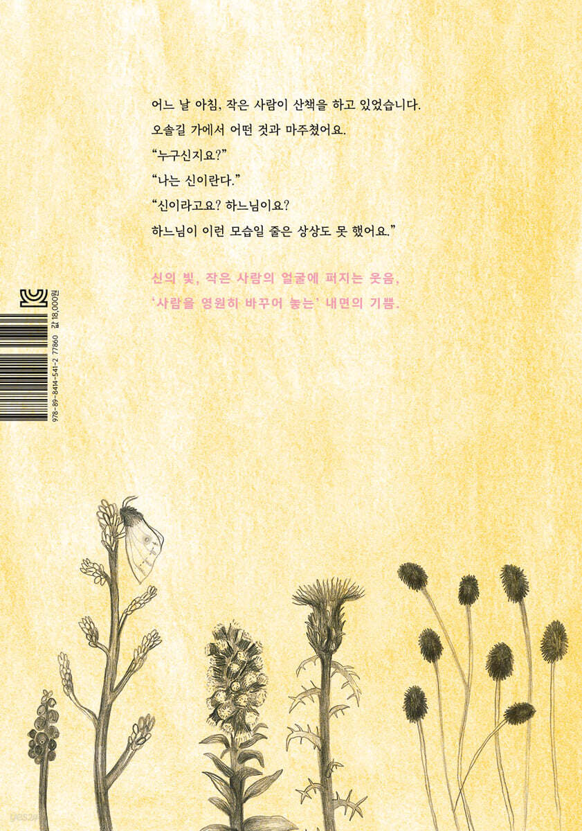 작은 사람은 하느님을 만난 걸까? 아니, ‘하늘의 별만큼, 심지어 그보다 조금 더 많은’ 신들 중 하나인 신을 만난 거다. 따뜻하게 빛나는 오라로 둘러싸인. 이번에는 ‘신과 인간’의 만남이다. 눈부신 신, 시적인 분위기, 친숙하고 유머러스한 대화, 어린이 문학이 거의 탐색하지 않은, 독창적이고 지적인 걸작이다. 일단 이 신은 우리가 생각하는 하느님이 아니고 어디에나 존재하는 그런 신이다. 흔히 생각하는 절대자의 엄격성이나 모든 걸 다 할 줄 아는 전지전능을 지니지 않았다. 어떤 선입견도 주입식 설득도 없는, 관심과 호의가 가득한 신과의 산책은 유쾌하고 유익하다. 실파를 넣은 오믈렛을 먹고 물놀이를 하고 물 위를 걷고 좋아하는 걸 이야기하고…… 둘은 새로 사귄 친구처럼 자연스럽고 편안하다. 신은 자유자재로 몸을 바꾸고 하늘로 날아오르는 능력을 가졌지만 의외로 나무 타기나 헤엄을 칠 줄 모른다. 오믈렛이 뭔지도 모른다. 작은 사람 덕분에 오믈렛을 먹고 물놀이를 하고 새로운 경험을 쌓는 신. 작은 사람은 변신술을 모르고 하늘을 날 줄 모르지만 그래도 헤엄을 잘 치고 나무 타기를 잘하고 오믈렛을 맛있게 만들 줄 안다. 신도 모르는 것이 있고 작은 사람에게 배우는 것이 있다! “너는 테오지. 신이라는 뜻이란다. 알고 있었니?” 대화는 단순하지만 깊은 의미를 함축하고 있다. 경청과 이해, 발견의 시간은 상대를 넘어 나 자신을 만나는 성찰의 시간이기도 하다. 자신이라는 한 존재에 담긴 깊은 사랑까지. 주변을 밝히는 신의 빛, 차츰 작은 사람의 얼굴에 퍼지는 웃음은 ‘사람을 영원히 바꾸어 놓는’ 어떤 순간에 탄생한 내면의 기쁨이다. 우리는 이렇게 자기 우주의 주인이 된다! ■ 한 장면 한 장면 모두 다 의미심장하고 아름답다 신의 입에서 나오는 숨결에 민들레 홀씨가 나풀나풀 사방으로 날아간다. 신의 몸은 주황빛 오라가 둘러싸고 있다. 신을 더욱 빛나게 하는 후광이다. 친절하고 어딘지 익살스러운 신과 작은 사람의 대화가 숲에서 집으로 연못으로 나무 위로 이어질 때, 나뭇가지에서는 새들이 지켜본다. 나비가 날고 사슴이 바라본다. 바위 뒤에는 토끼가 나무에는 다람쥐가 곳곳에 곤충이 돌아다닌다. 온 세상의 중심, 모두가 신과 작은 사람을 주목하며 응원하는 것만 같다. 나비, 벌, 멧돼지…… 갖가지 풀들에 나뭇잎에 동물들에 살짝살짝, 밝은 주황빛은 어디에나 있다. 제각각 신의 숨결이 닿아서일까? 혹은 모두 다 신성을 지닌 걸까? 모든 동물과 식물은 주황빛을 공유하며 마침내 연못가 작은 사람의 집으로 이어지고, 환한 빛은 점점 퍼져 나간다. 드디어 바위에 앉은 작은 사람에게도. 작은 사람의 머리를 쓰다듬는 신, 집으로 돌아온 작은 사람에게도 주황빛이 빛난다! 그런데 이 커다란 하얀 신에게는 작은 비밀이 있다. 작은 사람에게 오믈렛이 뭔지 모르고 헤엄칠 줄 모른다고 했는데, 아내 신과 얘기할 때 보면 원래 알고 있던 건지, 새로 알게 된 건지 모호하다. 작은 사람 역시 혼자 사는지 보호자가 있는지 분명하지 않다. 하지만 그건 별 문제가 되지 않는다. 그저 독자가 이렇게 생각하거나 저렇게 생각하거나 그런 신비를 남겨 주는 것이 이 책과 어울린다. 신이 나오는 이야기니까! 작은 사람을 영원히 바꾸어 놓은 만남. 이 그림책을 읽는 경험이 우리의 세계관도 변화시키게 될까? 저는 각 요소(사물, 사람이나 자연)가 정말 살아 있다고 생각하기를 좋아해요. 《작은 사람과 신》에서 어떤 것은 형광 주황빛 후광으로 둘러싸여 있는데, 그것이 살아 있다는 것을 보여 주기 위한 거예요. (중략) 저는 그저 단 하나의 신이 아니라 여럿이 존재하기를 바랐어요. 그 신은 요리도 할 줄 모르고 나무에 오르거나 수영도 할 줄 모르고…… 마지막에는 신이 그걸 다 할 줄 안다는 걸 알게 되지만요! 하지만 이 책은 자기 길을 찾는 일이나, 큰 사람과 작은 사람 사이의 관계에 대해서도 이야기하고 있어요. __키티 크라우더 |