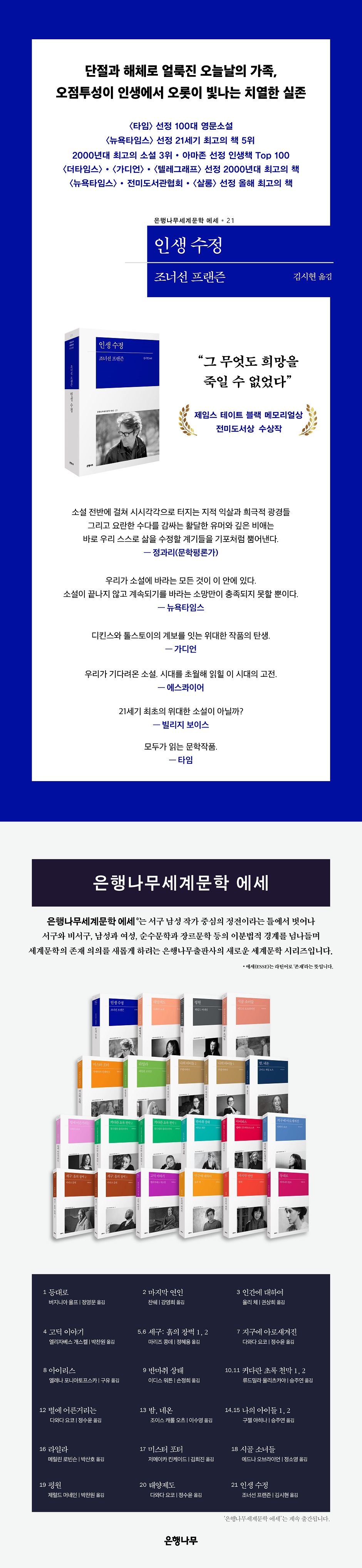 디킨스적 기본으로 회귀하다 문제는 돈과, 돈 없는 삶의 치욕이었다. 그의 시야에 들어오는 모든 사람과 핸드폰과 양키 캡 모자와 SUV는 하나같이 고문이었다. 그가 탐을 내거나 시기하는 것은 아니었다. 하지만 돈 없는 그는 제대로 된 사람이라 할 수 없었다. _158면 이 소설이 발표된 직후 미국 문단은 큰 충격을 받았다. 오늘날의 전형적인 소설 트렌드와 너무나 동떨어진 소설이 성공을 거뒀기 때문이다. 이 소설은 개인의 목소리와 서브 문화, 특정 집단에 집중하는 오늘날의 트렌드에 영합하지 않는 모습을 보여주고 있다. 이 작품은 서브 문화가 아니라 문화 그 자체를 다루고, 소(小)세계가 아니라 세계 전체를 다루고 있다. 우리가 세계를 살아가는 모습을 와이드샷으로 한꺼번에 담아내는 것이다. 문학평론가 정과리 교수는 “시간의 마모와 사회의 타락으로 붕괴하는 한 세계”에서 살아가는 인물들의 삶을 통해 독자들이 “거품 같은 현대성”을 만나게 된다고 지적한다. 이들 인물은 어두운 과거가 있는 범죄자나 신비로운 힘이 있는 영웅 혹은 수수께끼를 풀어내는 천재가 아니라, 우리와 다를 바 없는 평범한 사람들이다. 그래서인지 이 작품은 전형적인 21세기 소설이라기보다는 19세기 소설 같은 느낌을 주고, 혹자가 토마스 만의 《부덴브로크가의 사람들》을 언급한 것도 아마 그 때문일 것이다. 작가가 9년 동안 심혈을 기울여 발표한 《인생 수정》은 내면으로 침잠하는 지리멸렬한 이야기가 주를 이루는 최근의 문학 트렌드를 인간 사회 전체를 조망하는 거대 서사로 가져가려는 시도라고 볼 수 있다. 〈살롱〉이 미국 작가 중 “매우 고유한 존재”라고 표현한 프랜즌의 《인생 수정》은 현대 미국 문학의 경향을 디킨스의 전통을 잇는 미국 문학의 기본으로 되돌려놓았다는 평을 듣고 있다. “모두가 읽는 문학 작품” 시대의 문학적 현상으로 자리매김하다 〈타임〉은 이 작품을 가리켜 “모두가 읽는 문학 작품이라는 희귀한 존재”이자 시대의 “문학적 현상”이라고 표현했다. 이는 돈 드릴로, 토마스 핀천, 데이비드 포스터 월리스와 함께 오늘날 미국을 대표하는 작가로 일컬어지는 조너선 프랜즌의 ‘순문학 작품’이 미국 내에서만 160만 부, 전 세계적으로 300만 부 이상이 판매된 것을 가리키는 말이다. 순문학이 대중으로부터 외면받는 오늘날의 현실을 감안한다면, 이는 말 그대로 경이적인 ‘현상’이라고밖에는 말할 수 없을 것이다. 이 소설이 거둔 대중적 성공은 오프라 윈프리 북클럽 선정에 힘입은 인지도 향상에 어느 정도는 기인하고 있겠지만 그것만이 전부라고 볼 수는 없다. 《인생 수정》이 전 세계인의 공감을 얻을 수 있었던 것은 무엇보다도 이 작품이 ‘흡인력 있는’ 소설이고(프랜즌은 1996년에 발표한 기고문에서 오늘날 순문학 소설이 죽어가고 있지만, 할리우드 문화에 익숙해진 독자들의 눈조차 떼지 못하게 만드는 ‘흡인력 있는’ 사회적이고 문학적인 소설을 쓰는 작가가 아직 남아 있다고 역설한 바 있다. 이는 프랜즌 본인에게도 해당하는 말일 것이다), ‘인간’ 그 자체에 대한 분석이며, 누구나 공감할 수 있는 한 가족의 이야기를 통한 현대사회의 조망이기 때문이다. 현대 미국판 《부덴브로크가의 사람들》 사회 전체를 조망하는 거대한 가족 드라마 인류는 다른 종을 몰살하고, 대기를 온난화하고, 인간과 닮은 것들을 전반적으로 파괴할 기회와 지구를 지배할 권리를 가졌지만, 그 대가를 지불해야 했다. 유한하고 구체적인 동물의 몸을 지녔으면서 무한을 인식하고 스스로 무한하기를 바라는 뇌를 가지고 있는 것이다. _675면 소설은 한때 가부장적인 독재자였으나 이제는 파킨슨병에 걸려 힘없는 노인으로 전락한 앨프리드, 남편의 압제에 눌린 채 1년 내내 크리스마스에 대한 희망으로 자신을 지탱하는 이니드, 그리고 이들의 세 자녀로 이루어진 램버트 가족의 이야기를 다루고 있다. 앨프리드와 이니드의 자녀 개리와 칩, 데니즈는 부모의 불행이 드리워놓은 어두운 그늘에서 벗어나기 위해 끝없이 발버둥치는 존재이다. 가정불화와 우울증에 시달리는 큰아들 개리, 현실에 적응하지 못해 도망에 도망을 거듭하는 작은아들 칩, 자신의 진정한 욕망을 계속 억누르고 부정하는 딸 데니즈. 오랜 소통 단절로 가족으로서 기능하지 않고 있던 램버트 가족은 앨프리드의 파킨슨병을 계기 삼아 모이게 되고, 가족의 갈등은 이니드가 1년 내내 기다렸던 크리스마스 파티에서 절정을 이룬다. 과거와 현재를 오가며 펼쳐지는 가족 구성원 각자의 드라마에는 다양한 사회적 요소들이 자리하고 있다. 오랜 세월 자신을 소모하고 억압했던 앨프리드의 이야기를 통해 거대 철도 회사의 붕괴를, 순간의 실수로 대학 사회에서 쫓겨나 리투아니아로 도망친 칩의 이야기를 통해 찬란했던 동구권 국가의 몰락을, 지금껏 억눌러오던 여성에 대한 갈망을 해방한 데니즈의 이야기를 통해 불륜과 동성애를 그려내는 것이다. 작가는 램버트가의 가족사를 통해 21세기의 삶과 문화라는 거대한 캔버스 안에서 신자유주의, 소비 지향적 문화, 대학 사회의 비리 등을 광범위하게 분석하는